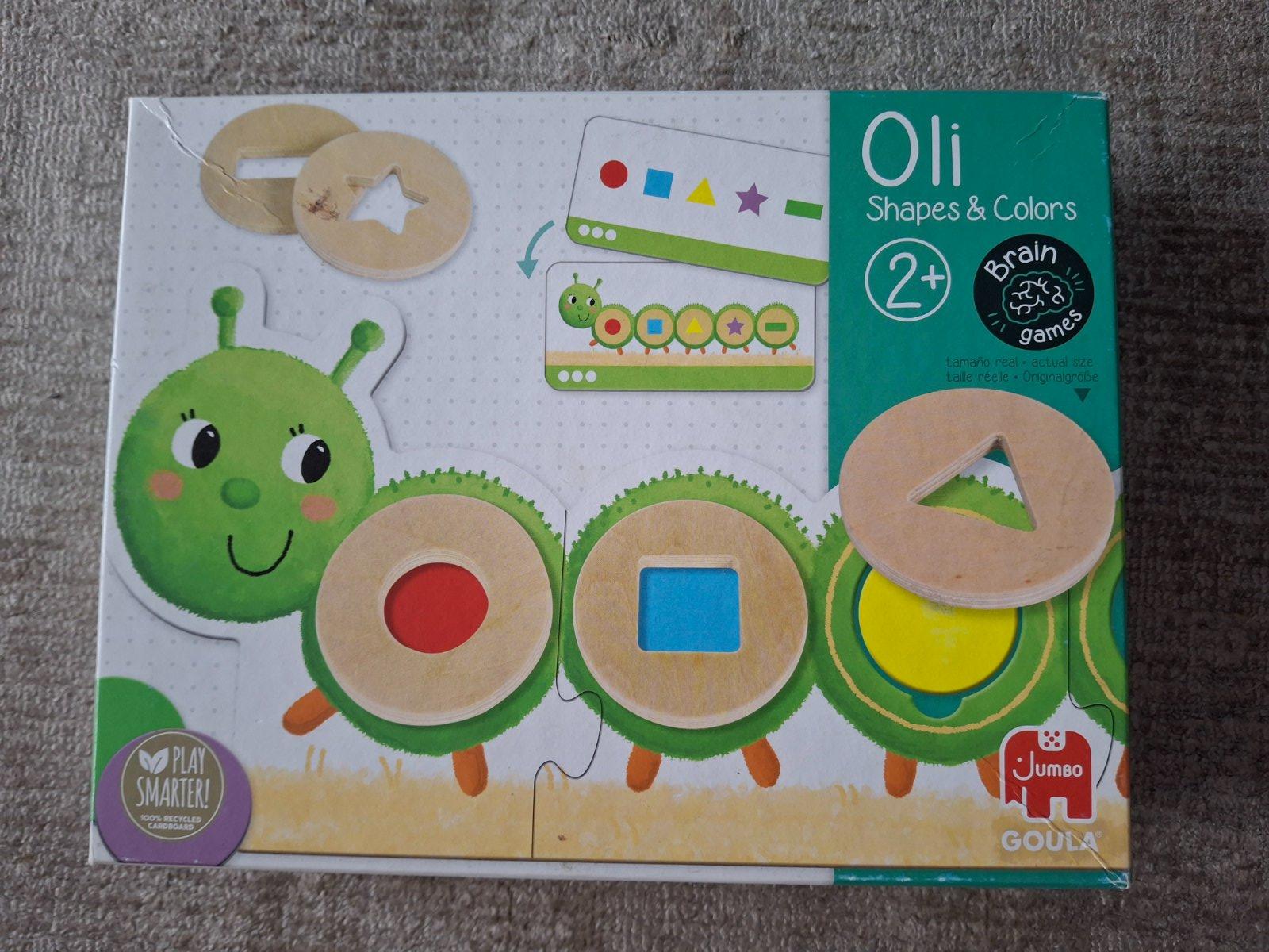 Predam hru Oli - tvary a farby, vhodnu pre deti od 2 rokov. Dieta sa snazi priradit spravnu farbu a tvar podla predlohy. Hra je vo vybornom stave ako nova. Iba vrchny obal krabice je v rohoch mierne pokrceny ( vid foto )