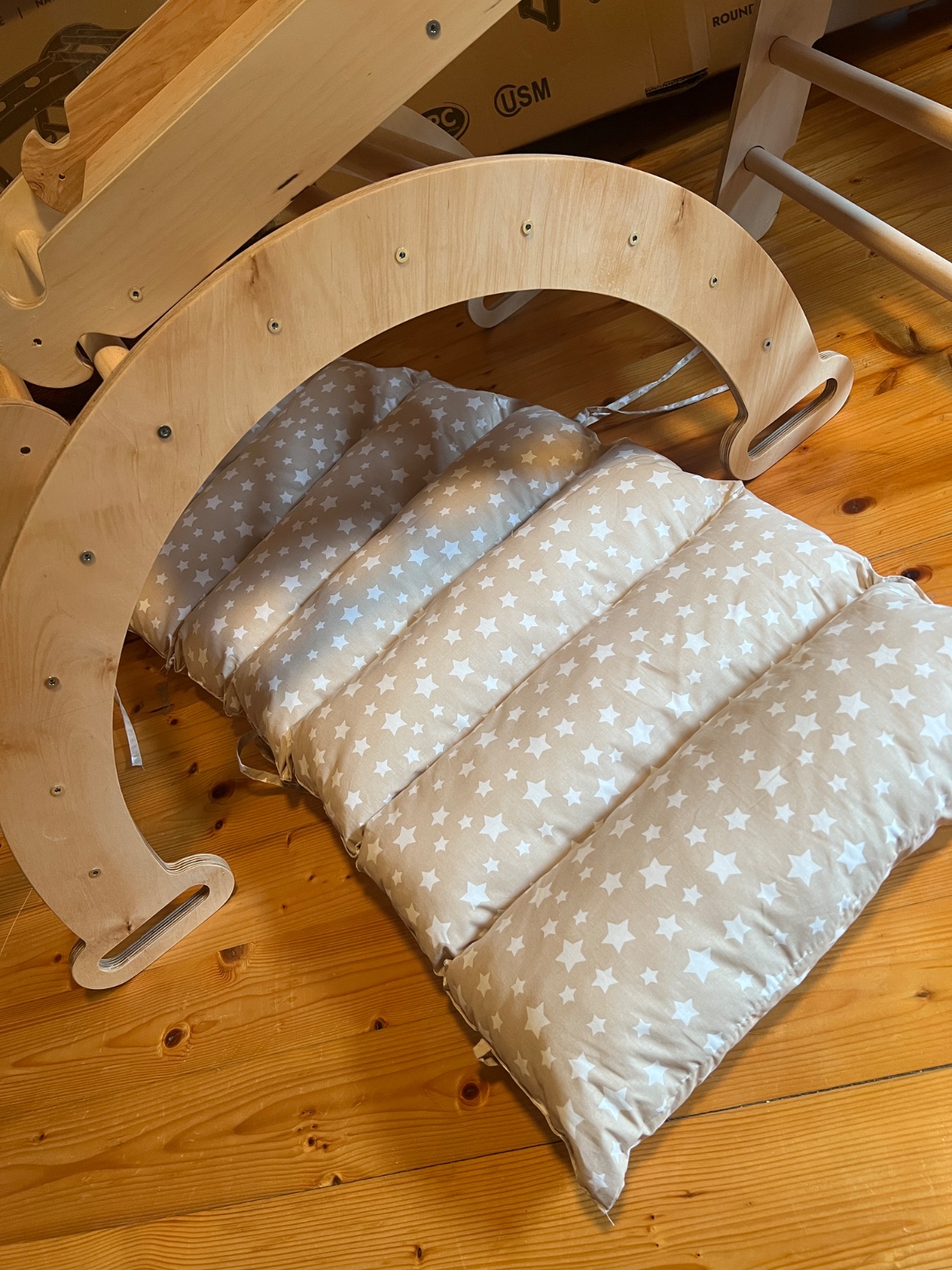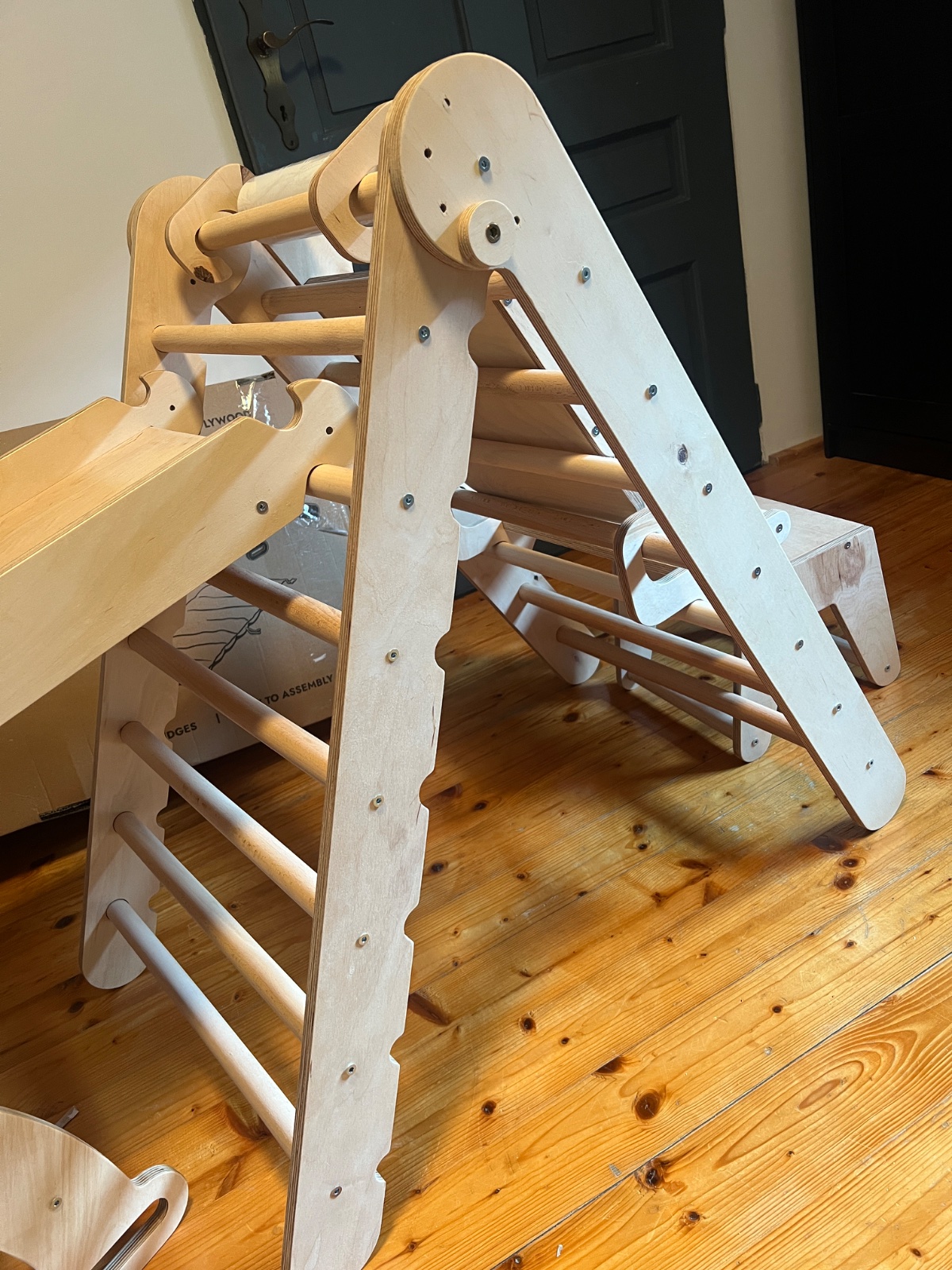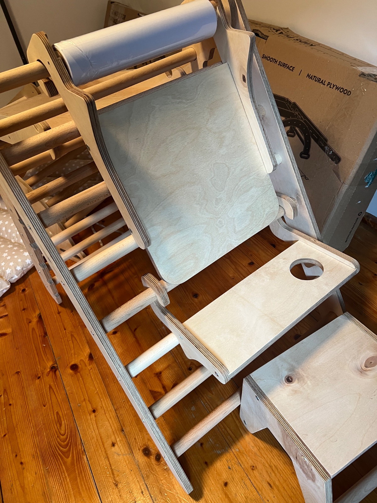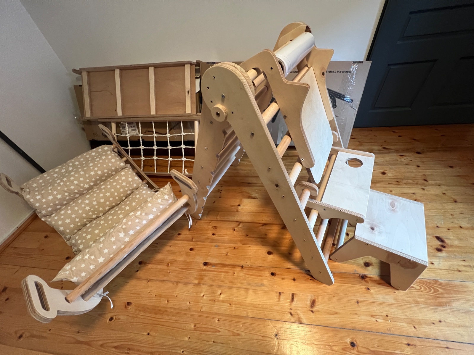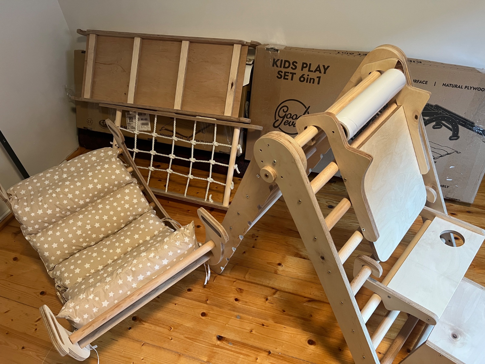 Montessori lezecká zostava 6 v 1: Trojuholníkový rebrík + Oblúk / Húpačka + Šmýkačka / Rampa + Sieť + Vankúš + Umelecký kútik na kreslenie