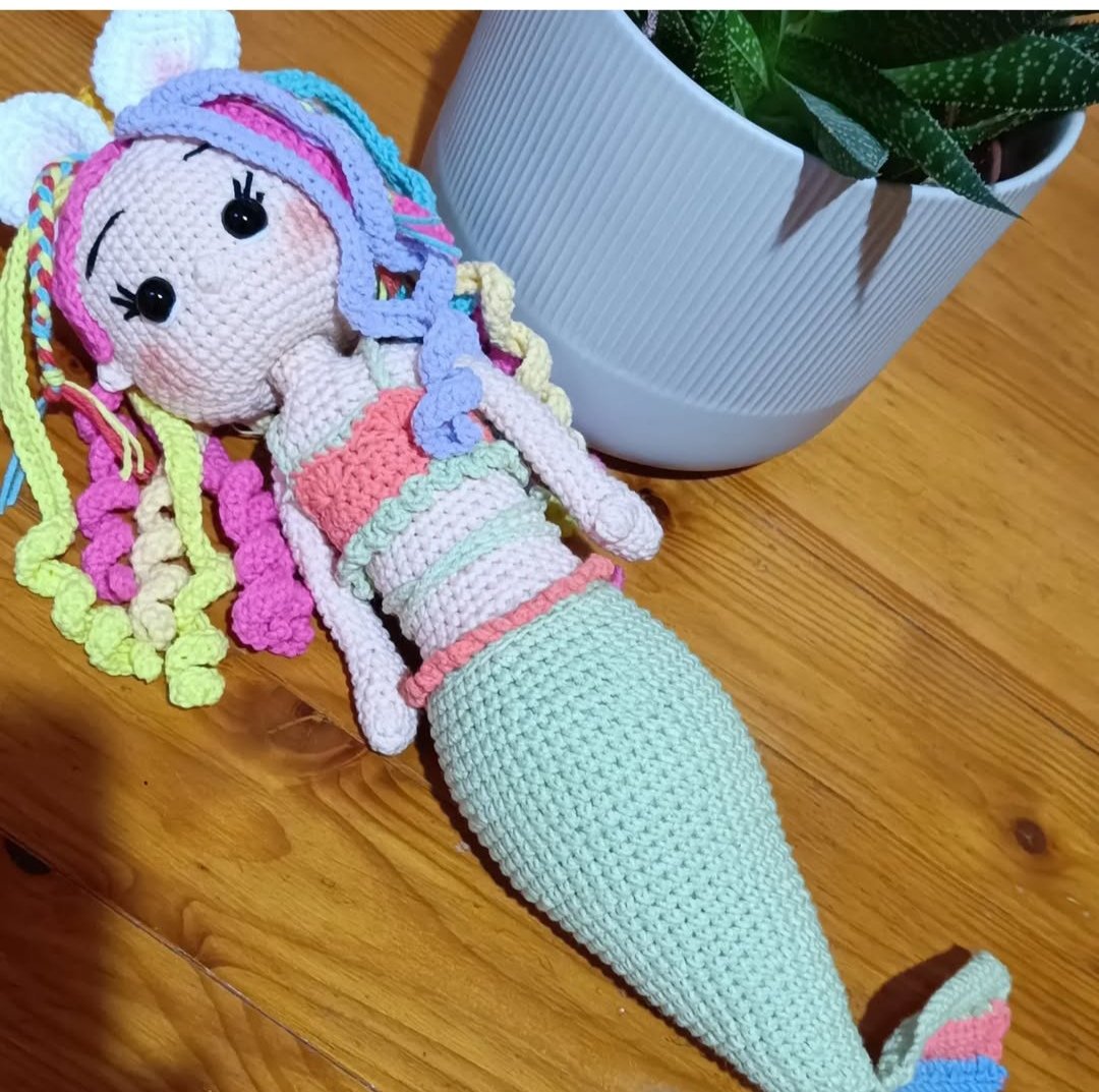 Krásna hačkovaná morská panna pre malé slečny. Vyrobená je z vlny jeans art plnená dutým vláknom. Bábika je vo veľkosti asi 30 cm.