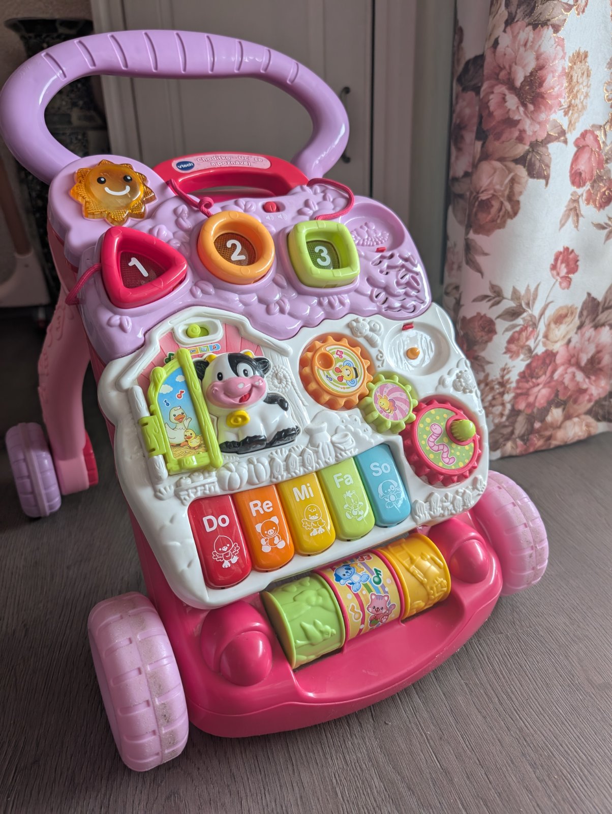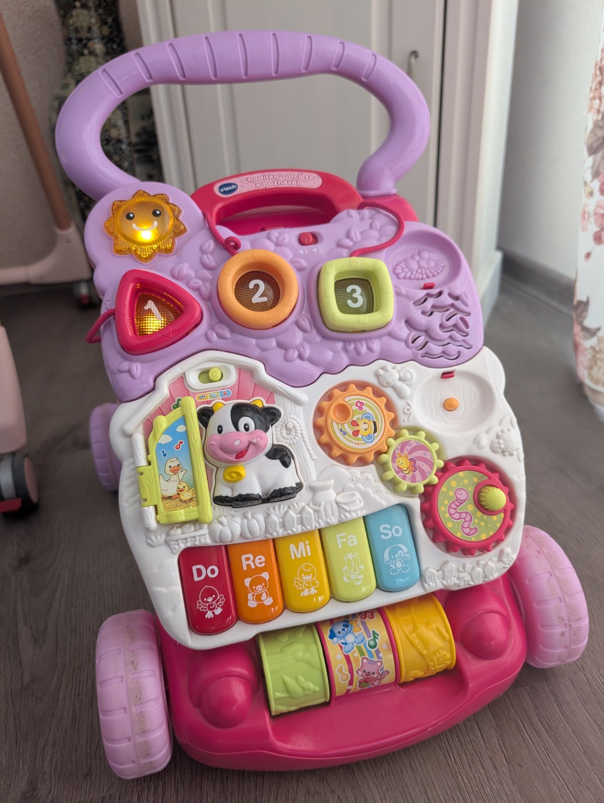 Predám zachovalé chodítko.Pri tlačení kravička otvára ústa.Su tam zábavne dieliky na stláčanie, točenie