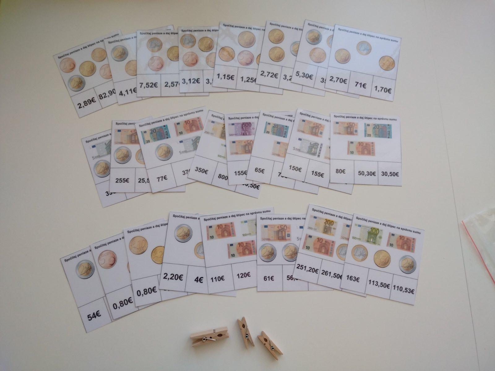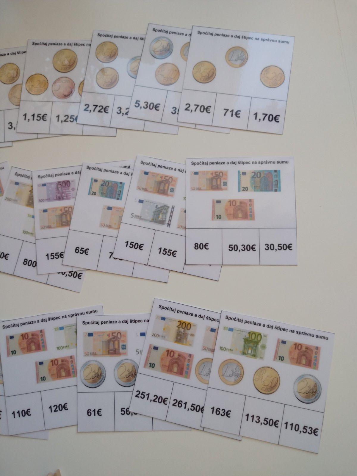 Súbor zalaminovaných kartičiek, ktoré slúžia na hravé precvičovanie matematiky a spoznávanie peňazí: dieťa má za úlohu spočítať celkovú hodnotu peňazí (mincí a bankoviek) zobrazených na kartičke a označiť správny výsledok pripnutím dreveného štipca na jedno z čísel v spodnej časti karty. Spolu je to 24 kartičiek, na zadnej strane je možnosť kontroly správneho priradenia. Nové, nepoužité.