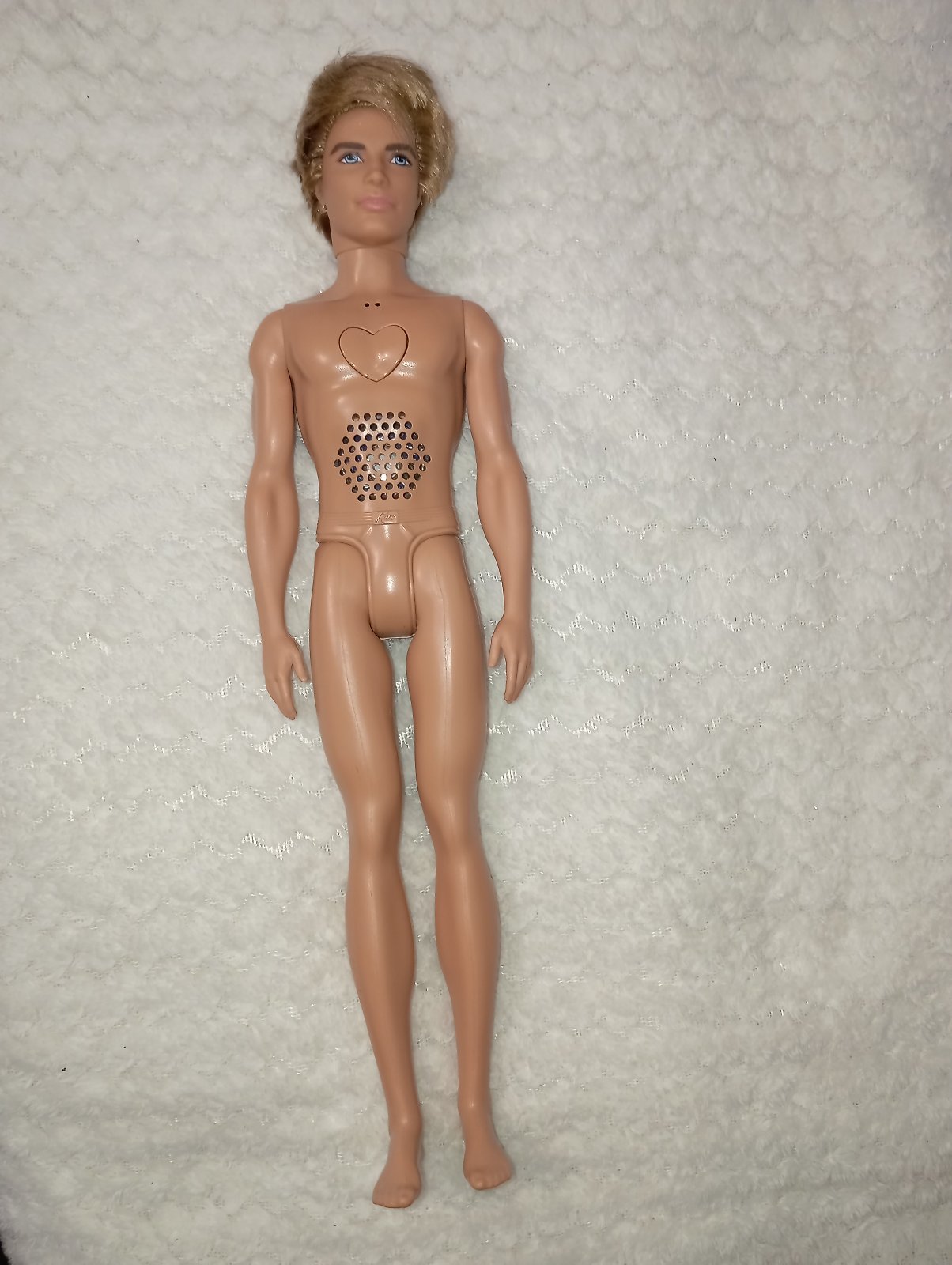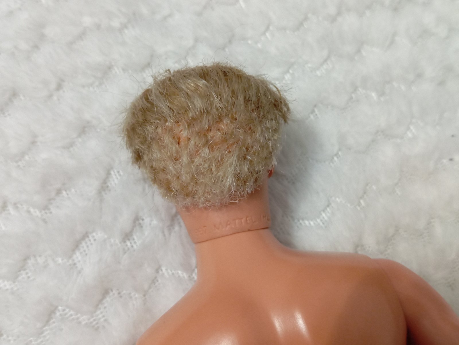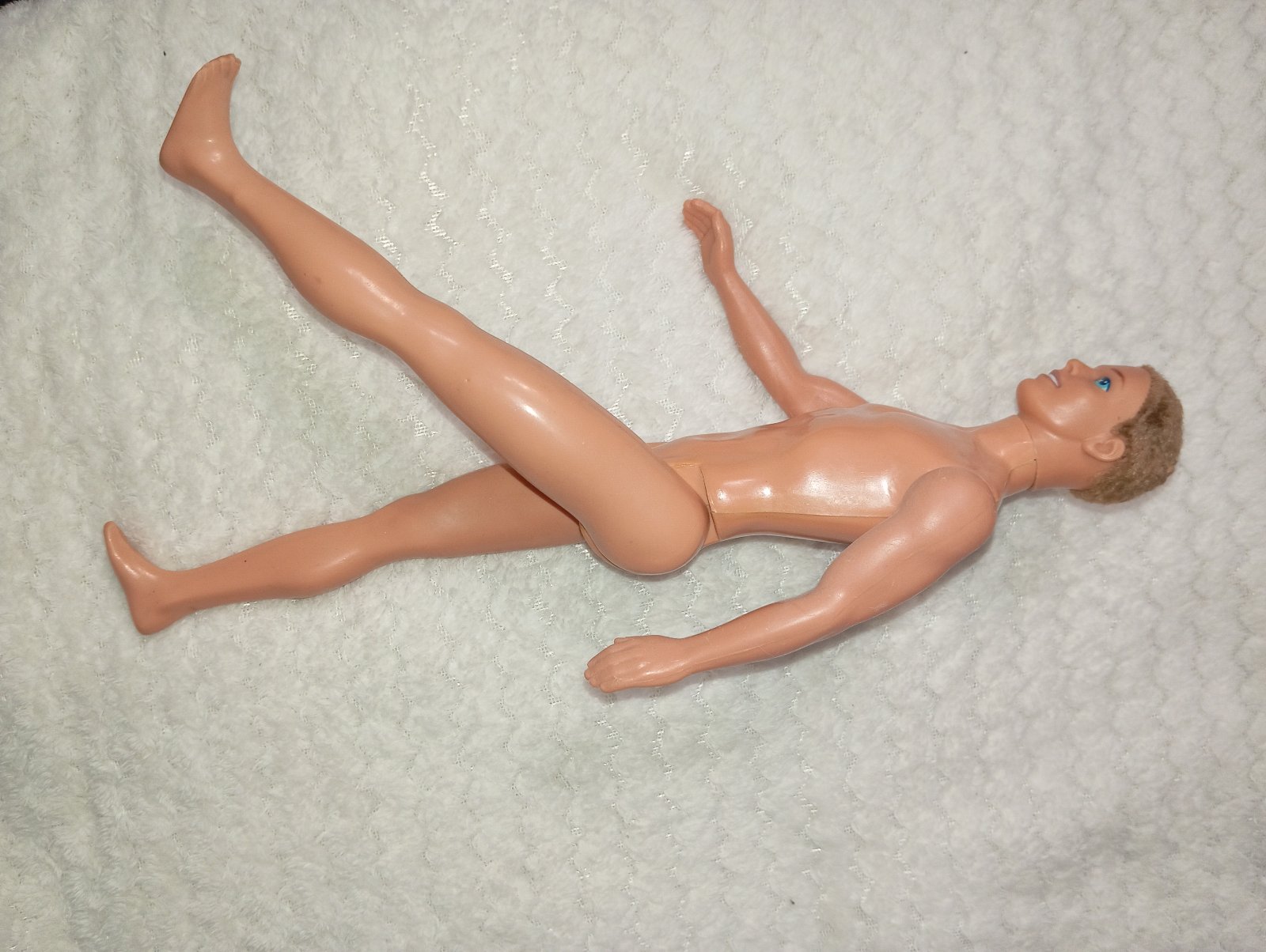 4. Ken Mattel 1968 bez oblečenia. na hrudi má pásiky (viď foto). Bedrové kĺby má mierne uvoľnené. Je ohybný v kolenách. Má veľké, prenikavé modré oči. Vzadu na hlave má plešinu (viď fotky). 20€