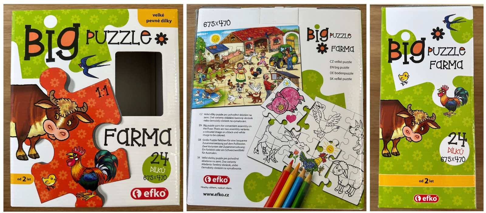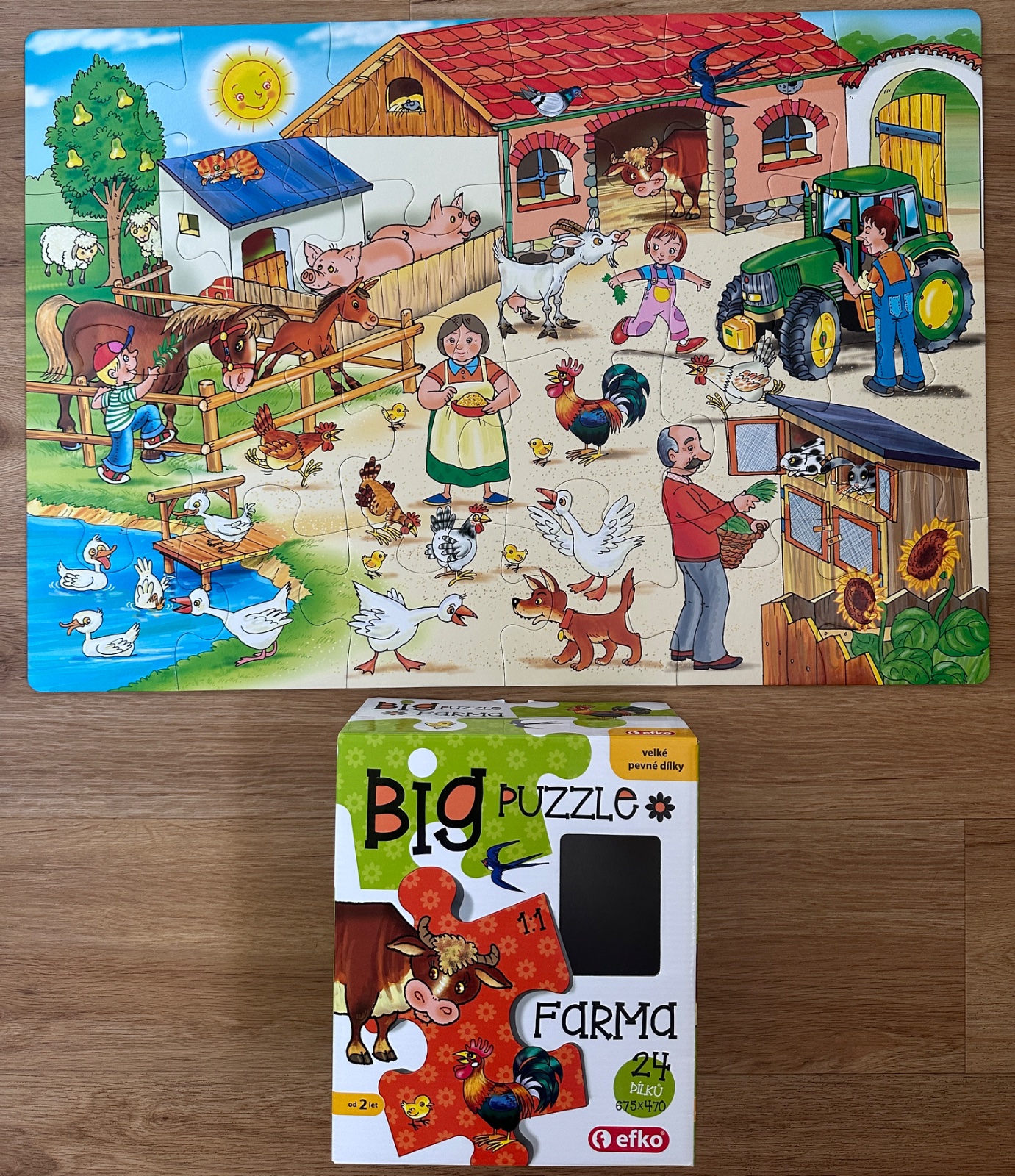POČET DIELIKOV:24,ROZMÉRY POSTAVENÉHO PUZZLE:675 x 470 mm,ROZMÉRY KRABICE:210×245 mm,VEKOVÉ DOPORUČANIE:3+,VÝROBCIA:EFKO kartón s.r.o.