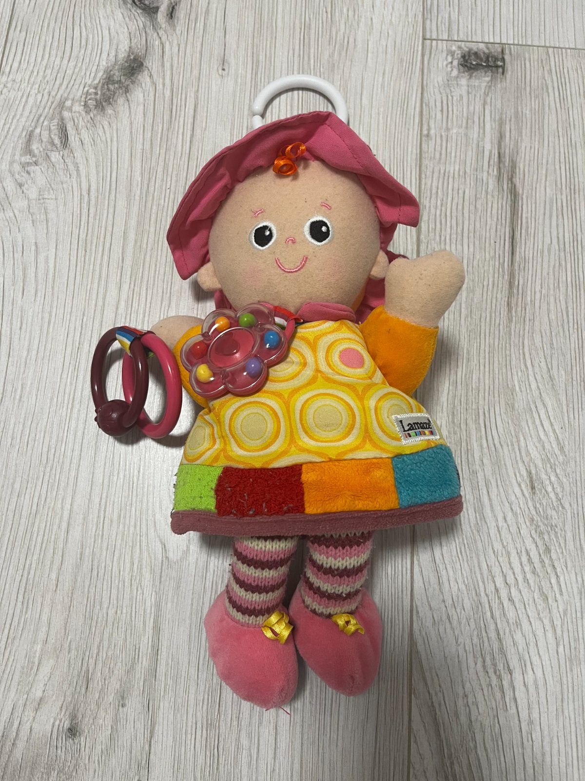 Pestrofarebné a šuštivé šatôčky a topánočky vyrobené z rôznych typov materiálov stimulují hmatové receptory i zrakové orgány. Hrkálka v náhrdelníku a pískatko v brušku zase pomáhajú rozvíjať sluch a motorické schopnosti. Charakteristický tvar očí podporujúci efekt "focal point" upúta detskú pozornosť a podporuje rozvoj koncentrácie. Vďaka novému Lamaze klipu hračku pripevníme na detskú postielku, či striešku kočiara rovnako ľahko ako napríklad na nákupný vozík alebo k prenosnej autosedačke. Hračka je vyrobená z kvalitného velúru. Použité sú len dvoj až troj vrstvové tkaniny s trvalou potlačou s dlhou odolnosťou. Farby tak zostávajú stále rovnako intenzívne aj po viacnásobnom praní. Hračka je vyrobená z praktického ľahko umývateľného materiálu.