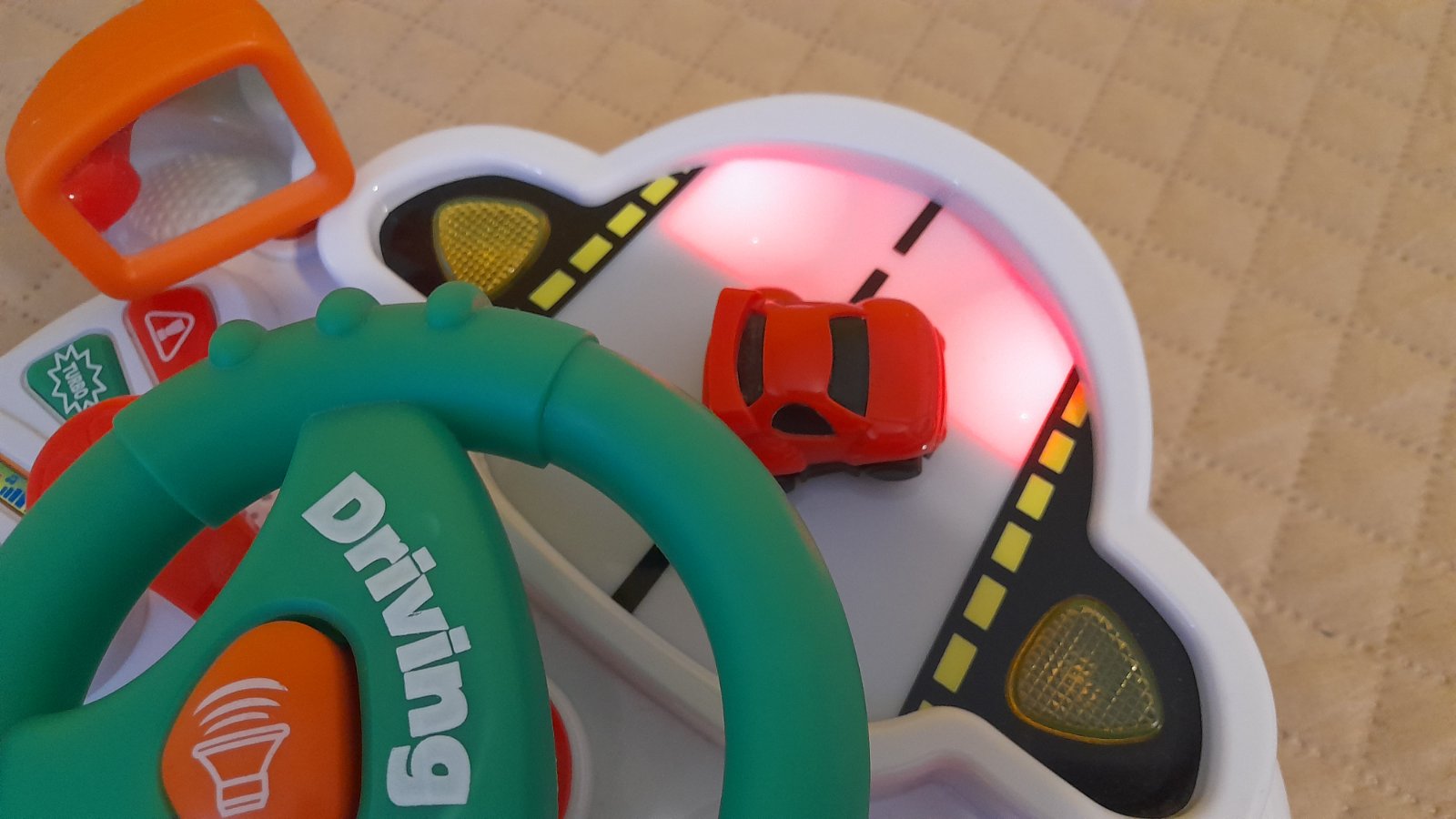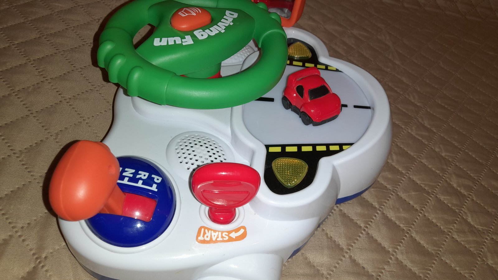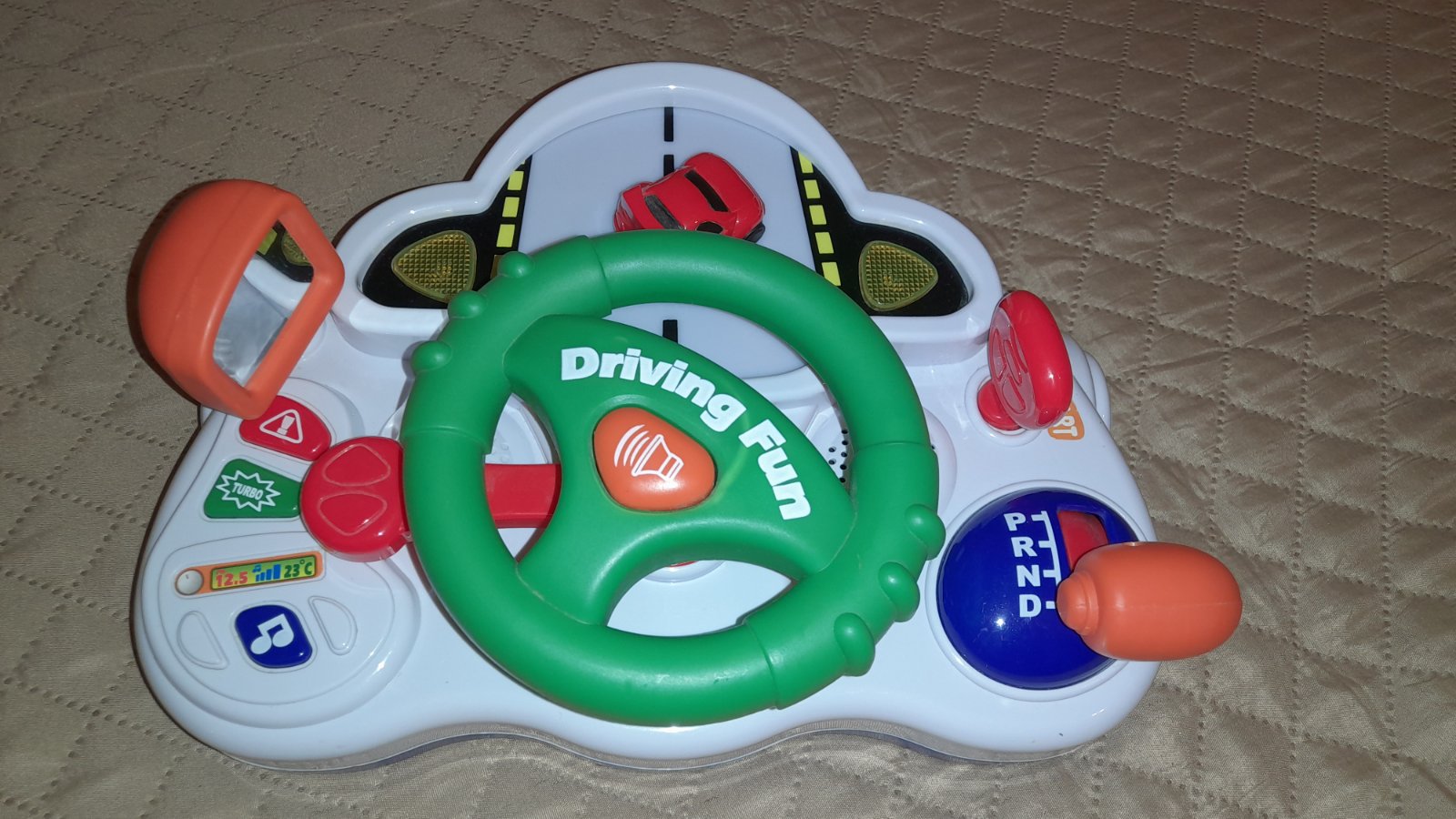 Detsky volant v hranom ale stale velmi peknom zachovalom stave s minimalnymi znamkami hrania. Vsetko funkcne okrem klaksonu. Svieti, hra hudbu, vrci ako motor, blikaju smerovky.