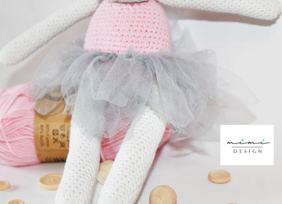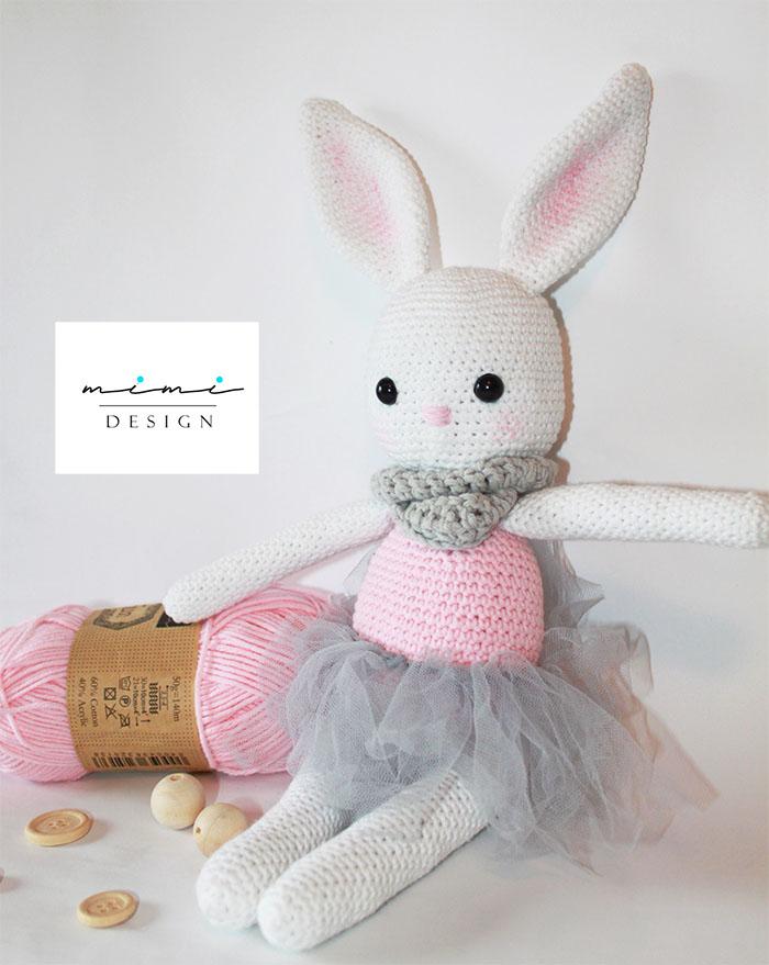 Hackovany zajacik je vyrobeny zo zmesi vlny a akrylu, vyplneny antialergickym dutym vlaknom, ocka su bezpecnostne.