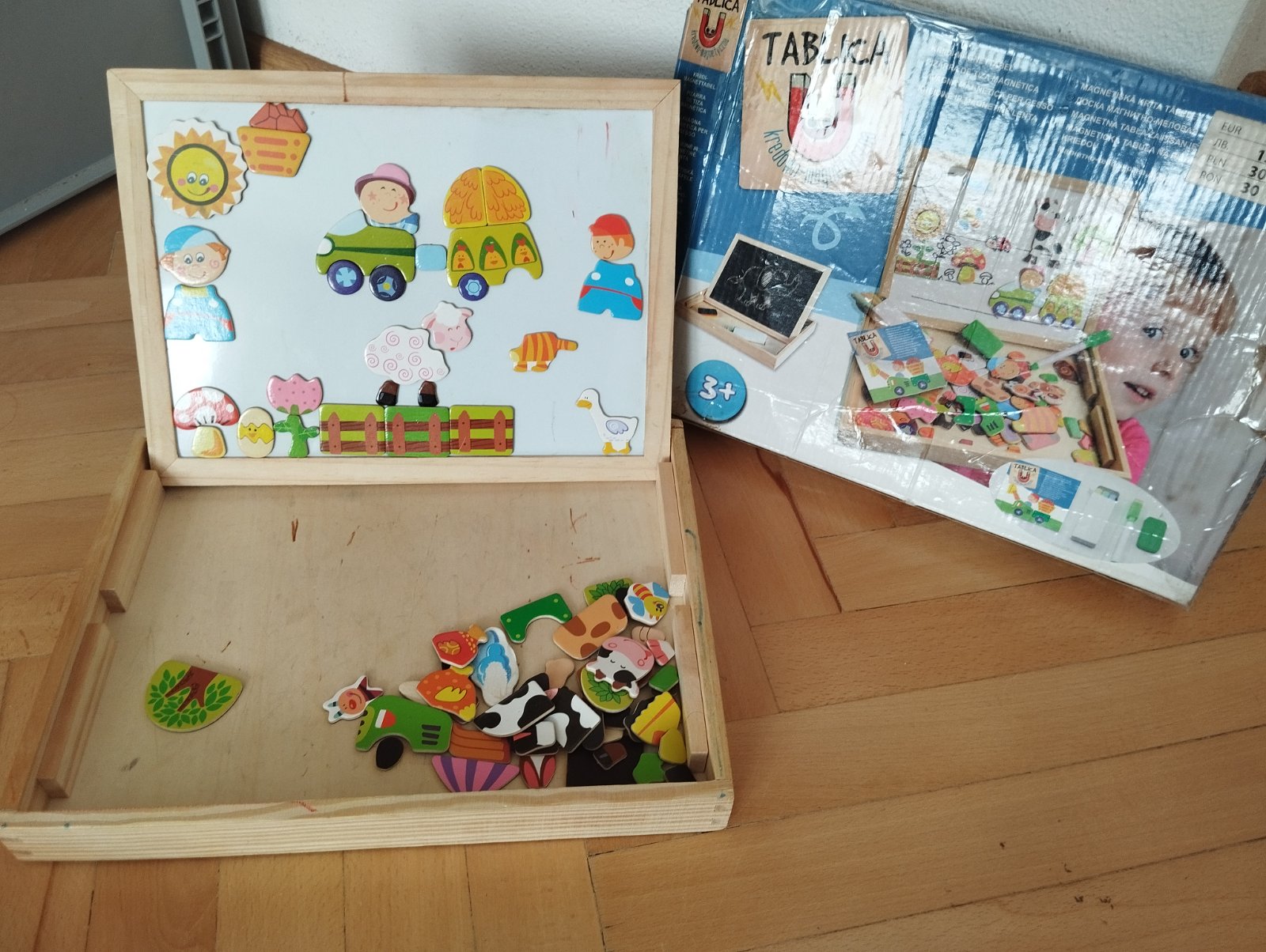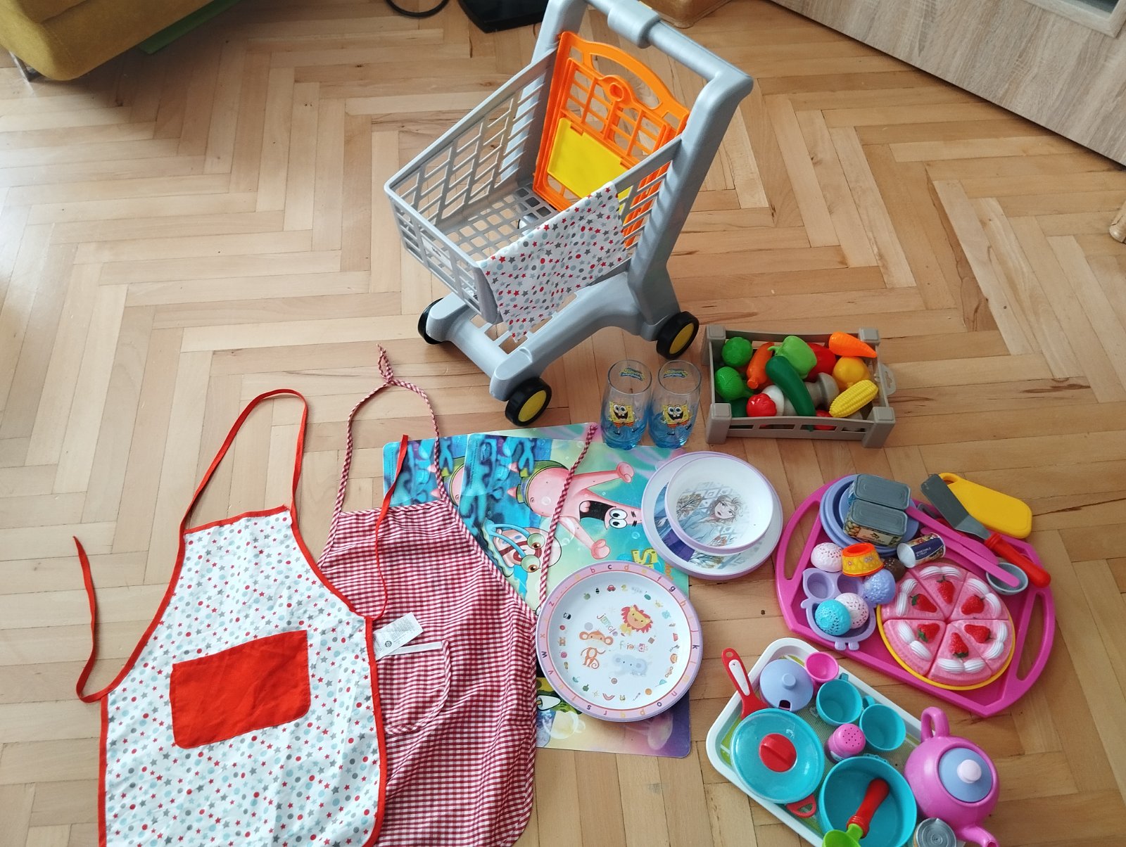 Posuniem hračky,u nás už nevyužívané.Vo veľmi dobrom stave.Nachádza sa tam výbava do detskej kuchynky,vozík na nákup,magnetická tabuľka so zvieratkami,z druhej strany možnosť kresliť kriedou,výbava pre malého doktora,kniha(tvrdá väzba).Všetko bolo používané doma.Pridám k tomu dva poháre a dve prestierania z edície SpongeBob.Dva plastové detské taniere a set Ľadové kráľovstvo.Cena za všetko je 30€.