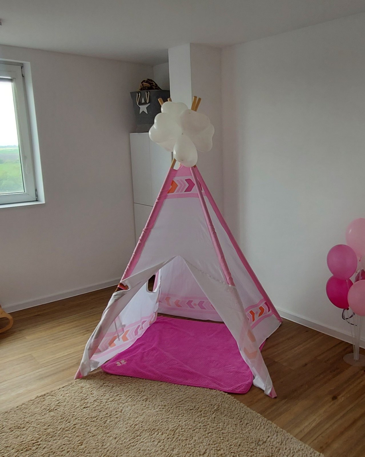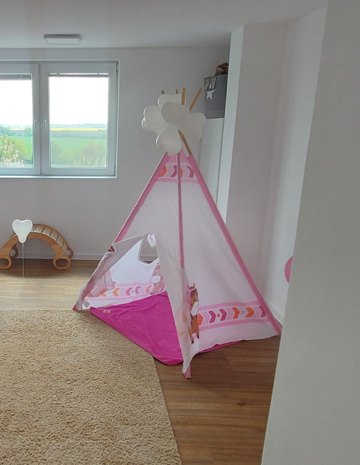 Krásny teepee stan .z prírodného materiálu. Je k nemu aj obojstranná podlozka sivá a ružová, aj obal na teepee. Top stav žiadne poškodenia . Ako nové používané minimálne. Možnosť prať podložku aj s...