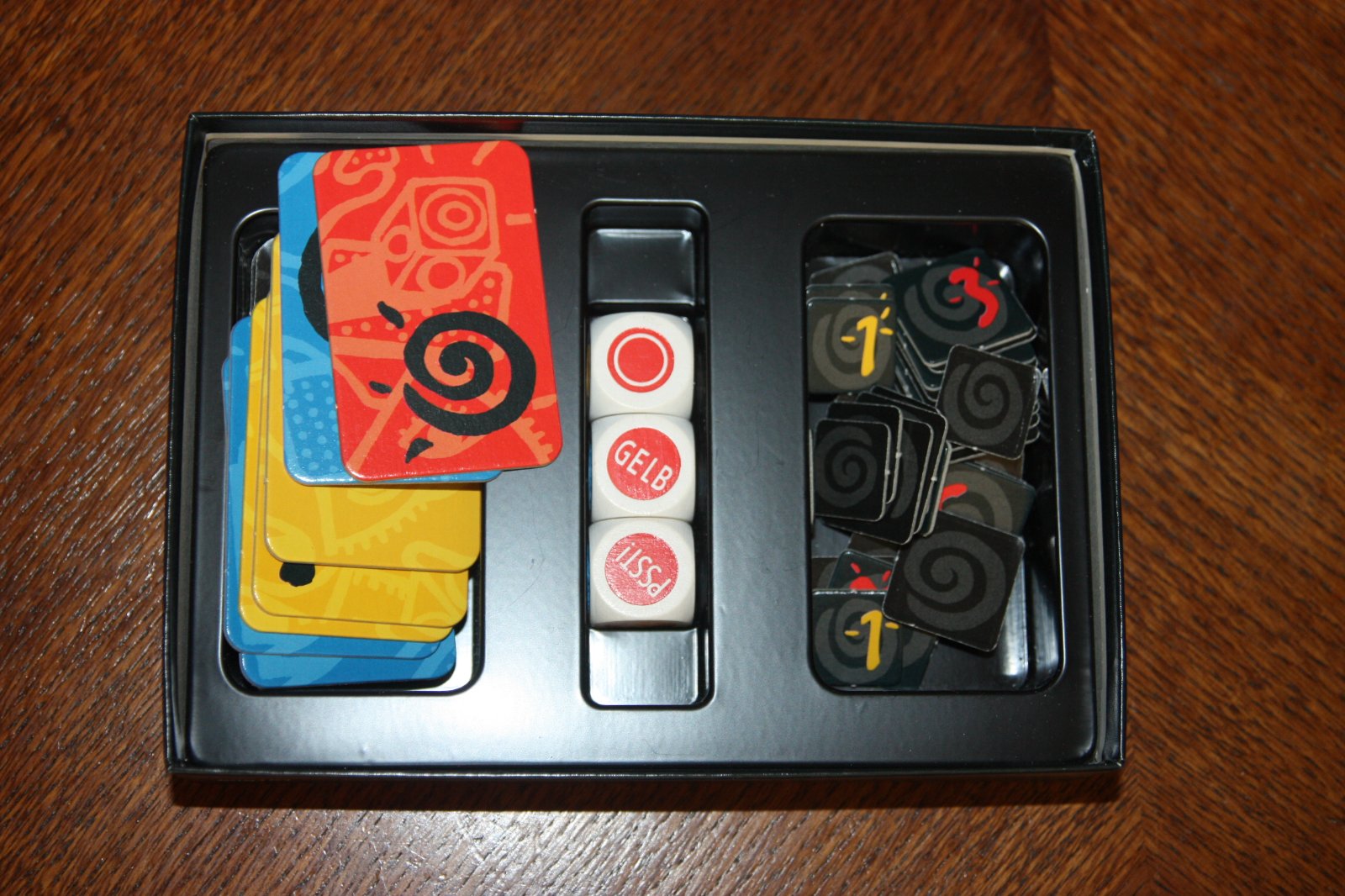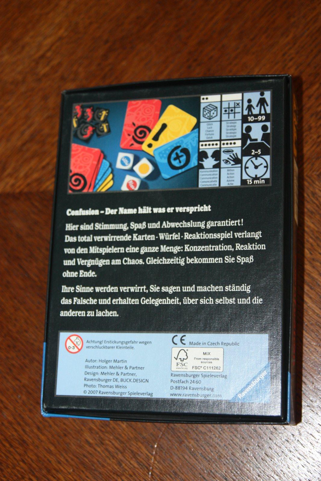 Veľmi mätúca hra, Confusion. Sú tu 3 kocky: farebná kocka, slovná kocka a akčná kocka. Každá kocka má farbu pozadia a nejakú ďalšiu informáciu. Ak sa slovo na kocke slova a farba na kocke farby nezhodujú, ako prvý vyhoďte kartu farby, ktorá chýba (celkovo sú len 3 farby). Ak sa zhodujú, vykonajte akciu na akčnej kocke. Nazbierajte najviac bodov tým, že nebudete poslední alebo nezmrznete. Existuje aj variant, ktorý situáciu ešte viac komplikuje.