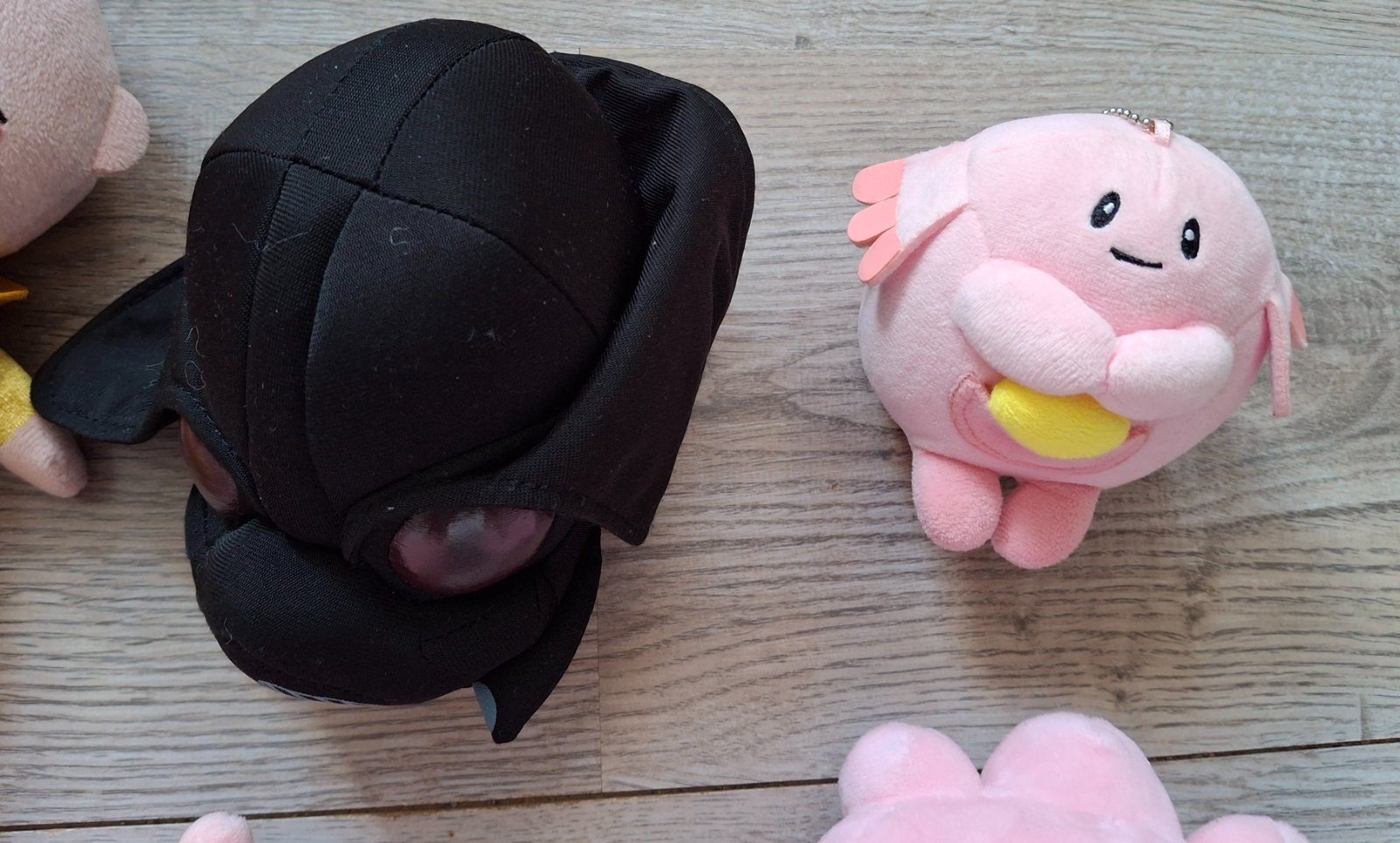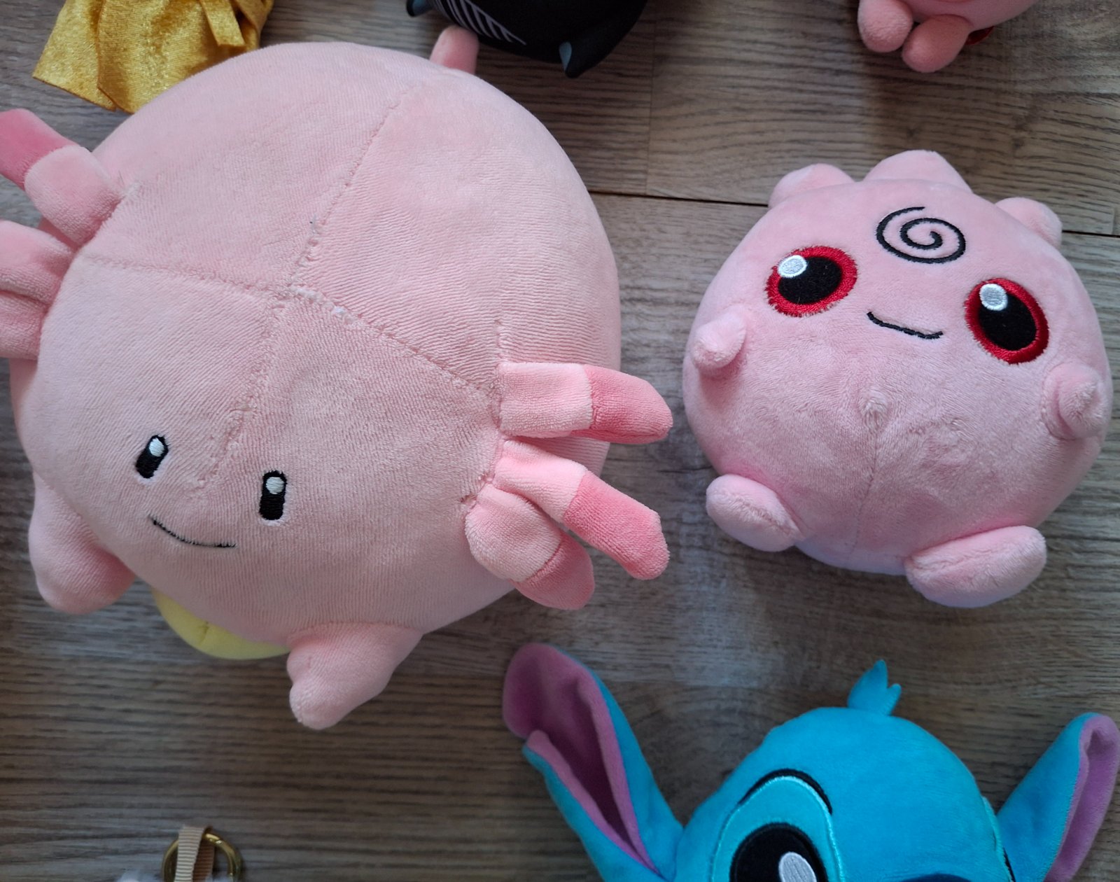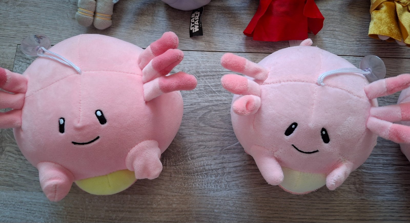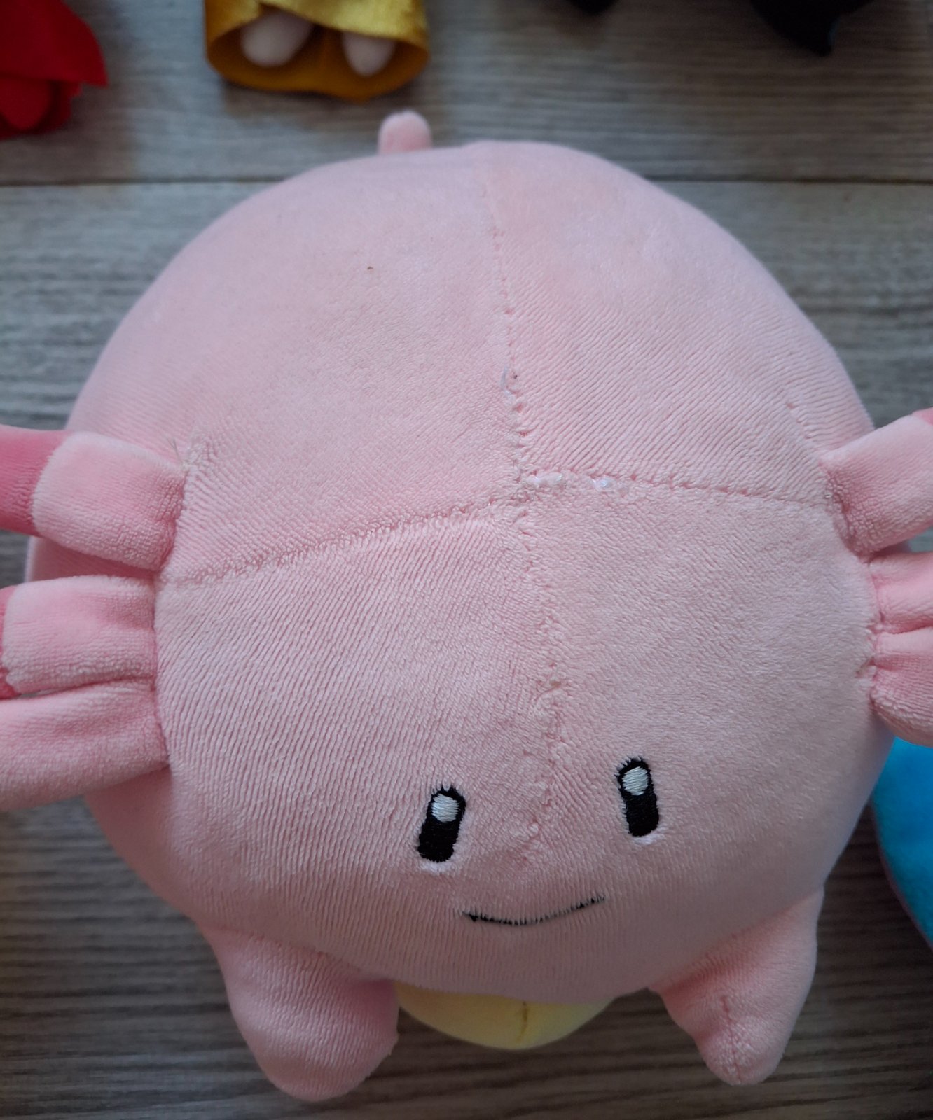 Pokémoni veľkí ružoví axolotli Chancey, výška cca 16-18cm, všetci traja, boli na kúsku zašívaní, odfotené na detailných fotkách. Každý za 3 eur.