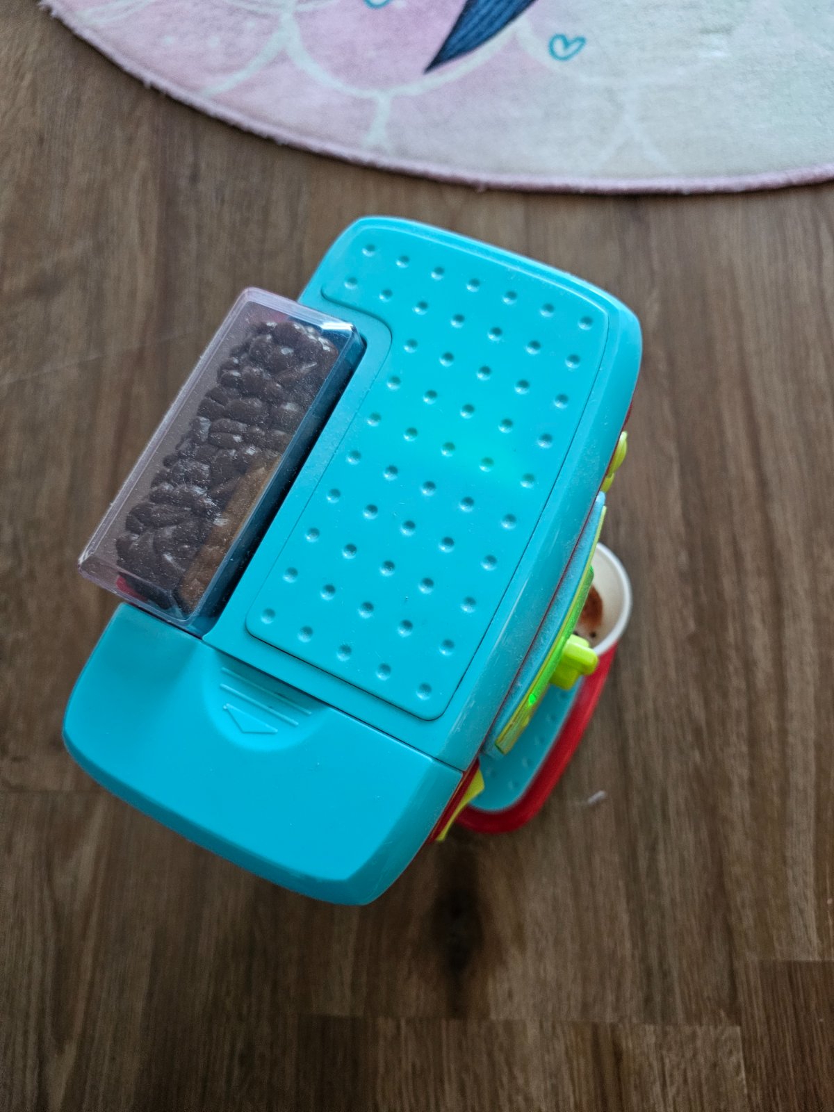 Navrchu je zásobník s umelými zrnkami kávy. Obsahuje tlačítka, po stlačení ktorých robí rôzne zvuky. Na displeji sa zobrazuje, či sa vyrába "cappuccino", "latte" alebo "macchiato".