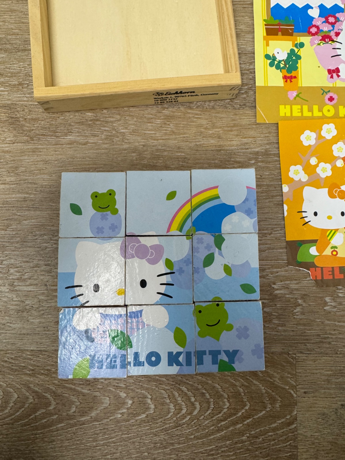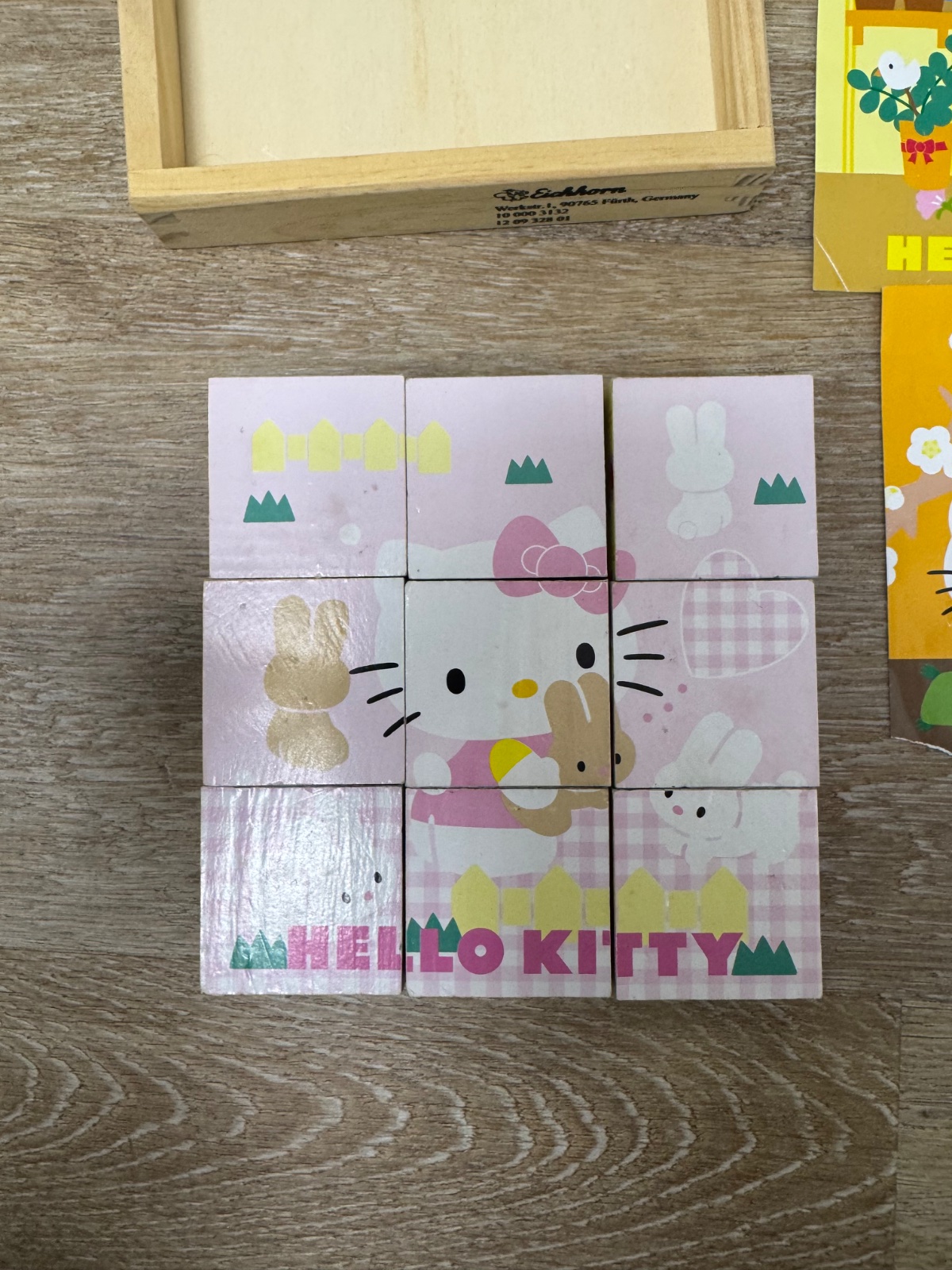 Ponúkam sadu 9ks drevených kociek značky Eichhorn s mortívom mačičky Hello Kitty. Kocky sú komplet akurát predlohy nemám všetky, 3ks chýbajú a zvyšné sú trochu doničené, sle možnosť odfotiť a zalaminovať..inak ok, mali sme ich rady;).Poštovné podľa taríf.