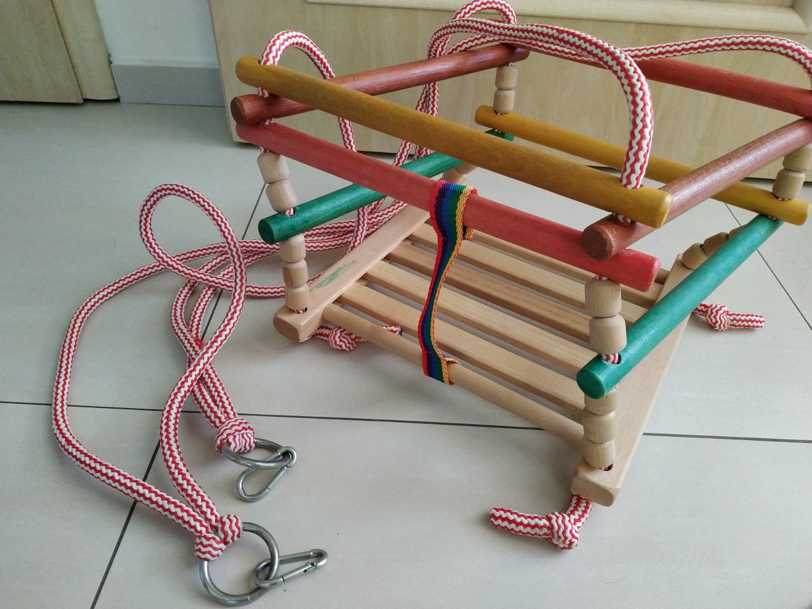 Hojdačka je vo výbornom stave, do cca 15-20kg, mali sme ju odkedy sa syn naučil sedieť. Zavesí sa na háčiky.