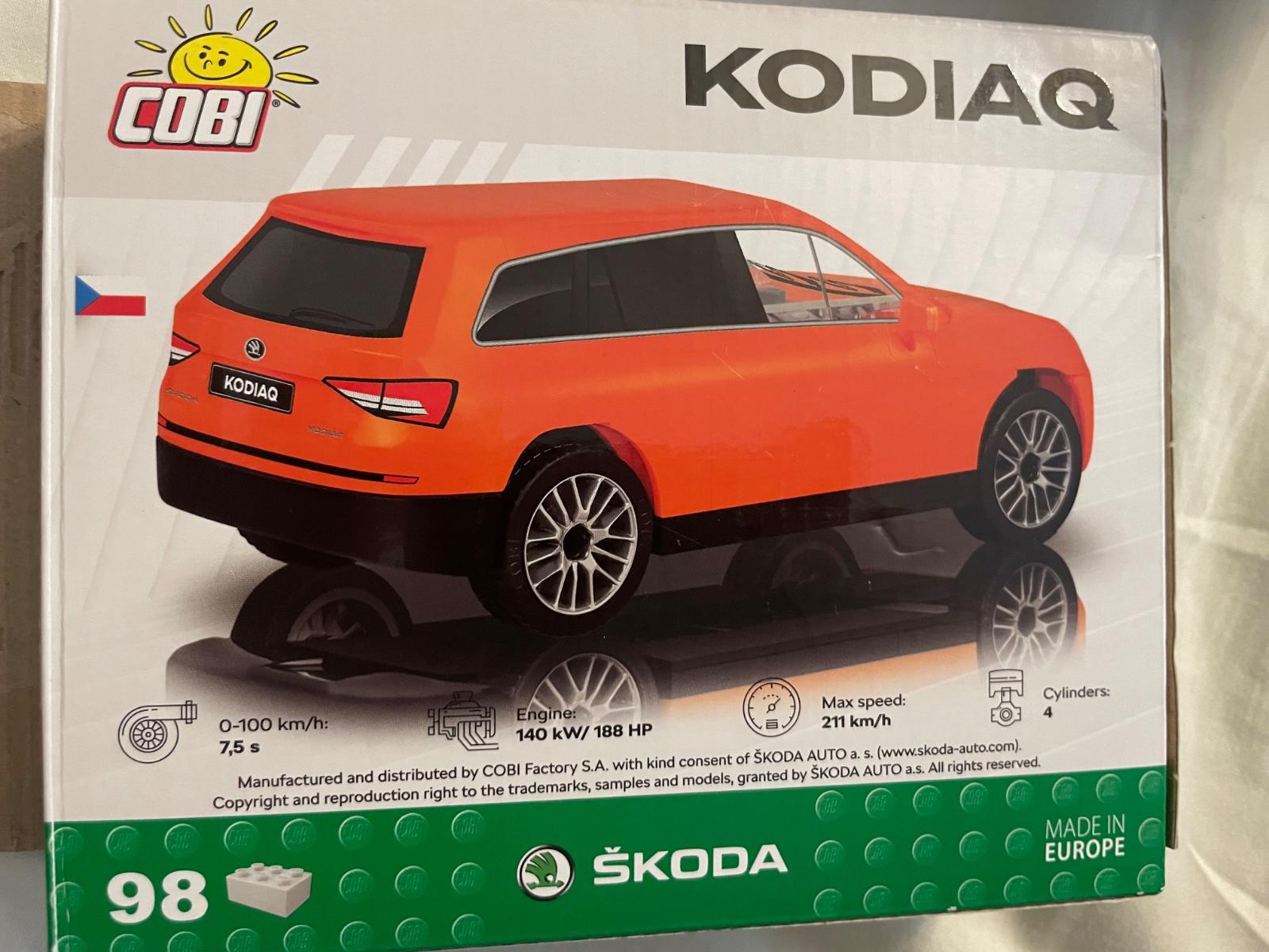 Stavebnice modelu vozu SUV KodiaQ výrobcu Škoda auto v peknej oranžovej farbe. Model v mierke 1:35 po zostavení meria 13 cm na dĺžku, 6,5 cm na šírku a 4,5 cm na výšku. Presklenie je vyrobené z kvalitného transparentného plastu (zadné okná zatmavené). Všetky modely Škoda od spoločnosti COBI Factory SA sú vyrobené pod oficiálnou licenciou značky ŠKODA AUTO.