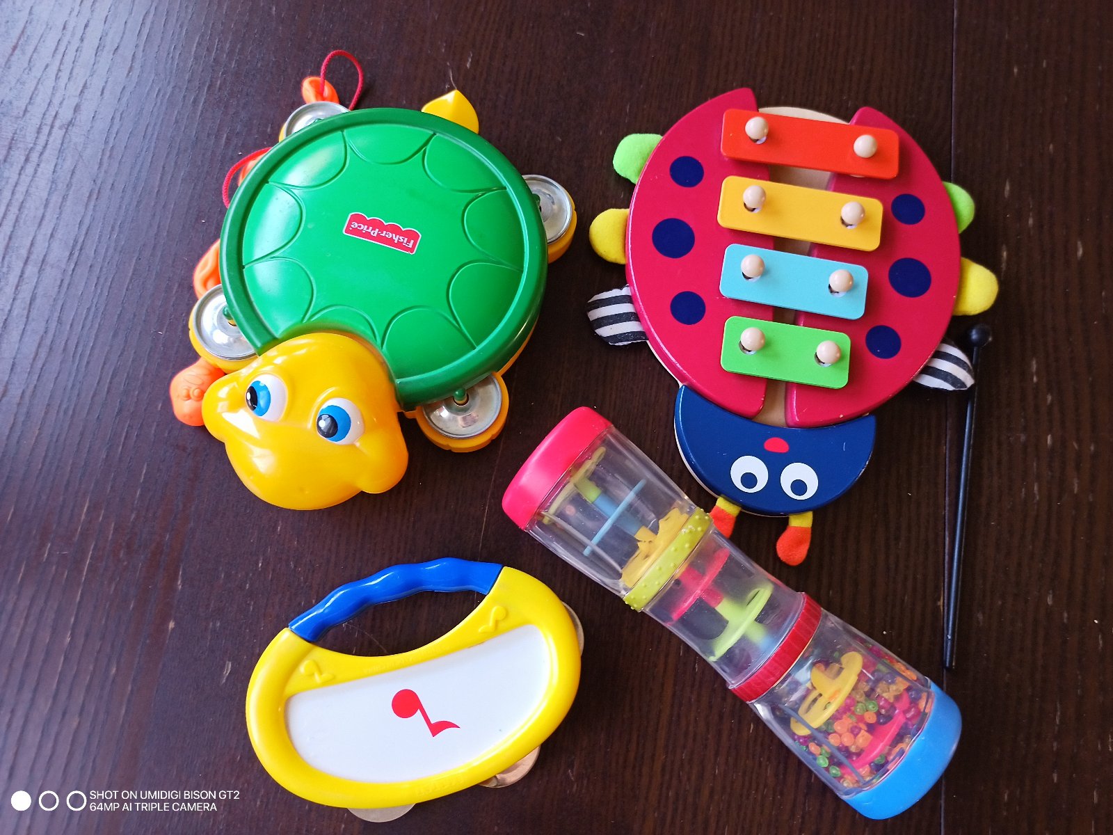 Sada detských hudobných nástrojov, Fisher price korytnačka bubon,má v sebe rumblu z druhej strany, paličku v tvare hadika. Mothercare tuba zvuk dažďa, xylofony...