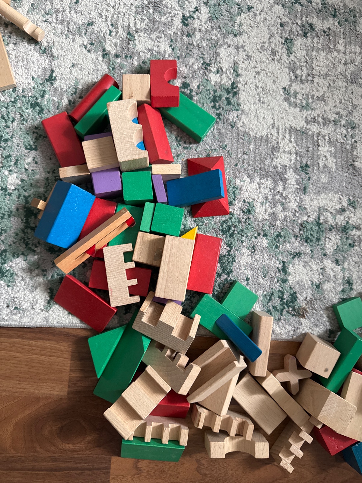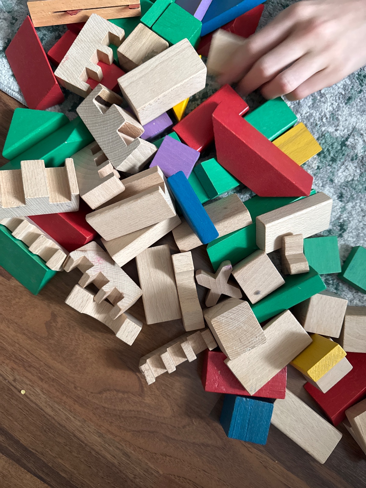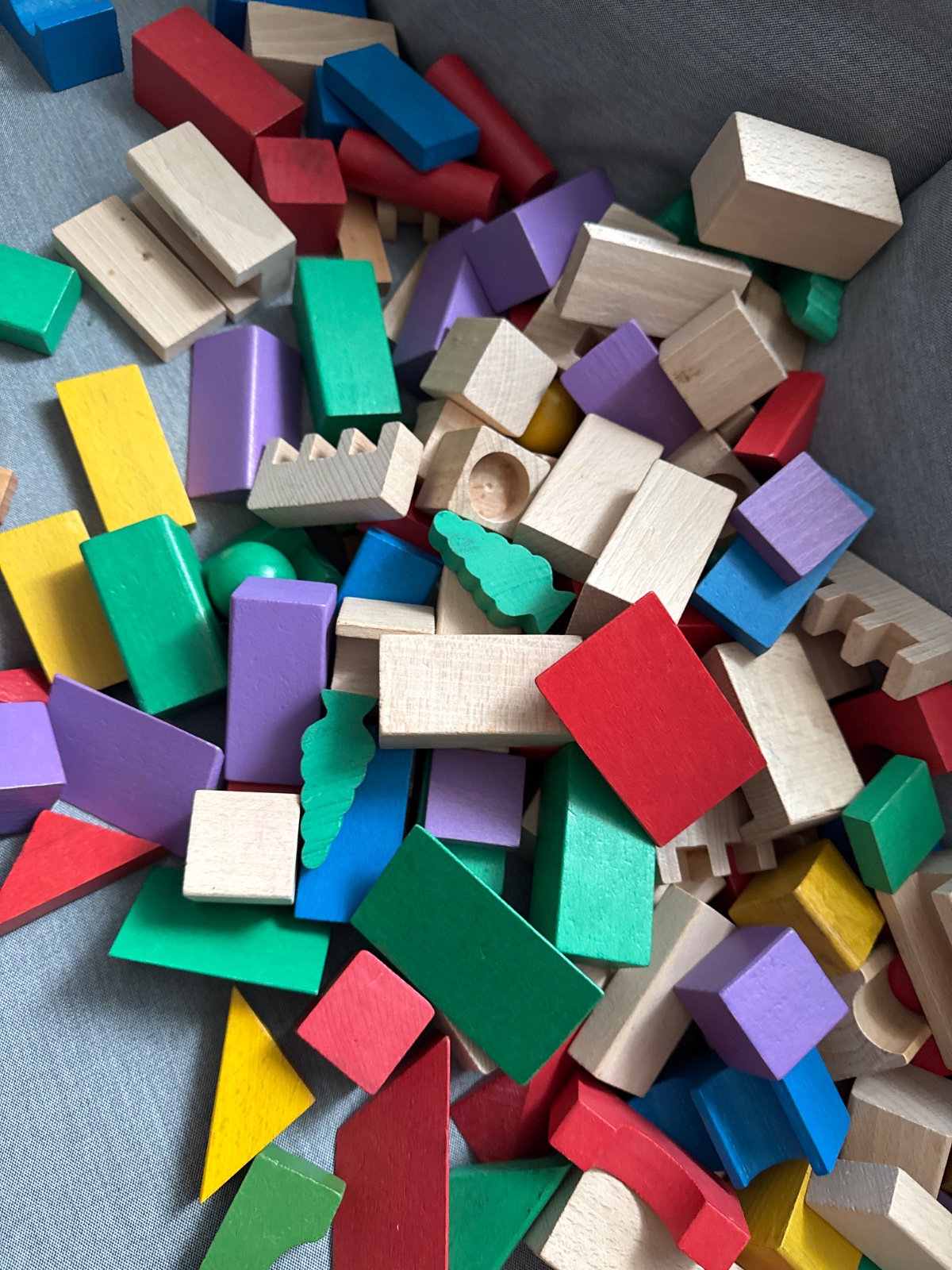 Vytvaranie sveta, domov, stromceky su tam.. farebne aj jednofarebne. Gule. Ploty. Vytvaranie pribehov. Tensie obdlzniky, kocky, hrube kvadre. Moje deti si postavili z toho nieco a autickami panacikmi sa vyhrali.