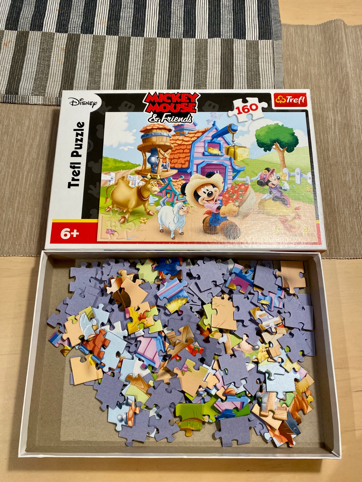 Detské puzzle v téme Mickey Mouse & Friends. Spolu 160 kúskov - plný počet. 41 x 27,8 cm