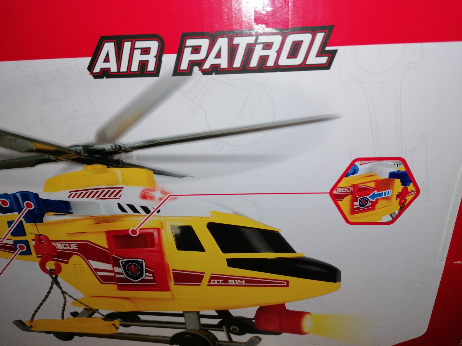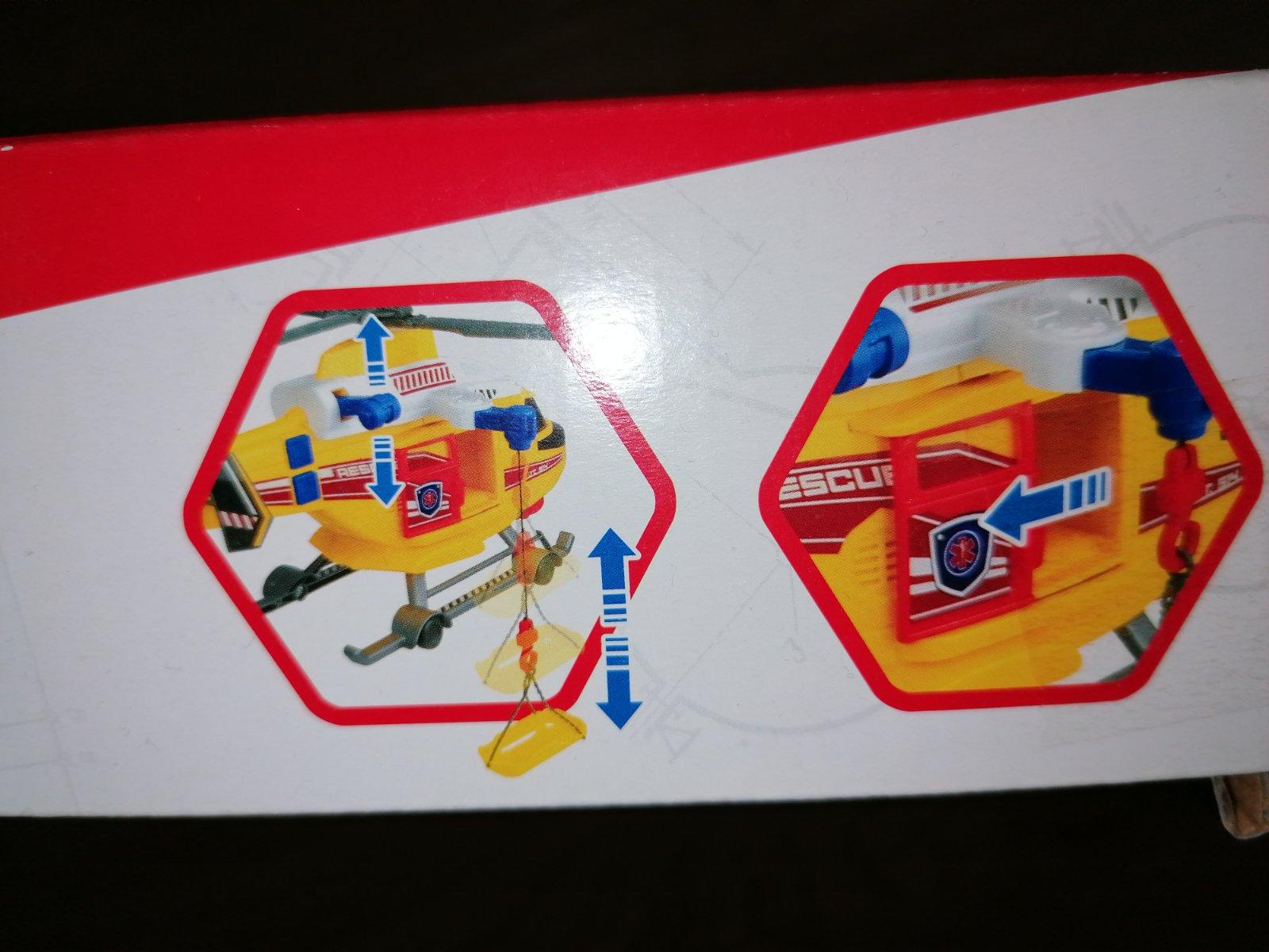 Záchranný vrtuľník cca 40cm so svetlami, zvukom letiace ho vrtuľníka, dispečer záchrannej stanice po stlačení tlačidla, po stlačení páky posun lana s hákom a záchranným lehátko nahor a nadol, posuvné dvere