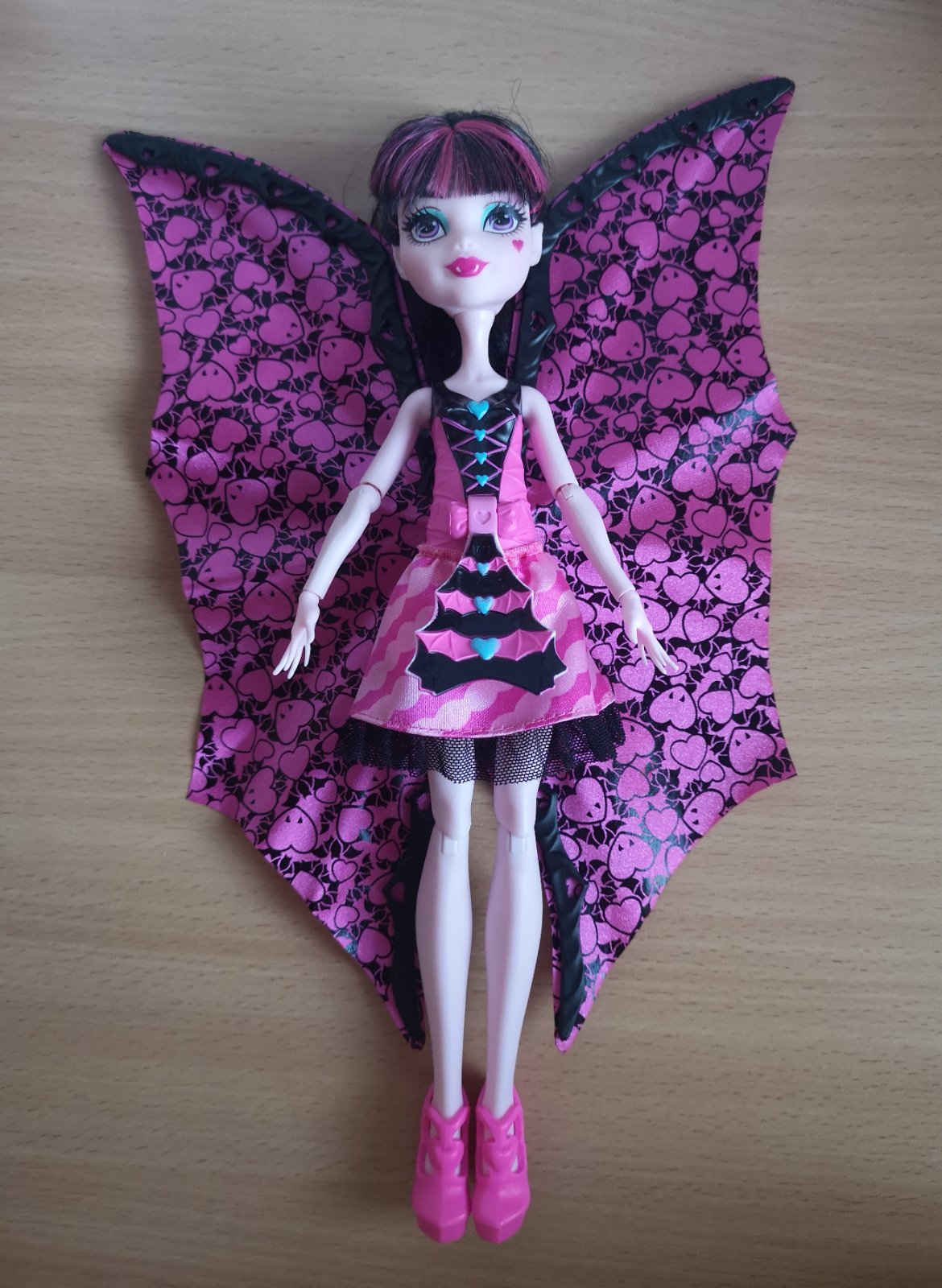 Draculaura (dcéra Draculu) sa za malú chvíľku dokáže zmeniť na netopiericu. Stačí odklopiť páčku na jej korzete, sukňa sa roztvorí a premení sa na netopierie krídla.