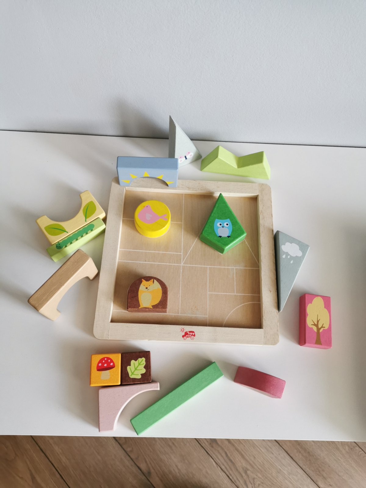 Milá drevená skladačka s motívmi lesa. Puzzle tvorí 16 častí na drevenej podložke, na ktorej sa drevené dieliky prakticky ukladajú a skladujú. Variabilita skladania na podložku, častí na seba alebo do priestoru, kde sa dieta hrá na les. Rozmer 23x23cm. Malované bezpečnými farbami.