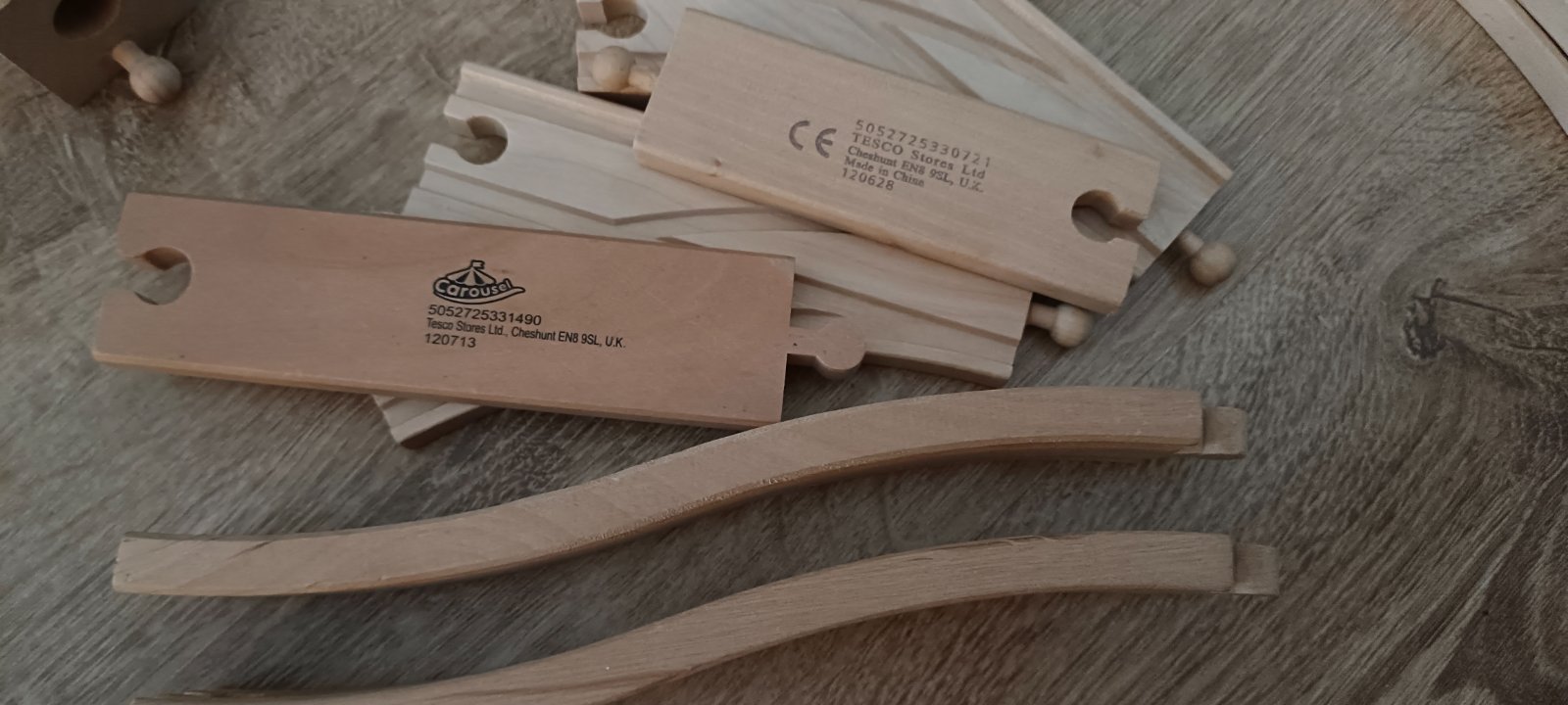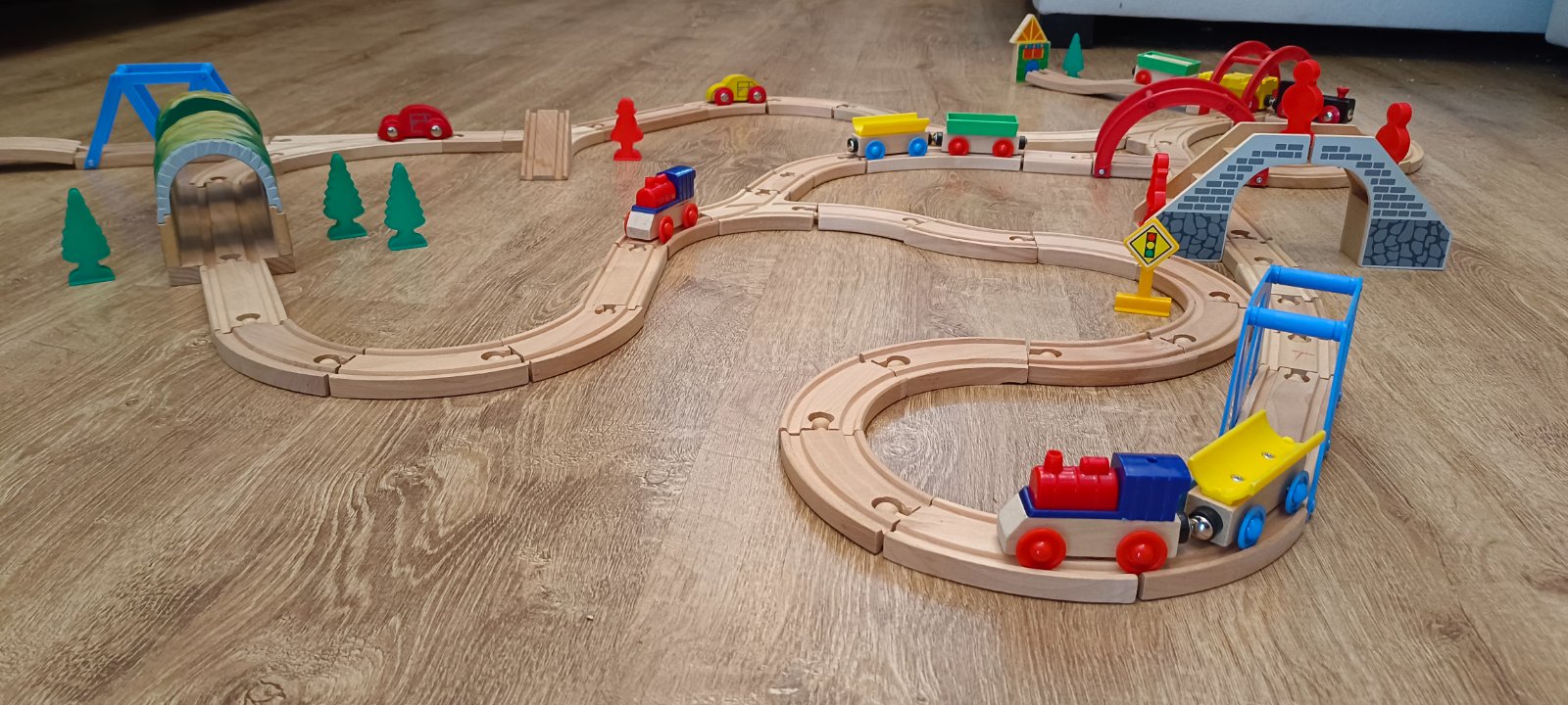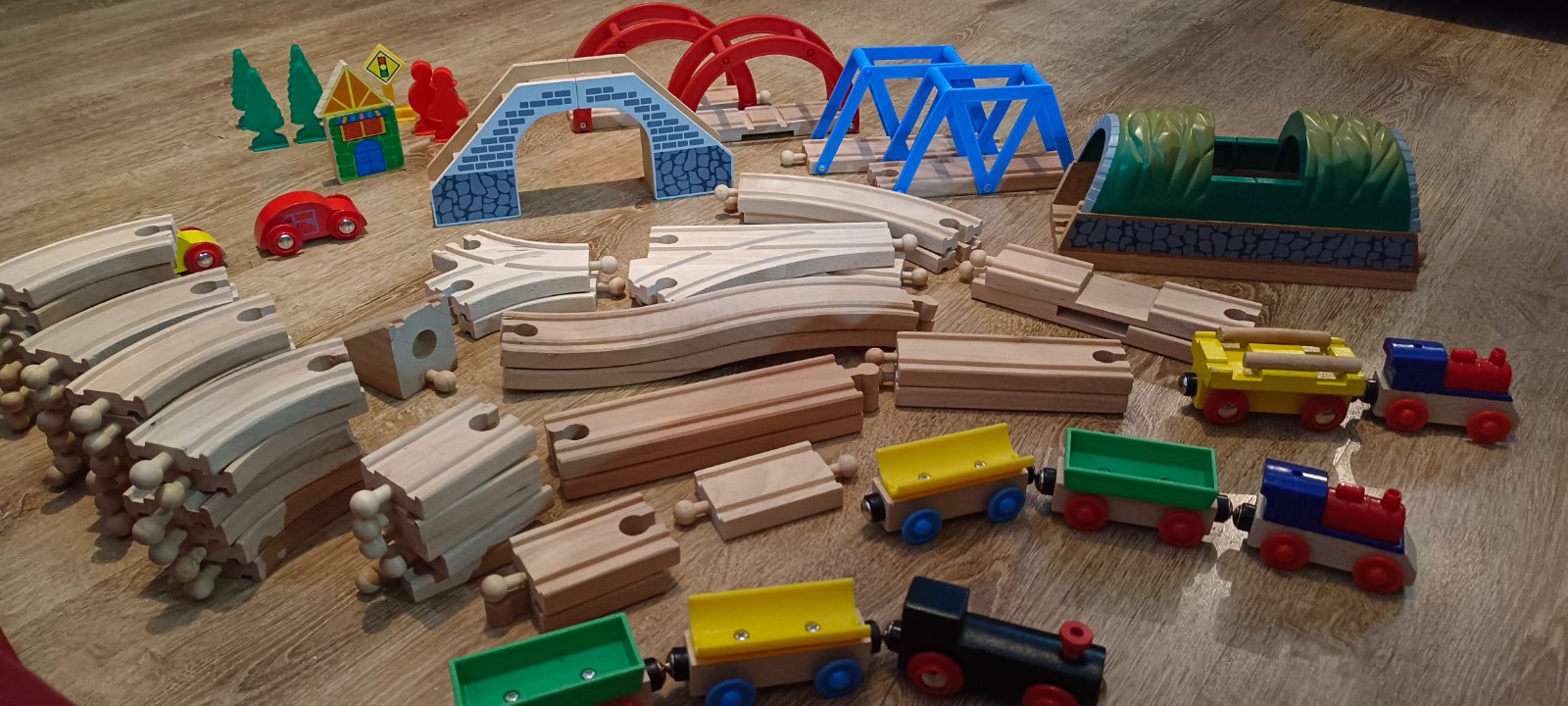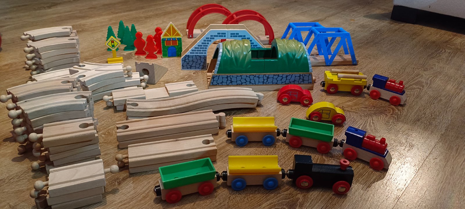 Krásna drevená vlačiková zostava zn.Carousel. Super sa s ňou zahraje celá rodina. Súprava bola priebežne dokupovaná, tak niektoré drevené časti koľajnic sú tmavšie. Obsahuje 6 rôznych mostov, 3 x rušne, 5x vozňov, 1x železničný domček , 4 plastové postavičky a 4 plastove stromy, semafor, rôzne výhybky, rovné koľajnice a 2ks koľajníc s mini vyvýšením.Spolu 47 koľajníc .A bonus 2 x autíčka kompaktibilné na koľajnice.Spolu 76kusov.Vo výbornom stave.Okrem jedného vozňa a tých dvoch autičok je to ako nové. Odporúčam.Po dohode viem priviesť do BA,SC,PK,TT.