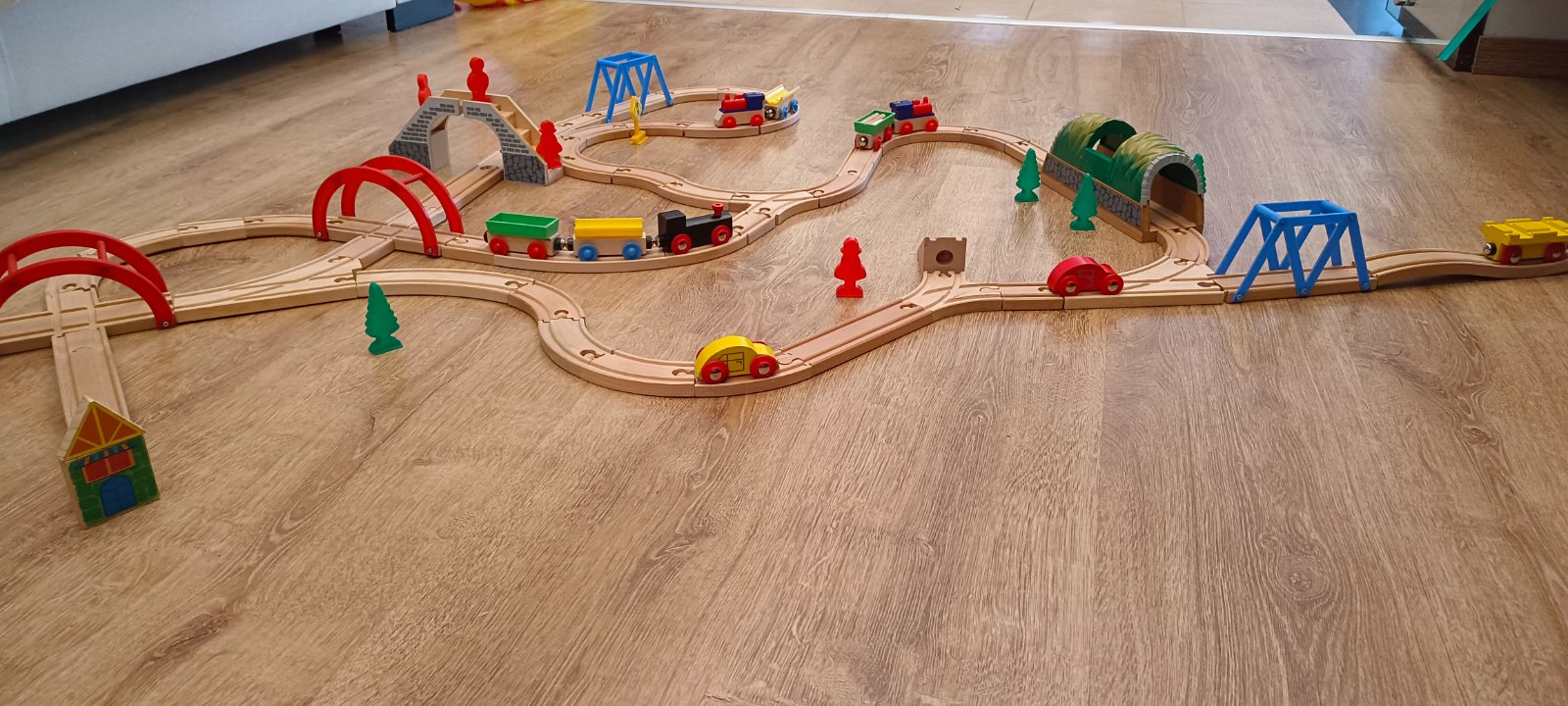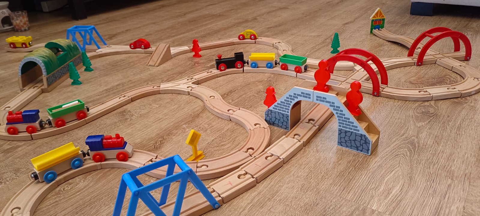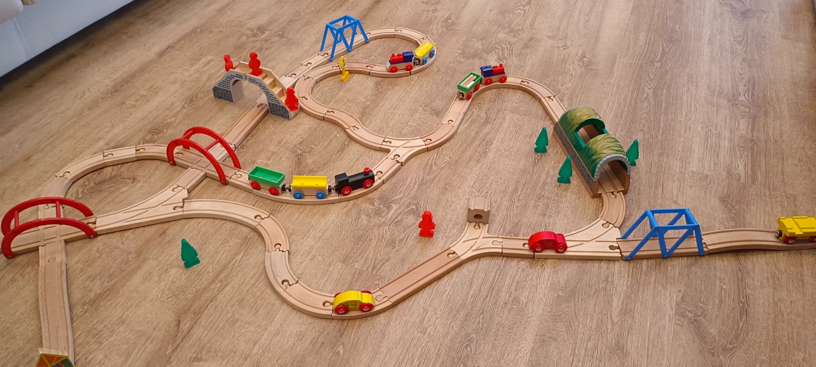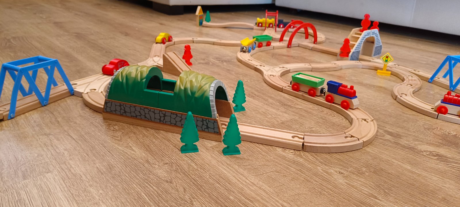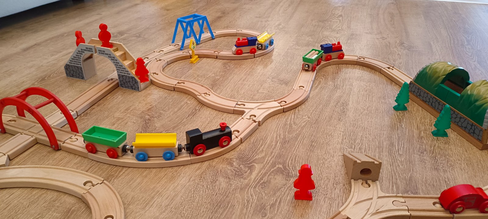 Krásna drevená vlačiková zostava zn.Carousel. Super sa s ňou zahraje celá rodina. Súprava bola priebežne dokupovaná, tak niektoré drevené časti koľajnic sú tmavšie. Obsahuje 6 rôznych mostov, 3 x rušne, 5x vozňov, 1x železničný domček , 4 plastové postavičky a 4 plastove stromy, semafor, rôzne výhybky, rovné koľajnice a 2ks koľajníc s mini vyvýšením.Spolu 47 koľajníc .A bonus 2 x autíčka kompaktibilné na koľajnice.Spolu 76kusov.Vo výbornom stave.Okrem jedného vozňa a tých dvoch autičok je to ako nové. Odporúčam.Po dohode viem priviesť do BA,SC,PK,TT.