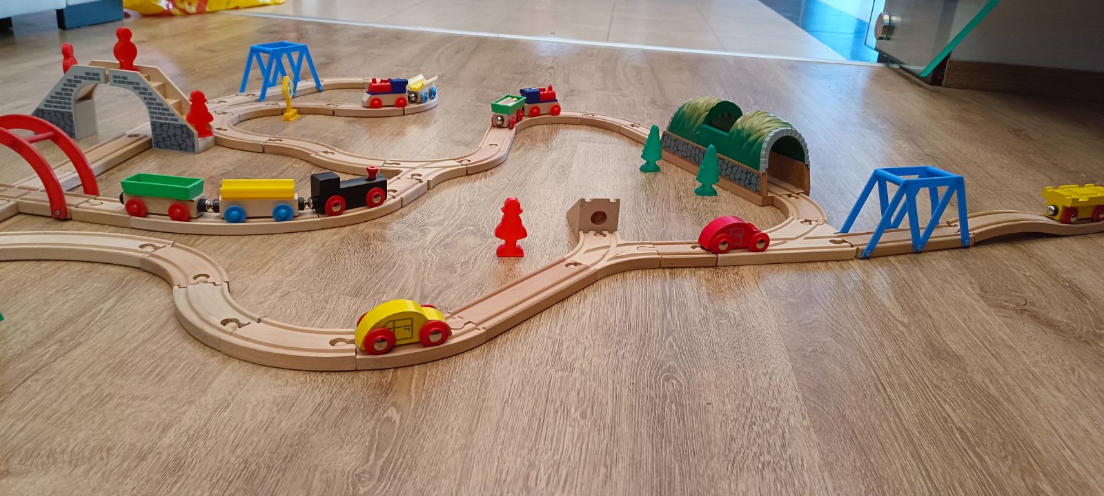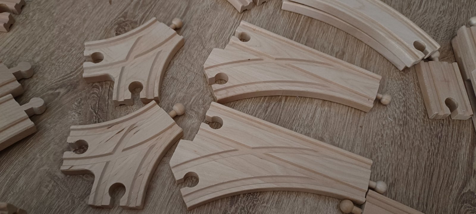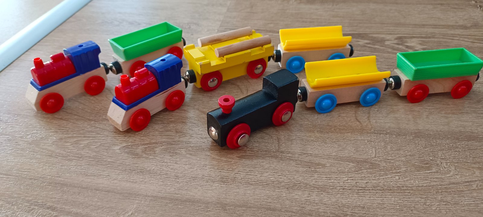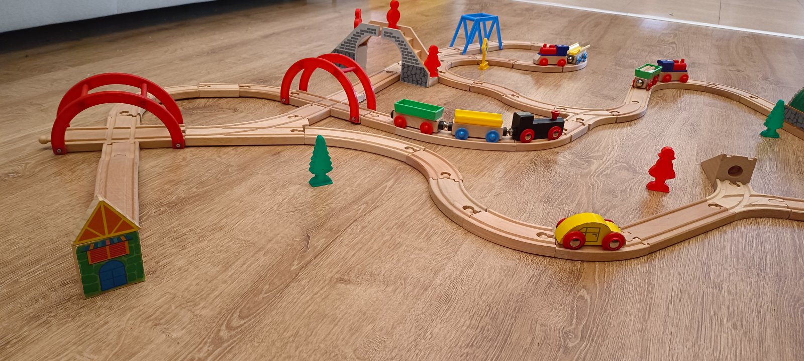 Krásna drevená vlačiková zostava zn.Carousel. Super sa s ňou zahraje celá rodina. Súprava bola priebežne dokupovaná, tak niektoré drevené časti koľajnic sú tmavšie. Obsahuje 6 rôznych mostov, 3 x rušne, 5x vozňov, 1x železničný domček , 4 plastové postavičky a 4 plastove stromy, semafor, rôzne výhybky, rovné koľajnice a 2ks koľajníc s mini vyvýšením.Spolu 47 koľajníc .A bonus 2 x autíčka kompaktibilné na koľajnice.Spolu 76kusov.Vo výbornom stave.Okrem jedného vozňa a tých dvoch autičok je to ako nové. Odporúčam.Po dohode viem priviesť do BA,SC,PK,TT.