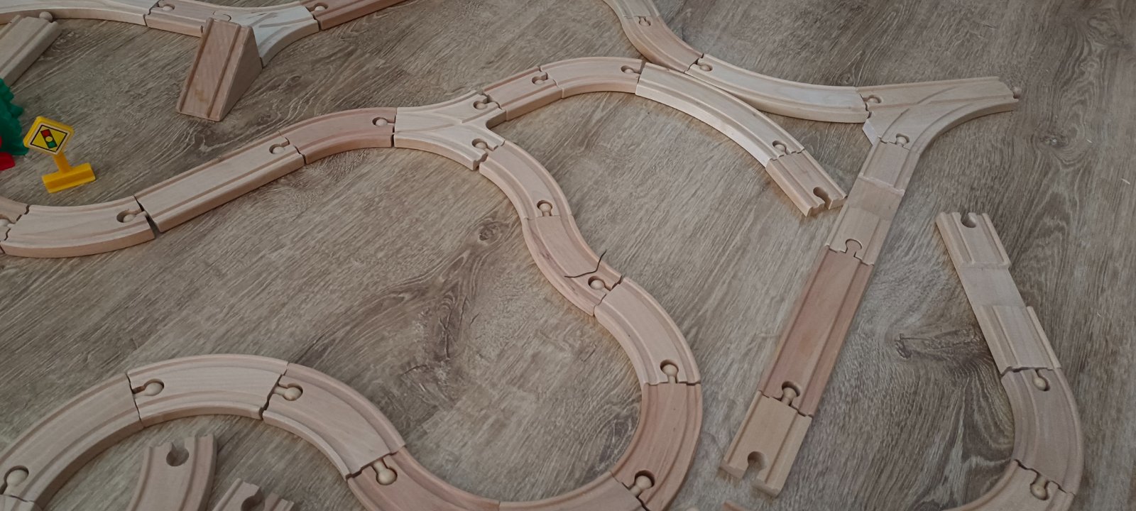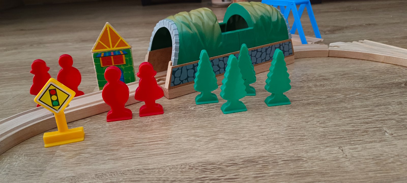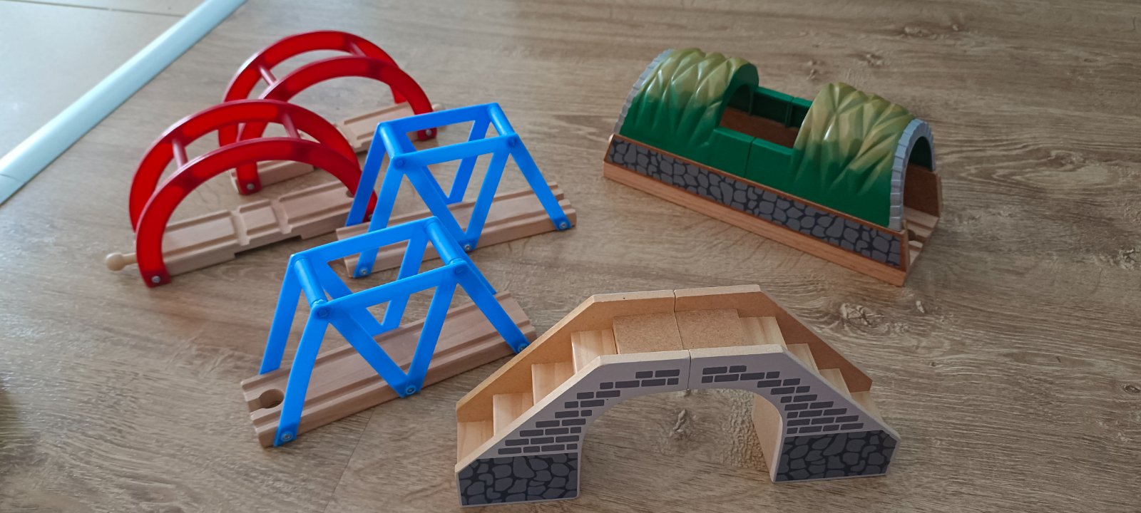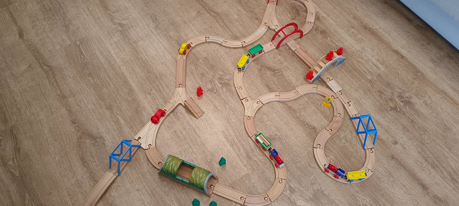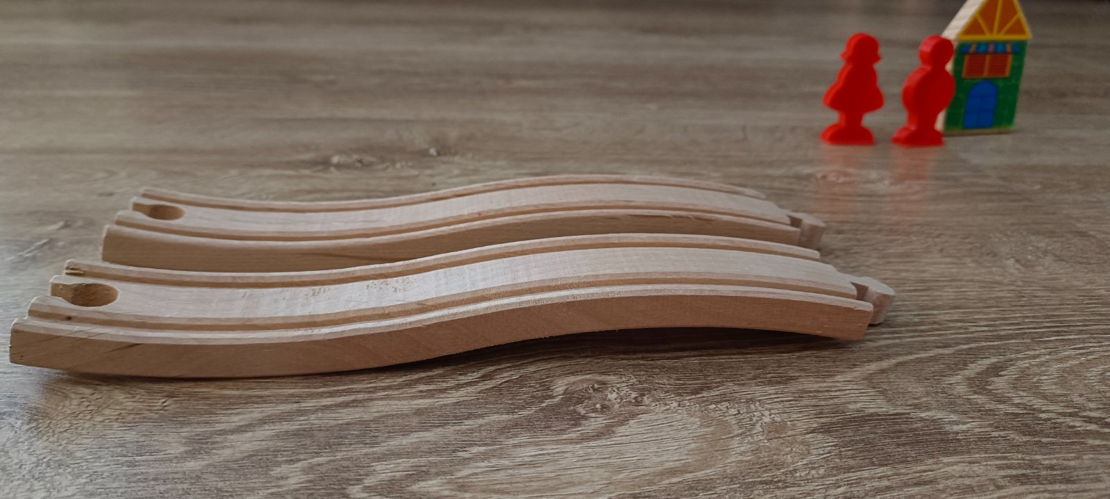 Krásna drevená vlačiková zostava zn.Carousel. Super sa s ňou zahraje celá rodina. Súprava bola priebežne dokupovaná, tak niektoré drevené časti koľajnic sú tmavšie. Obsahuje 6 rôznych mostov, 3 x rušne, 5x vozňov, 1x železničný domček , 4 plastové postavičky a 4 plastove stromy, semafor, rôzne výhybky, rovné koľajnice a 2ks koľajníc s mini vyvýšením.Spolu 47 koľajníc .A bonus 2 x autíčka kompaktibilné na koľajnice.Spolu 76kusov.Vo výbornom stave.Okrem jedného vozňa a tých dvoch autičok je to ako nové. Odporúčam.Po dohode viem priviesť do BA,SC,PK,TT.