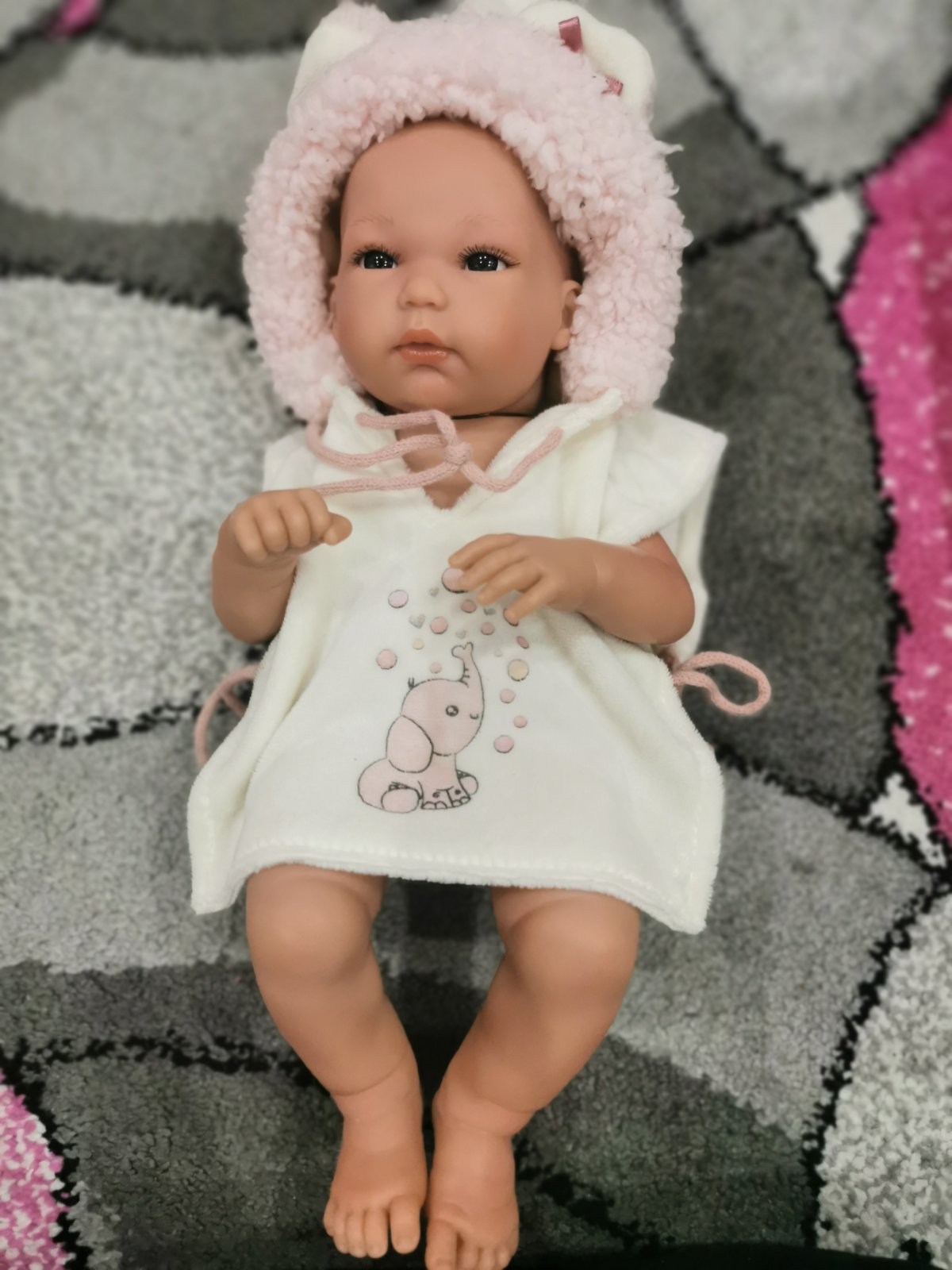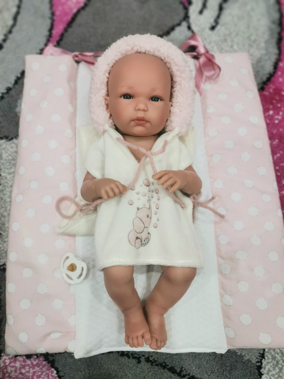 Ručne vyrobená bábika s celovinylovým telom, na ktorom sú zachytené detaily detského telíčka vrátane pohlavia. Súčasťou je aj perinka alebo podložka, cumeľ, oblečenie a ponožky ( akurát, že 1ks chýba, ešte pohľadám). materiál: vinyl, bavlna. Vyrobené v Španielsku. Mám aj originál krabicu. Bábika je v top stave, vhodná aj ako darček. Výška cca 36cm Bábika je veľmi detailne spracovaná