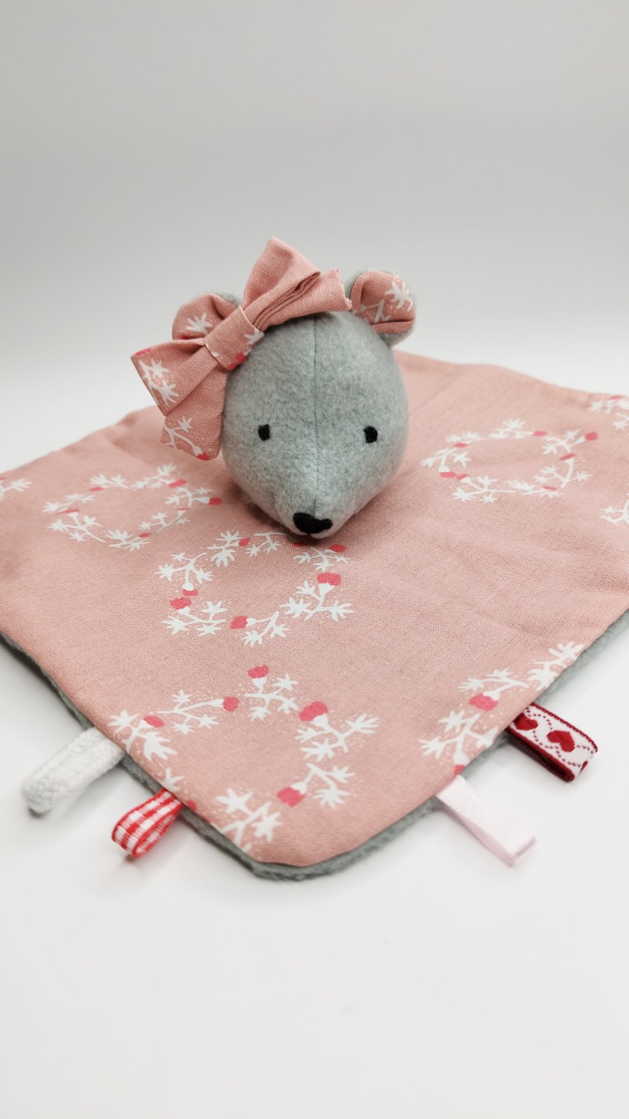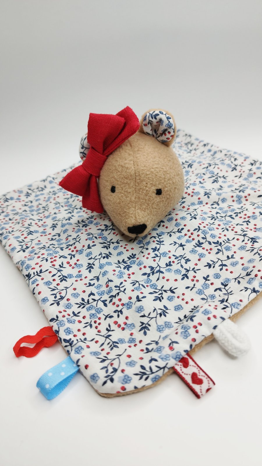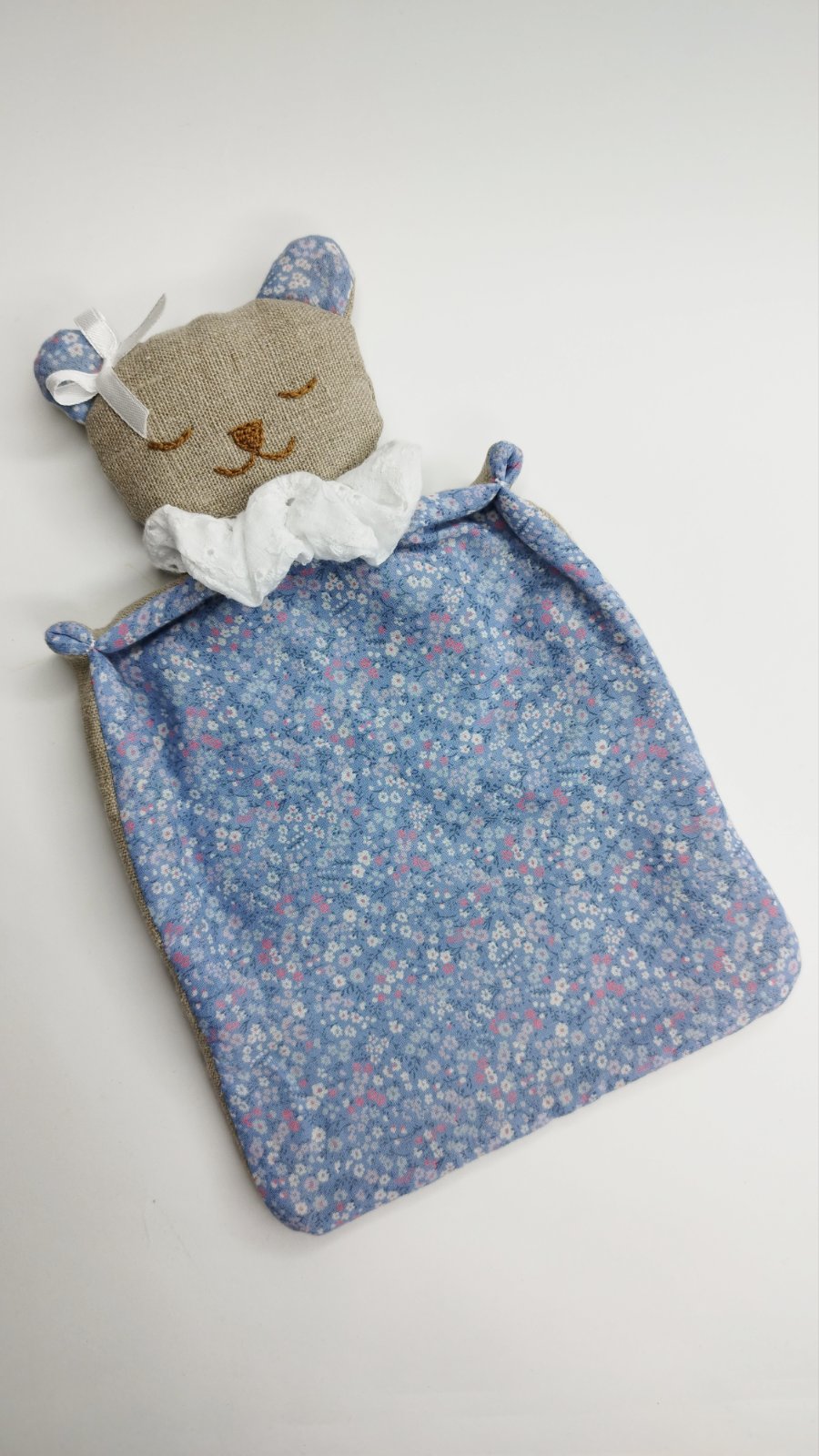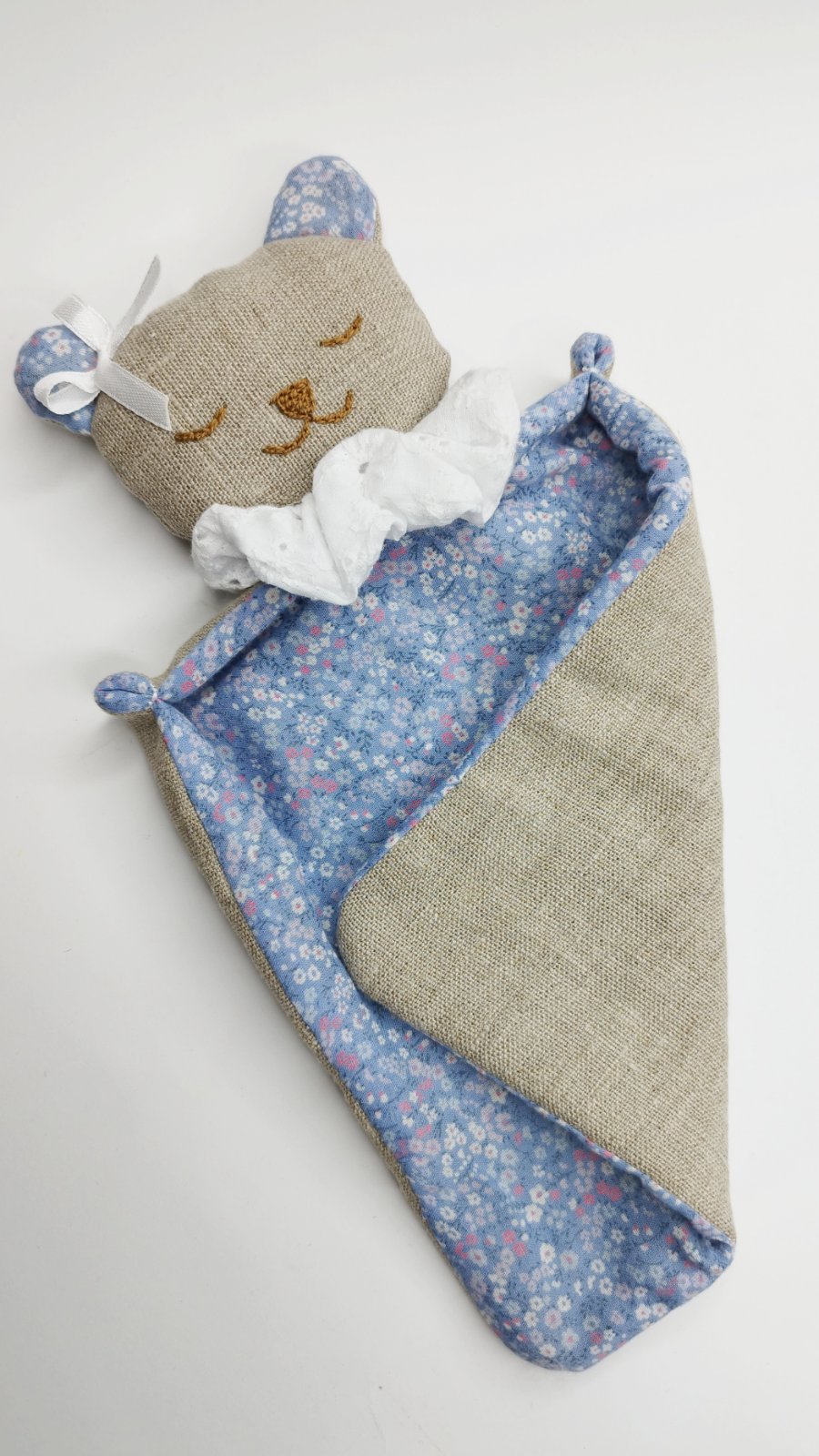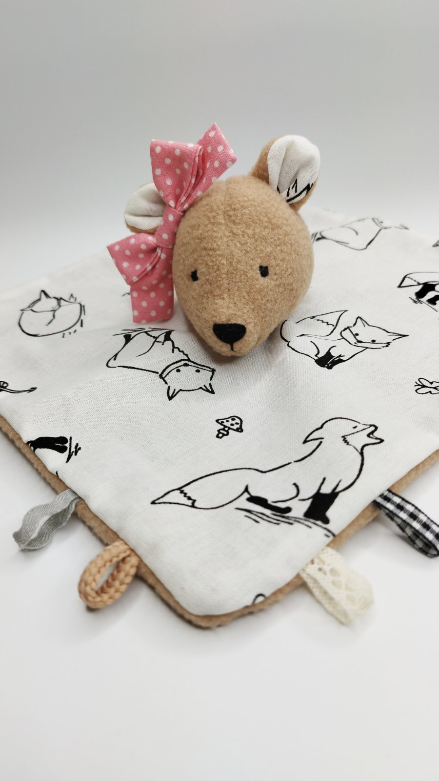 Použité materiály: kvalitný fleece antipilling, bavlnený úplet a bavlna. Fleece s úpravou antipilling zabraňuje vytváraniu tzv. žmolkov. Hlavička je 3D a je vyplnená dutým vláknom s nachádza sa strede štvorca, po obvode štvorca sú ozdobné stužky. Mojkáčiky sú šité strojom, tvárička je ručne výšivaná.