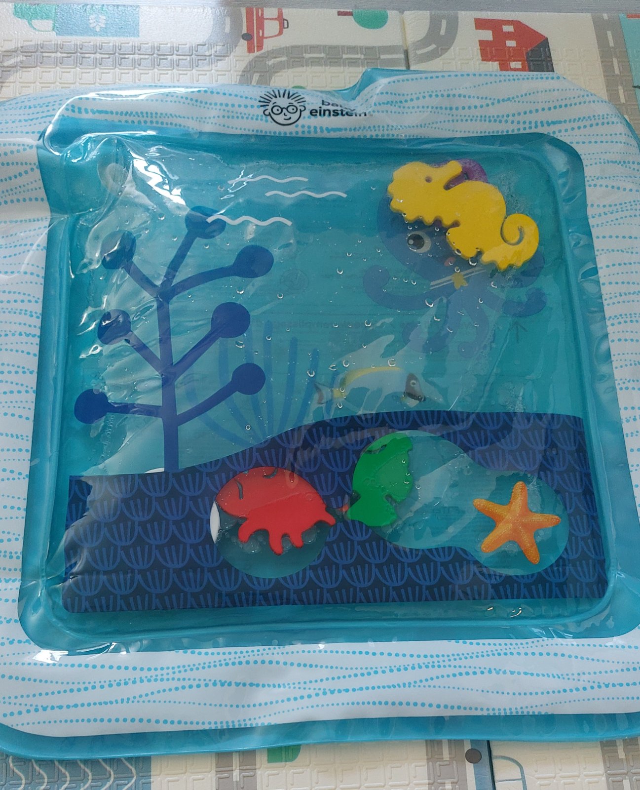 Jedinečná interaktívna podložka vyrobená z kvalitného materiálu, ktorý zaručuje mimoriadnu odolnosť. Okraj podložky nafúknite a do stredu napustite vodu. Vnútri je 5 farebných vodných živočíchov, ktoré sa pod váhou dieťaťa budú pohybovať v priestore naplnenom vodou. Počas hrania na podložke sa dieťa učí používať rôzne svalové partie na udržanie rovnováhy a samostatnému pohybu. Zvyšuje tým silu a vytrvalosť nôh, paží, brucha a chrbta. Potom, čo sa dieťa dohrá, vylejte vodu a vypustite.