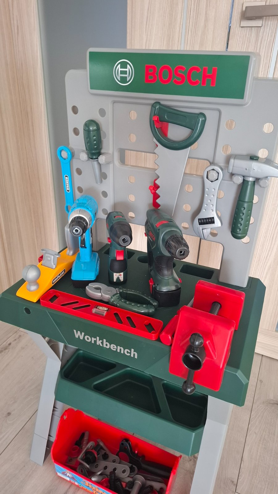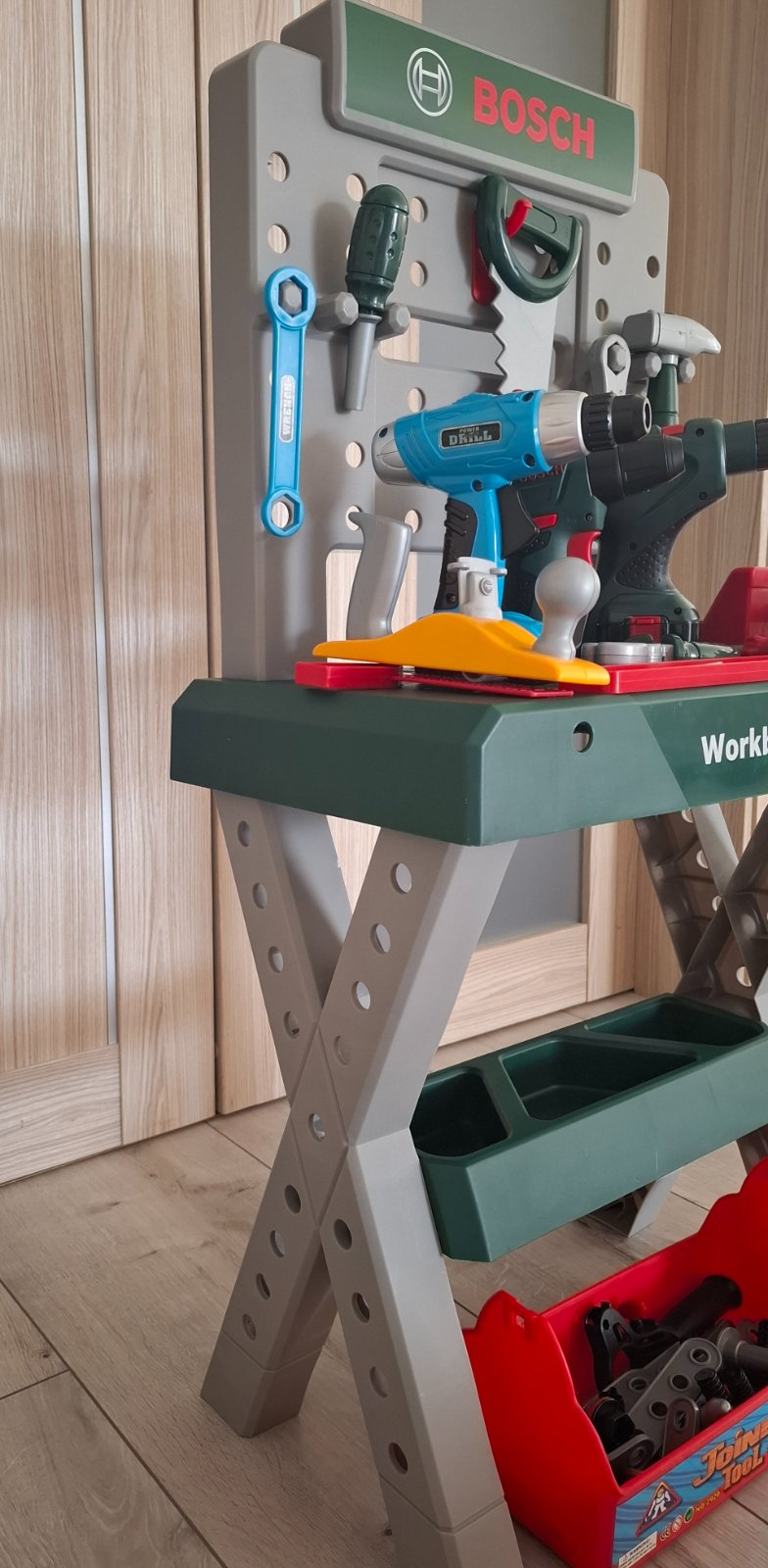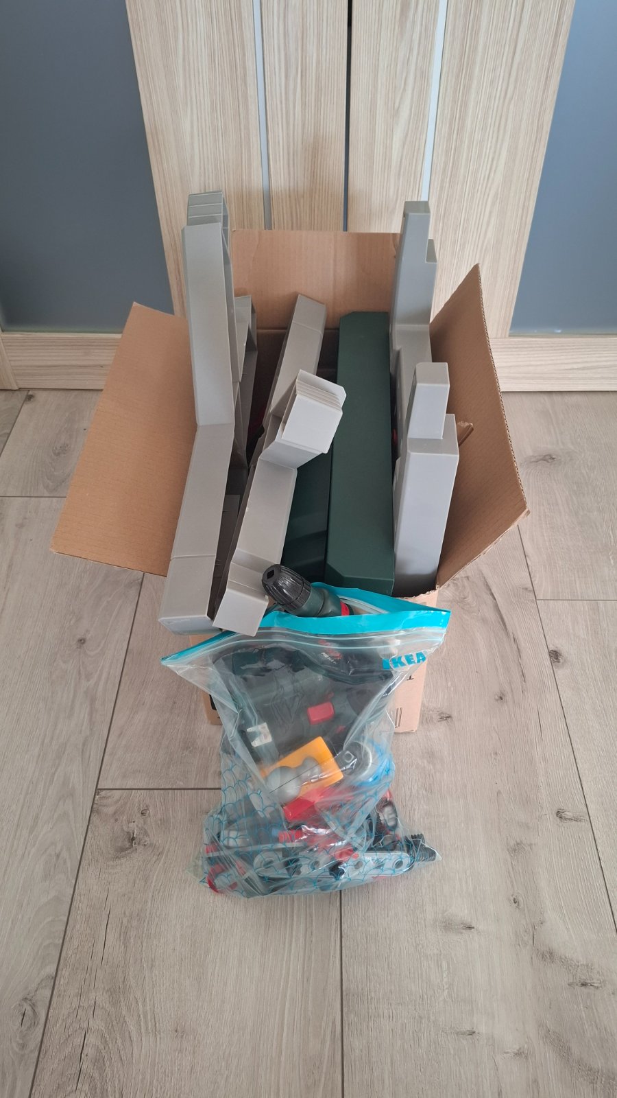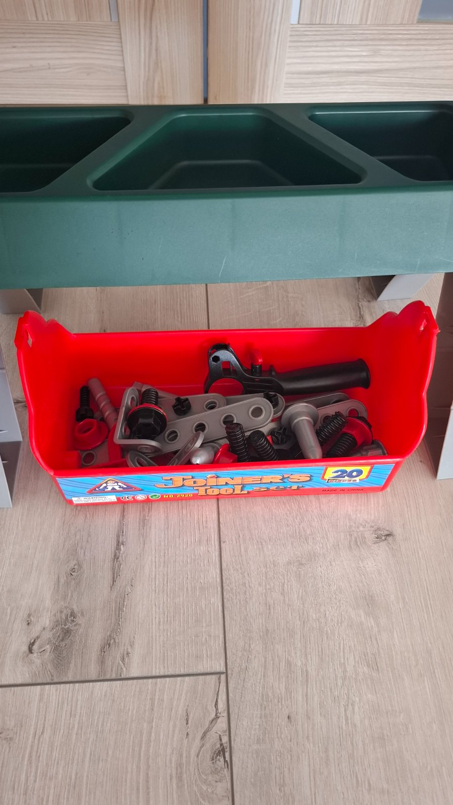 Používané a hrané, bežné známky hrania. V cene je všetko čo je na foto. Stôl je už zložený v krabici ako na poslednej foto nachystaný pre ďalšieho malého kutila :)