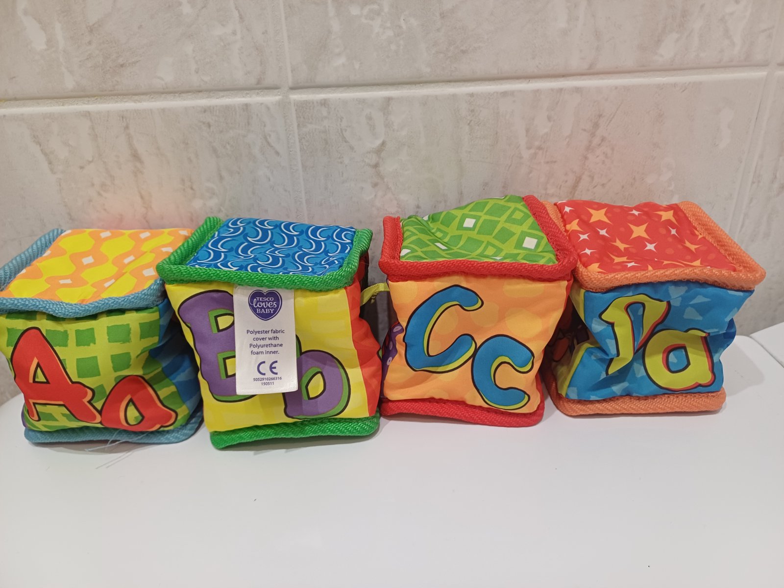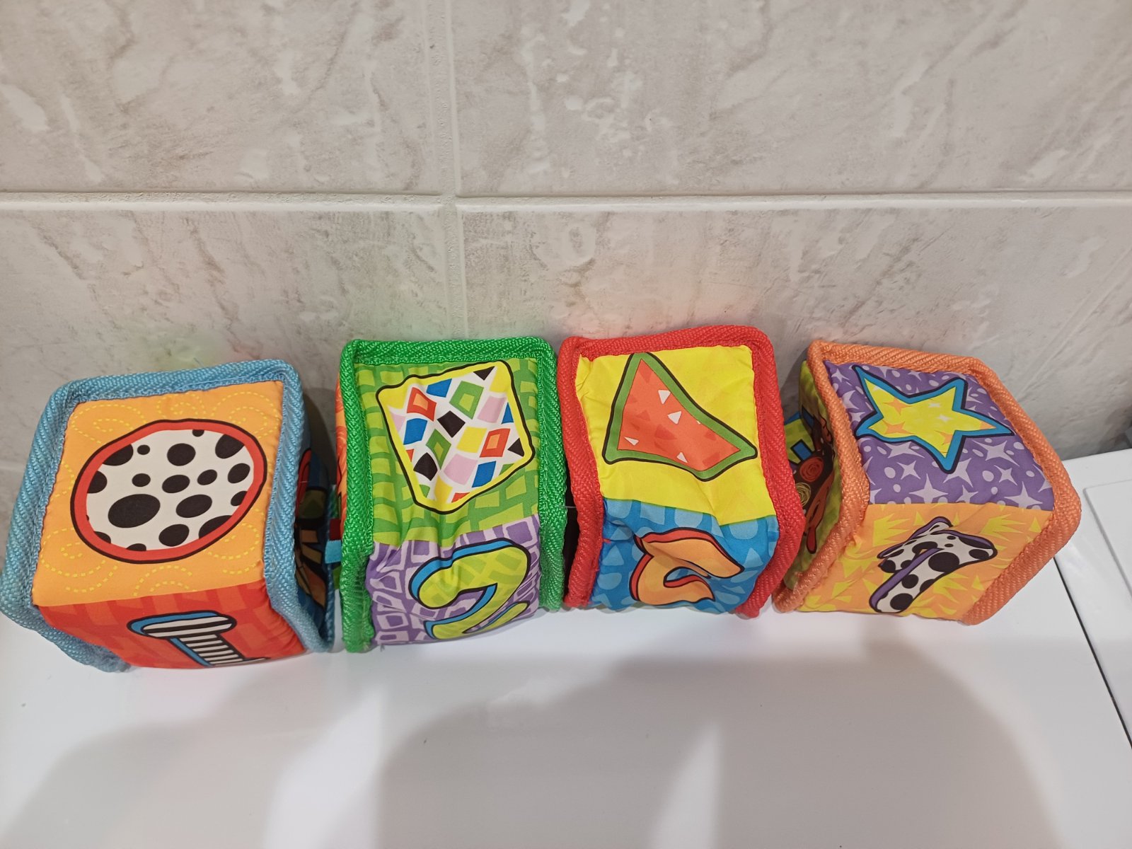 Látkové kocky pre deti od narodenia, vo vnútri rolničky. Hrané, nepoškodené.