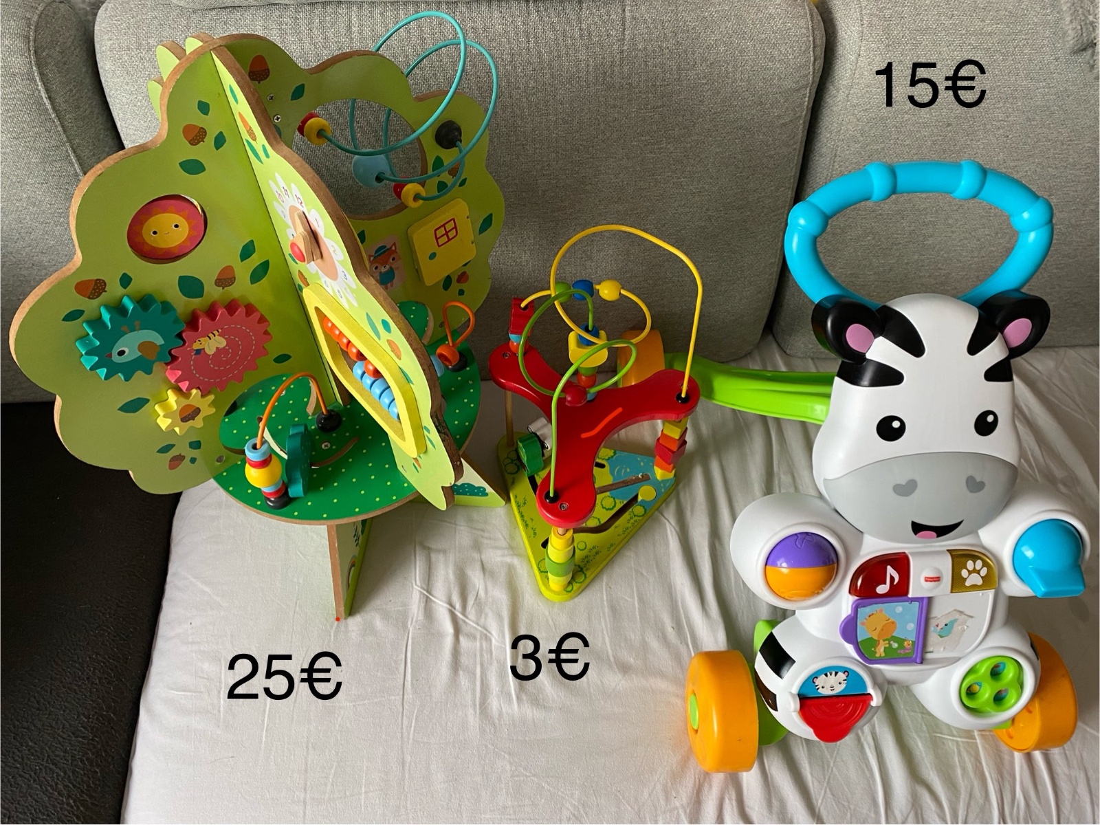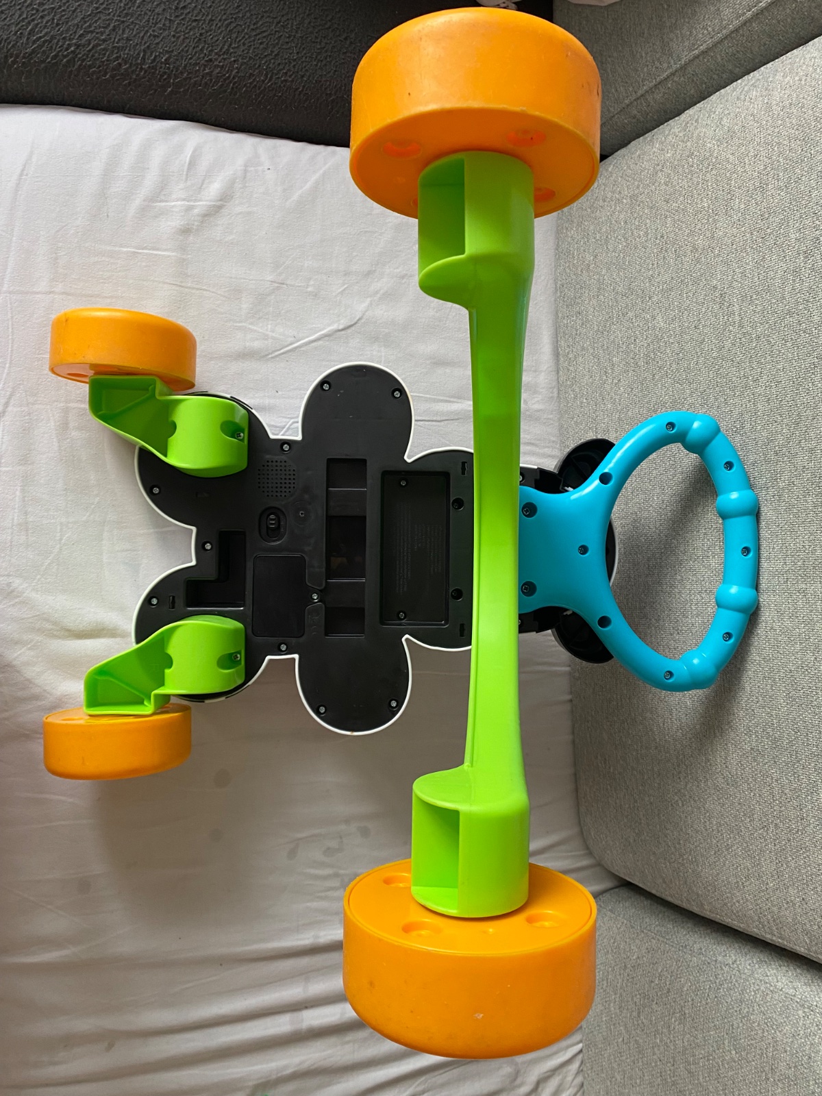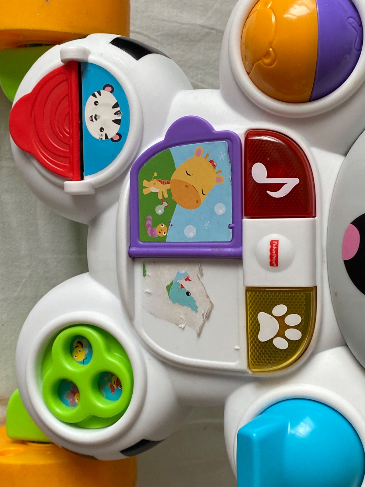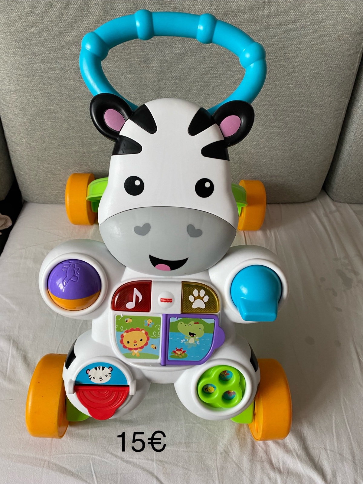 - Chodítko Fisher Price. Jedna nálepka je odlepená. Hrá pri pohybe. Cena 15€.