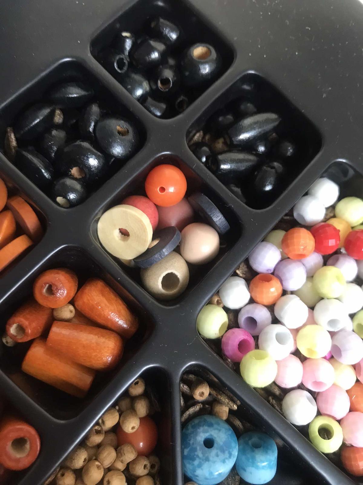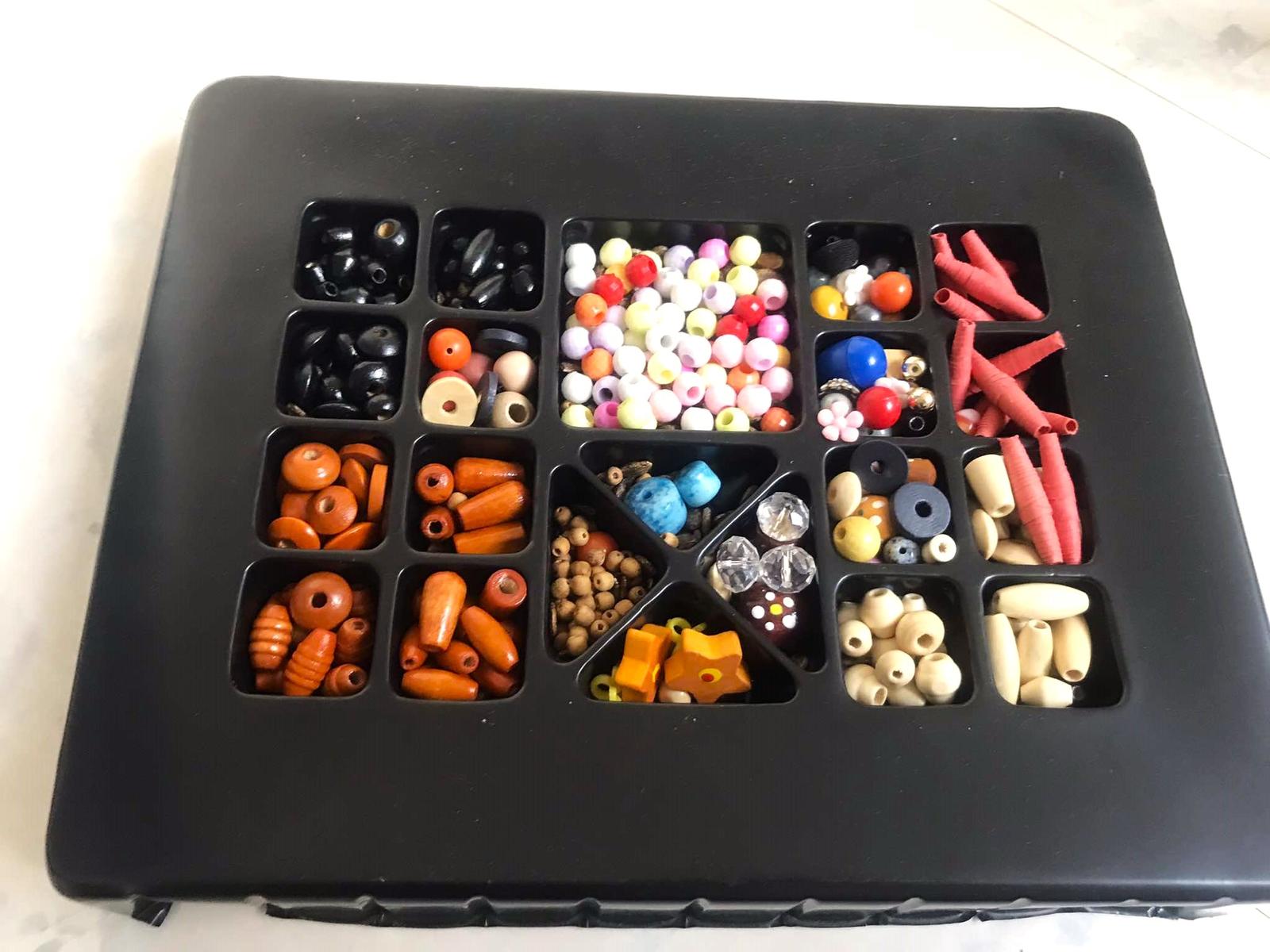používaná bohatá sada koráliek na navliekanie,drevené a plastové,výborná pomôcka pre deti pre pestovanie drobnej motoriky, 25 x 20 cm