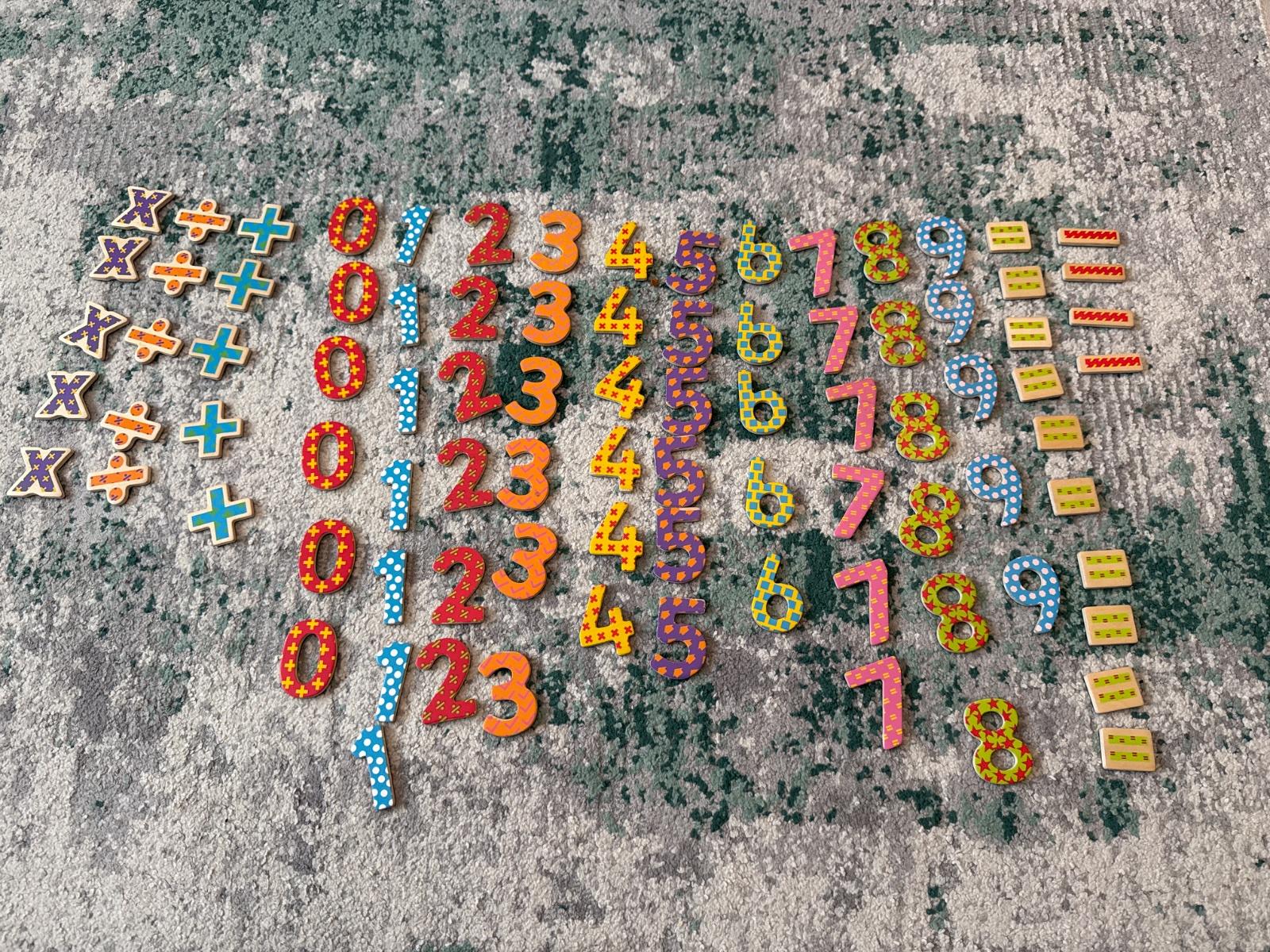 Ucenie sa matematiky hravou formou. Na magnet. K dispozicii co je na obrazku. Aj znamienka.