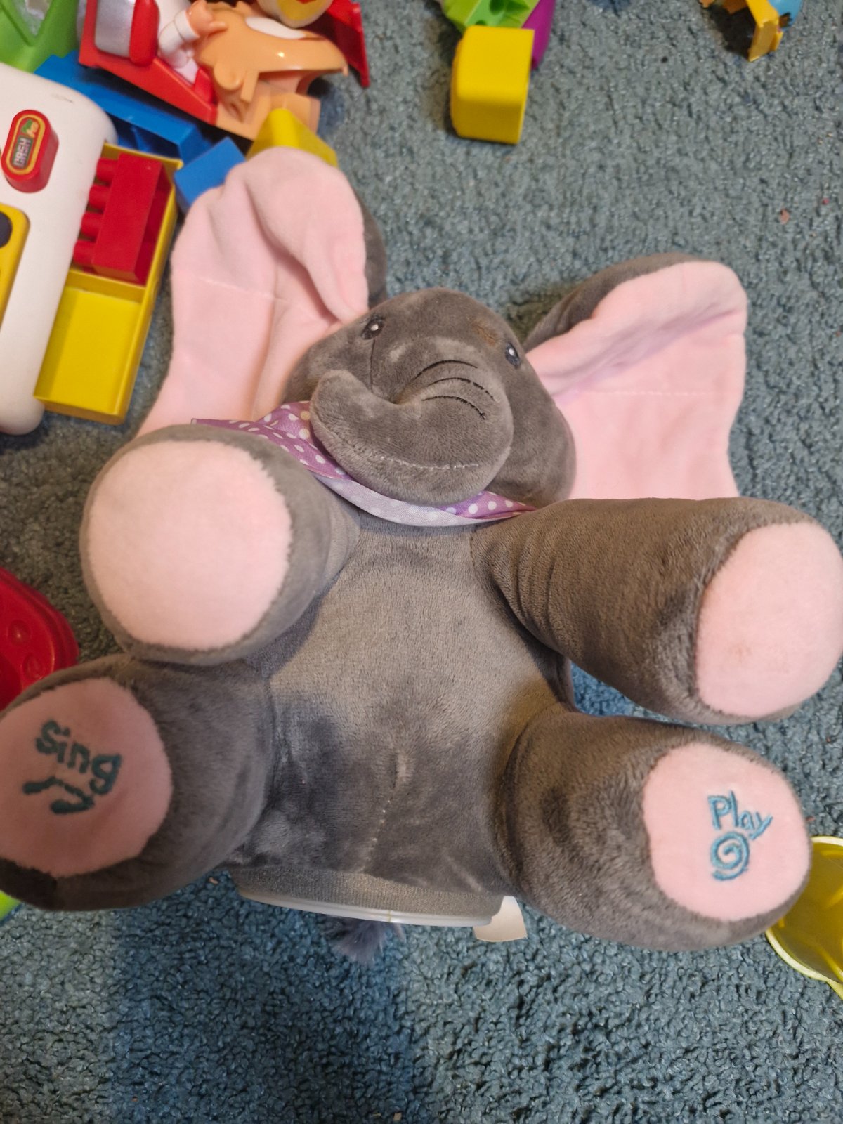 Slonik vydava melodiu, hra s dietatom skryvacku. Ma pohyblive uši. Ohne uska akoze sa skryje a vystrie uska , vykukne