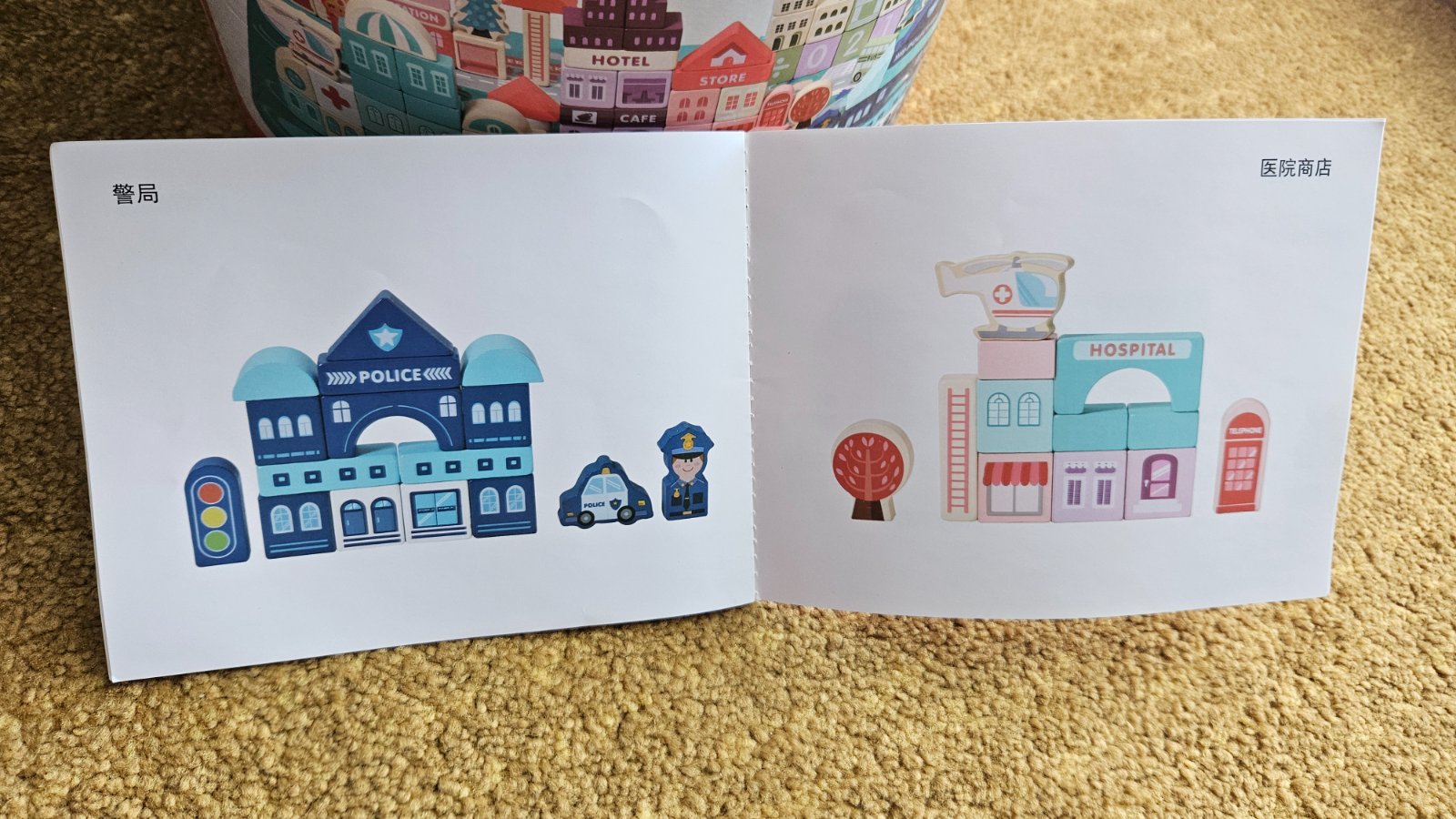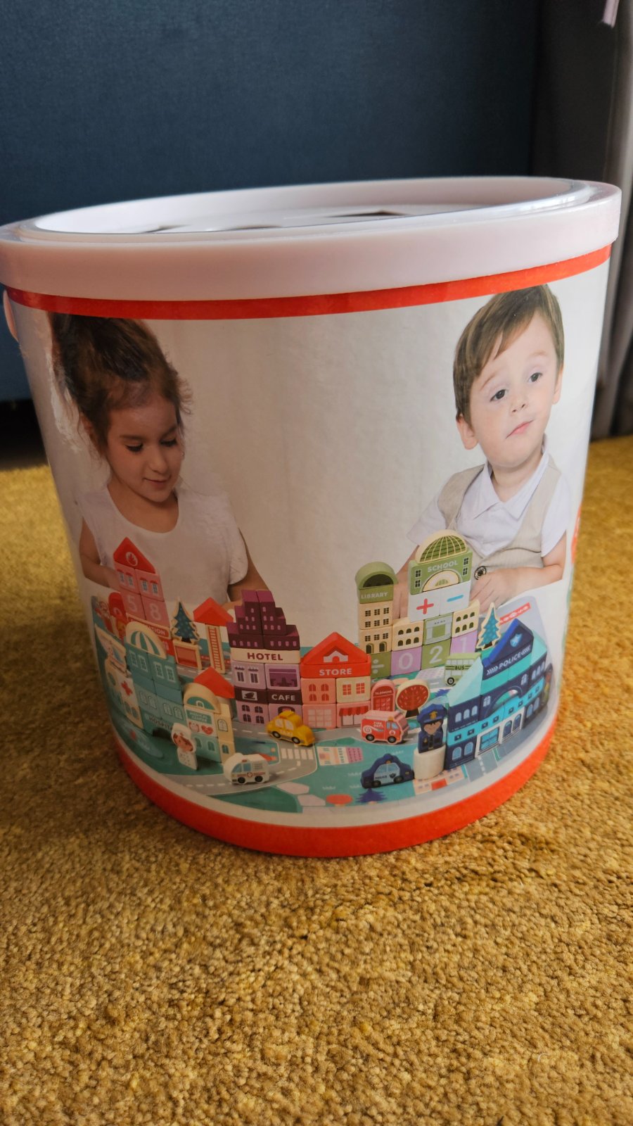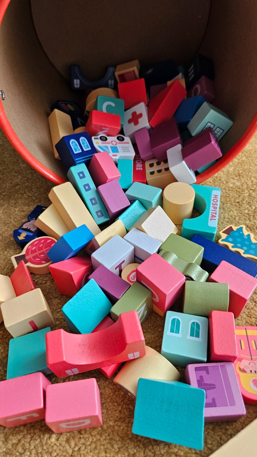 Predam drevenu stavebnicu mesto. Top stav, ziadne poskodenia, kocky boli vybrate z vedierka asi 3x, vhodne aj ako darcek. Sucastou je aj puzzle podlozka z 20 dielikov (prilozene pravitko 30cm), z ktorej si dieta moze vytvorit mesto. Taktiez je prilozeny aj letacik s obrazkami, podla ktorych moze dieta stavat jednotlive budovy. Vrchnak vedierka mozno pouzit aj na vkladanie kociek.