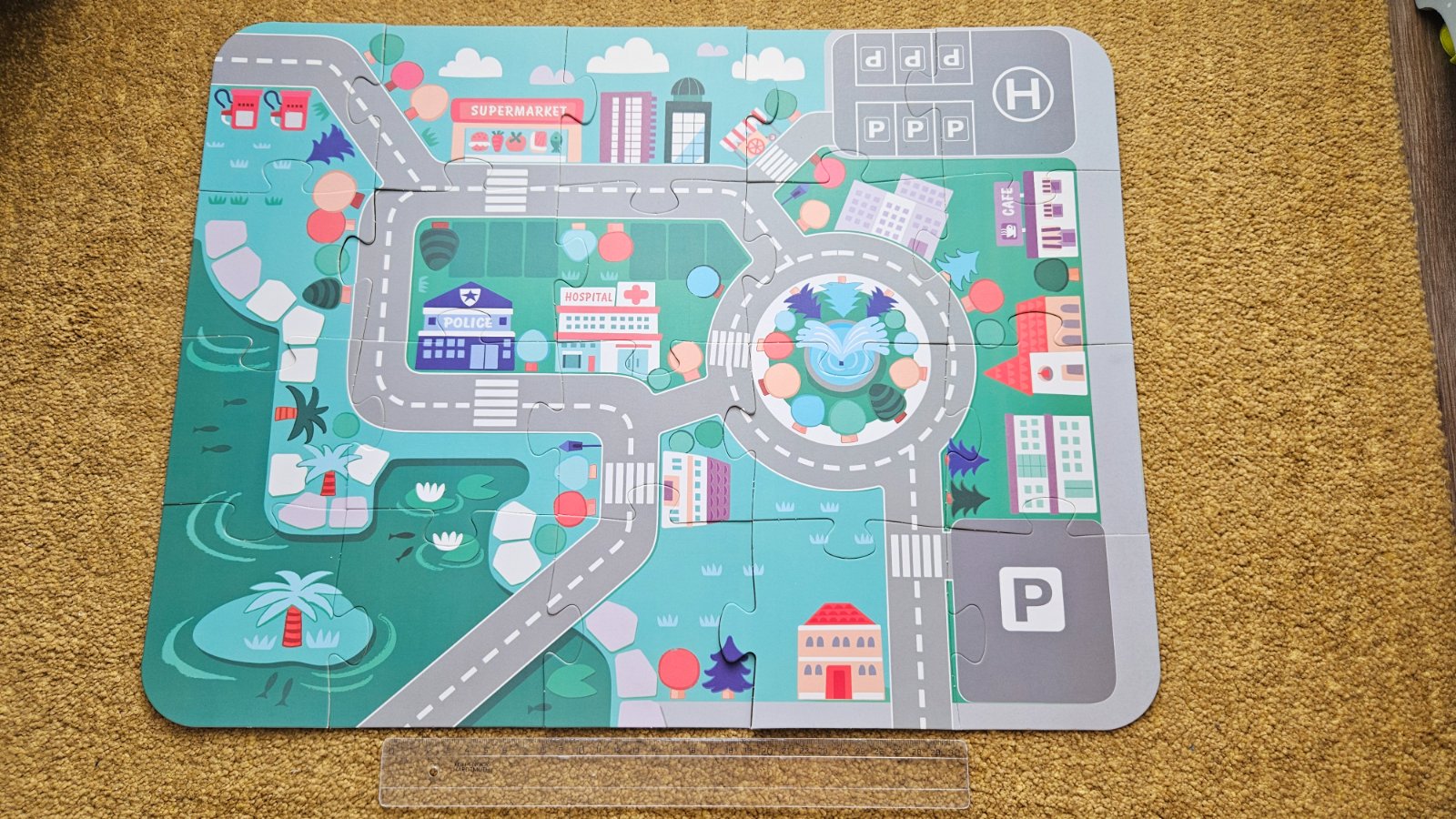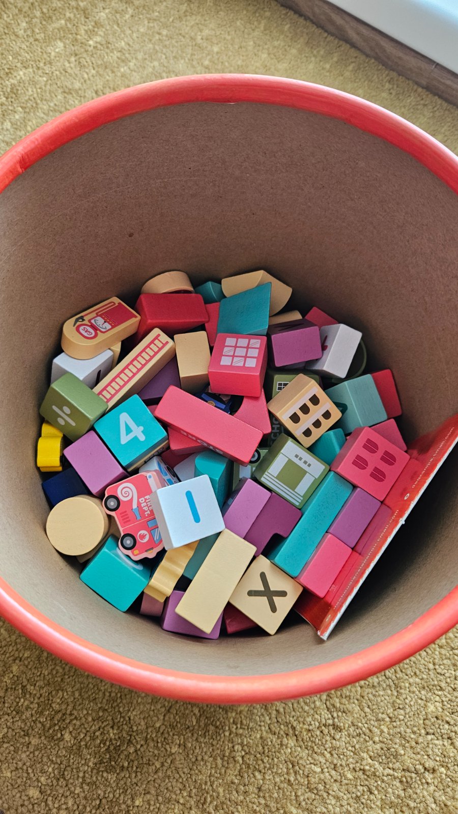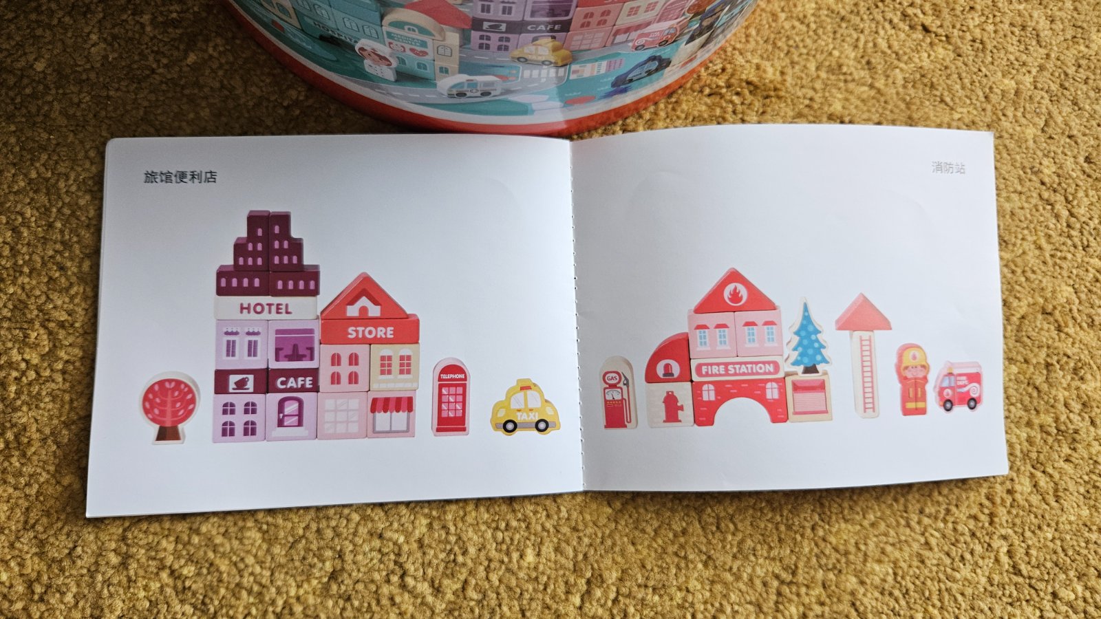 Predam drevenu stavebnicu mesto. Top stav, ziadne poskodenia, kocky boli vybrate z vedierka asi 3x, vhodne aj ako darcek. Sucastou je aj puzzle podlozka z 20 dielikov (prilozene pravitko 30cm), z ktorej si dieta moze vytvorit mesto. Taktiez je prilozeny aj letacik s obrazkami, podla ktorych moze dieta stavat jednotlive budovy. Vrchnak vedierka mozno pouzit aj na vkladanie kociek.