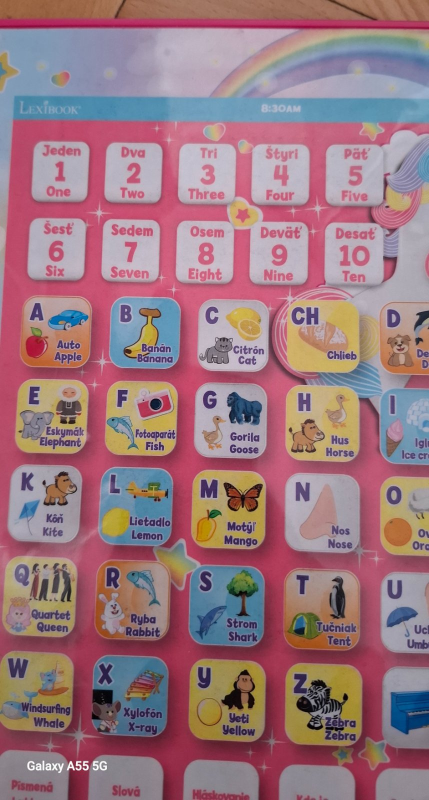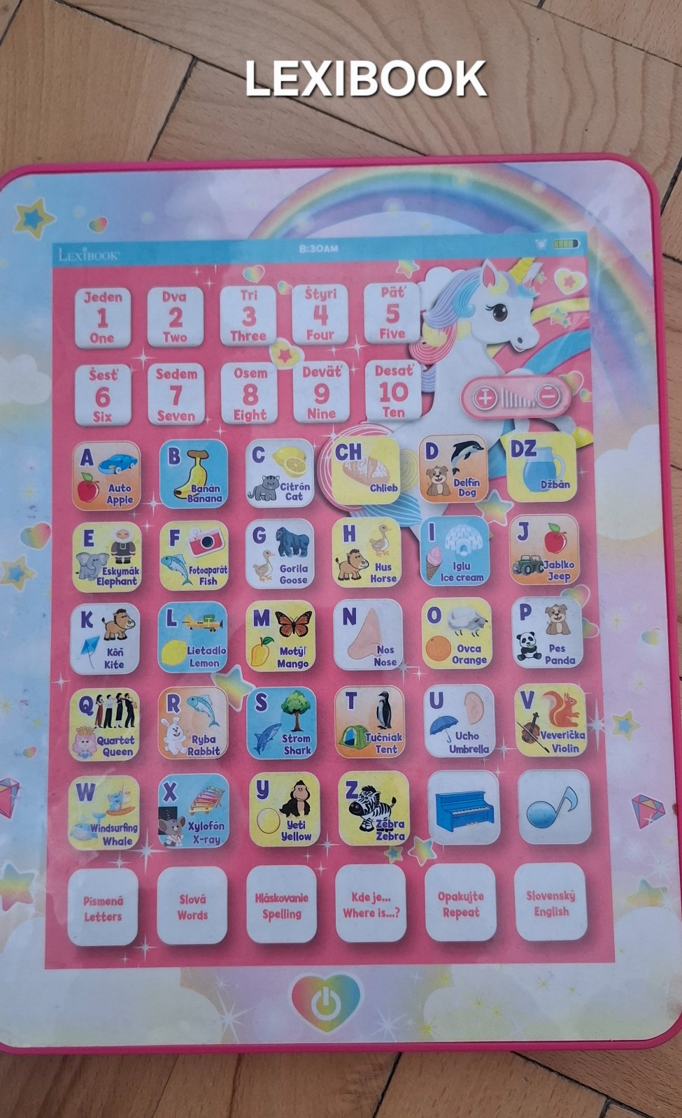 - tablet s písmenami, slovami, hláskovanie, kde je, opakujte a pomenúva čísla ,písmena a obrázky