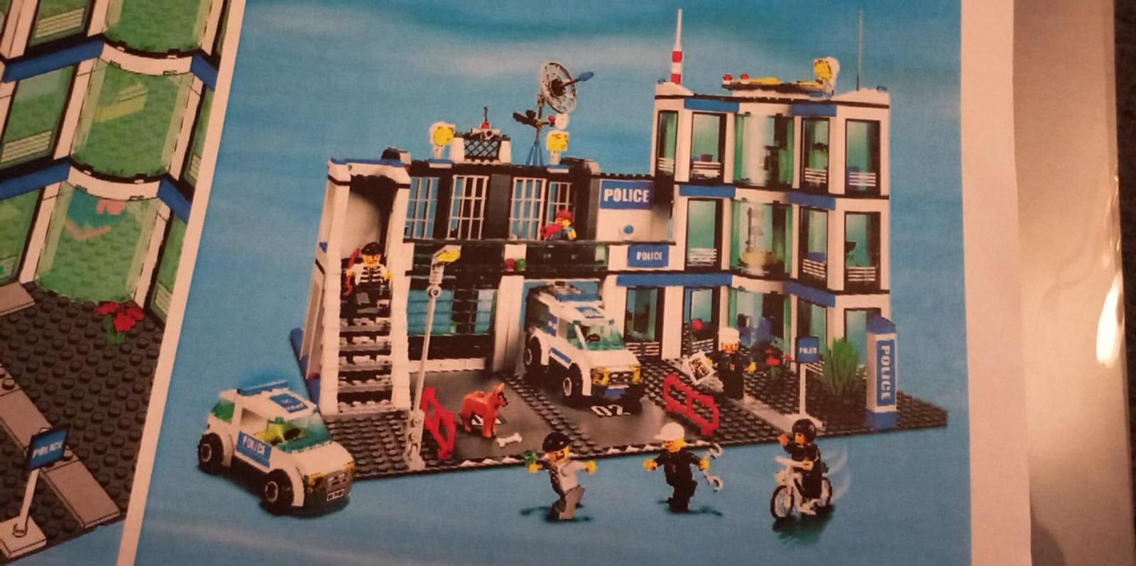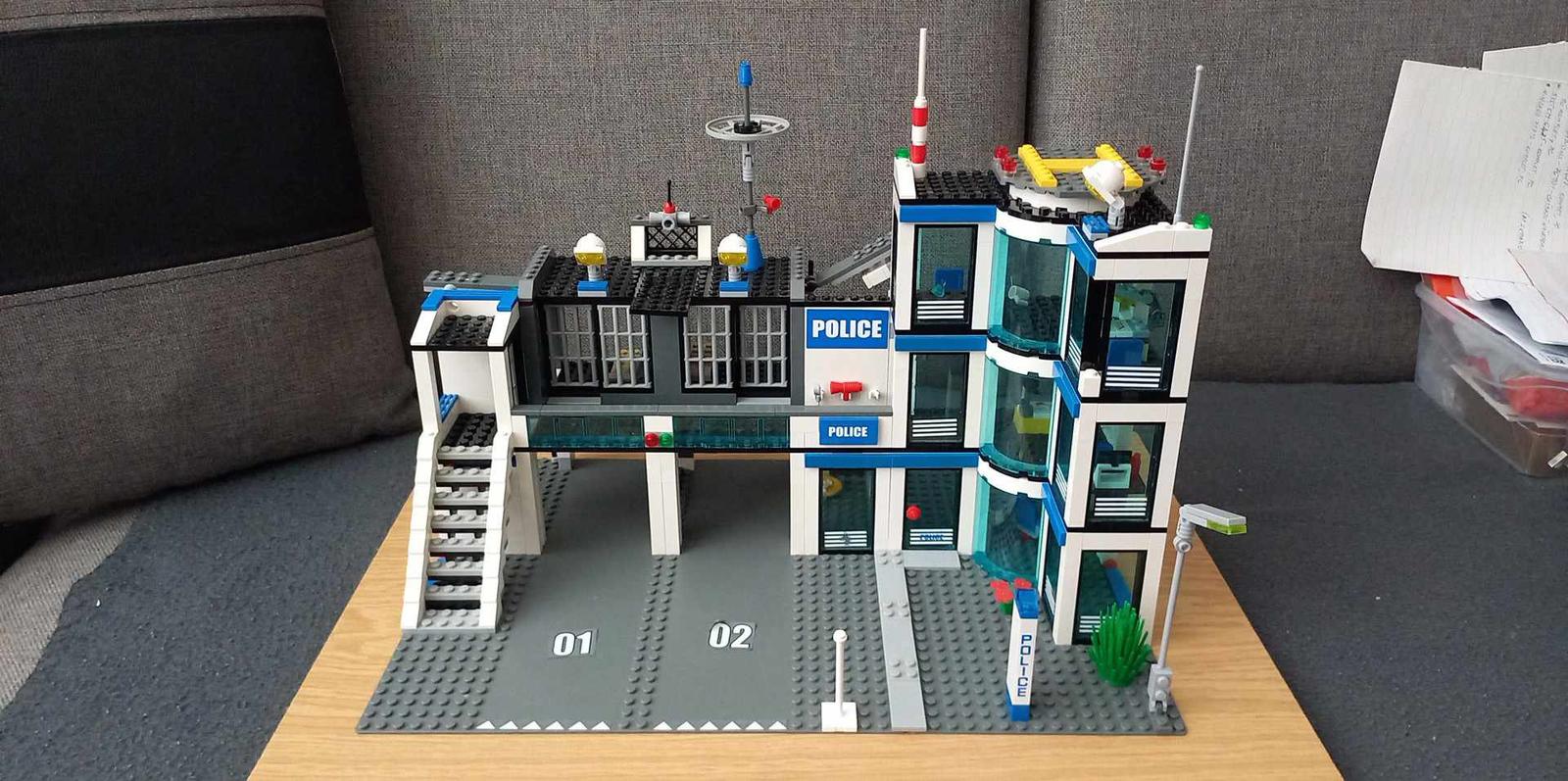 budova Policajnej stanice z lega 7498, z roku 2010, s 1 postavičkou policajta a psíka, chýbajú posuvné dvere garáží (viď foto) a červené zábrany pred budovou. Stavbu možno bez problémov používať aj bez týchto častí. Bez áut a ostatných postavičiek. Návod vytlačený z netu. Cena 50 €