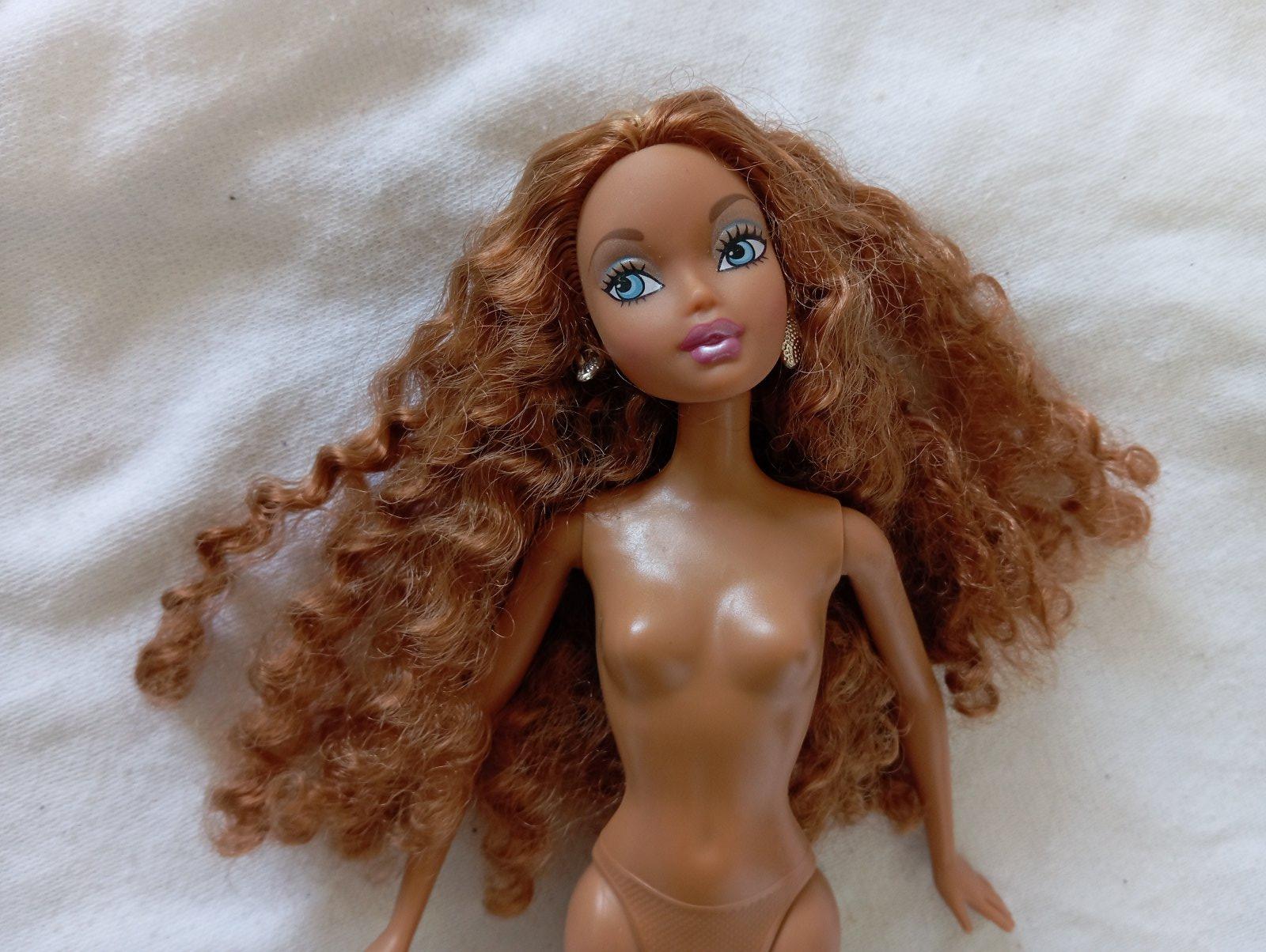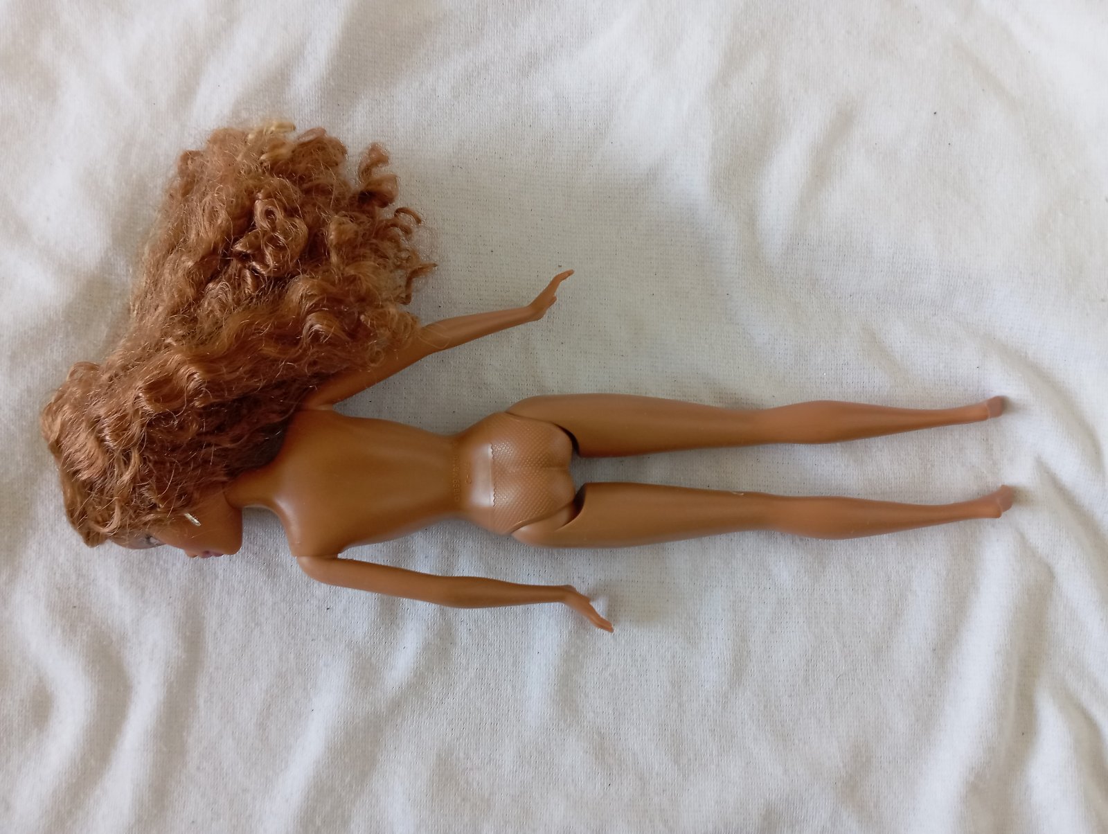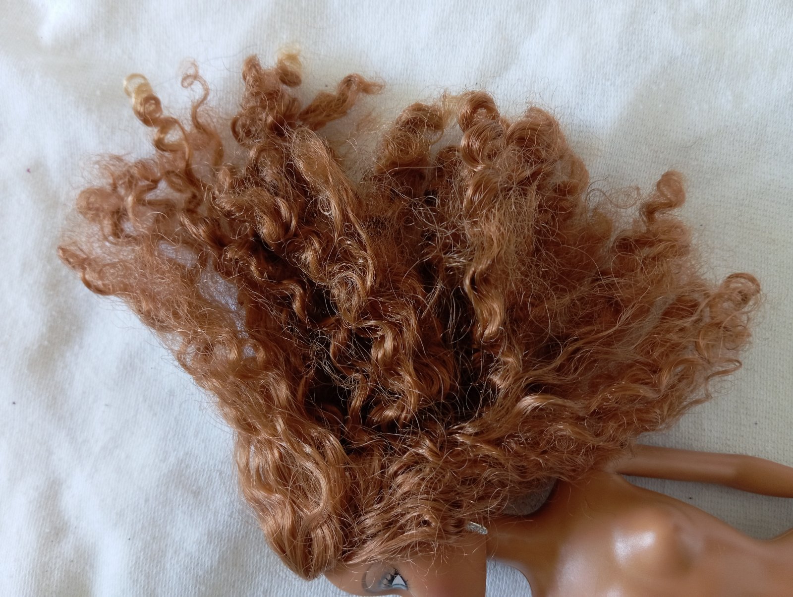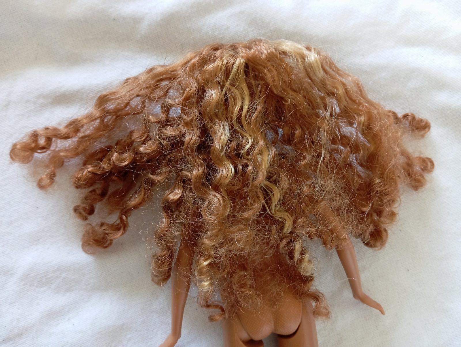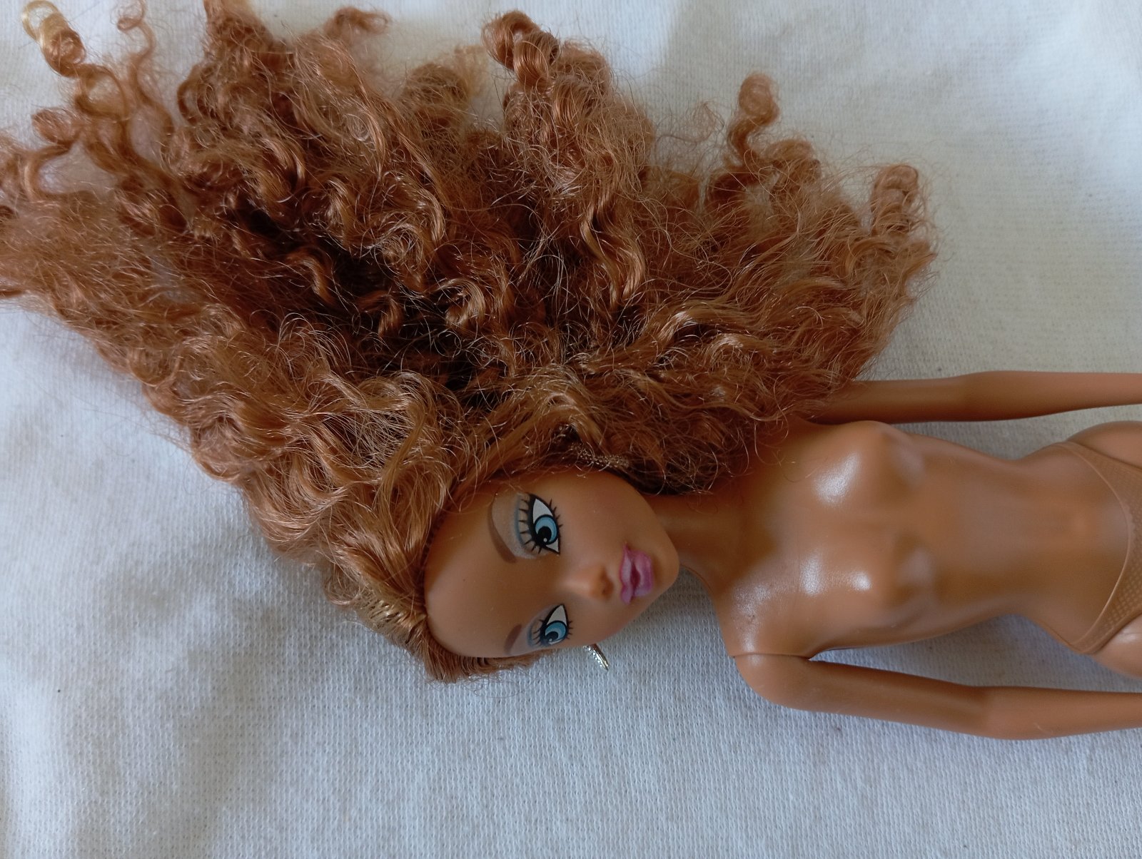 Barbie My Scene s hustými kučeravými vlasmi. Má ryšavé a hnedé pramene vlasov. Pár prameňov je blond.