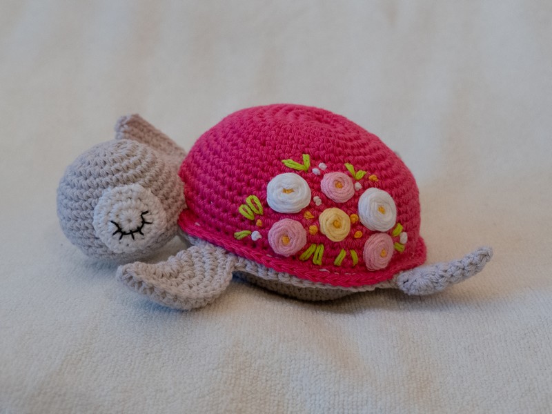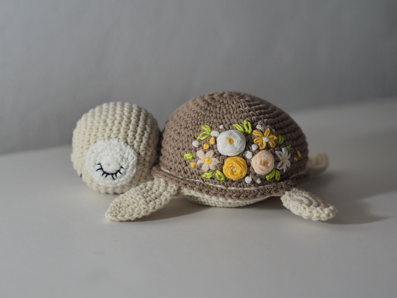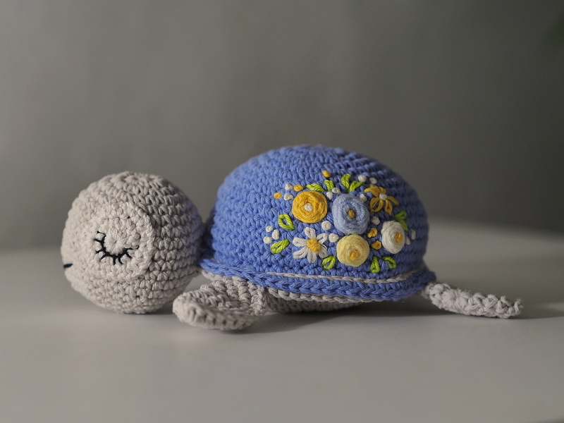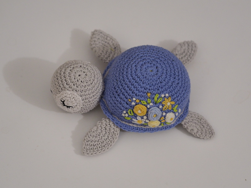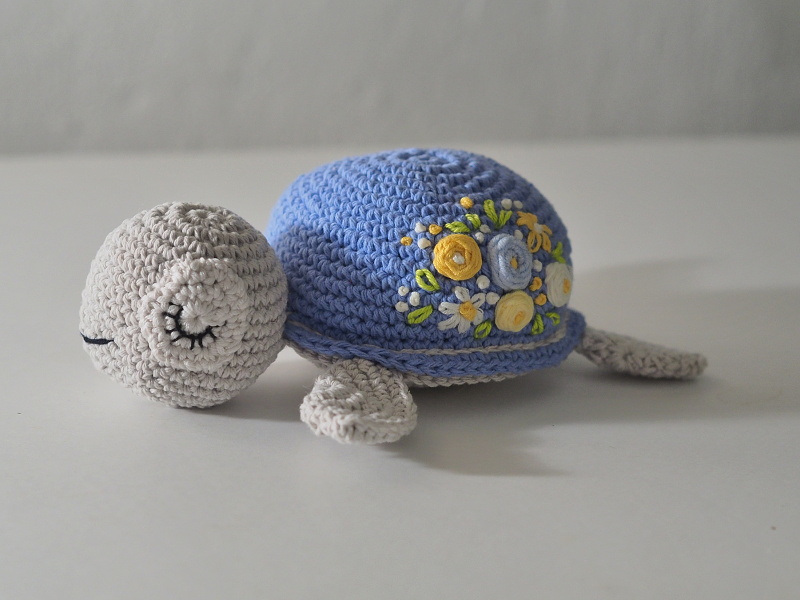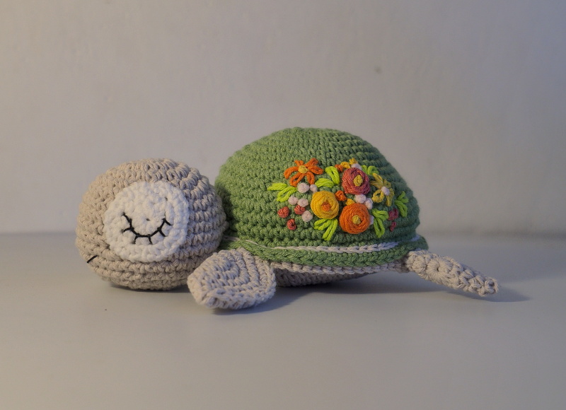 Háčkované korytnačky s vyšívanými kvietkami. Pancier podľa želania. Každá korytnačka je originál, takže kvietky sa môžu kus od kusu trochu líšiť. Výšivka je len z jednej strany, v prípade záujmu by sa dalo na druhú stranu vyšiť meno dieťatka (závisí od dĺžky mena). Cena s menom od 15 €.