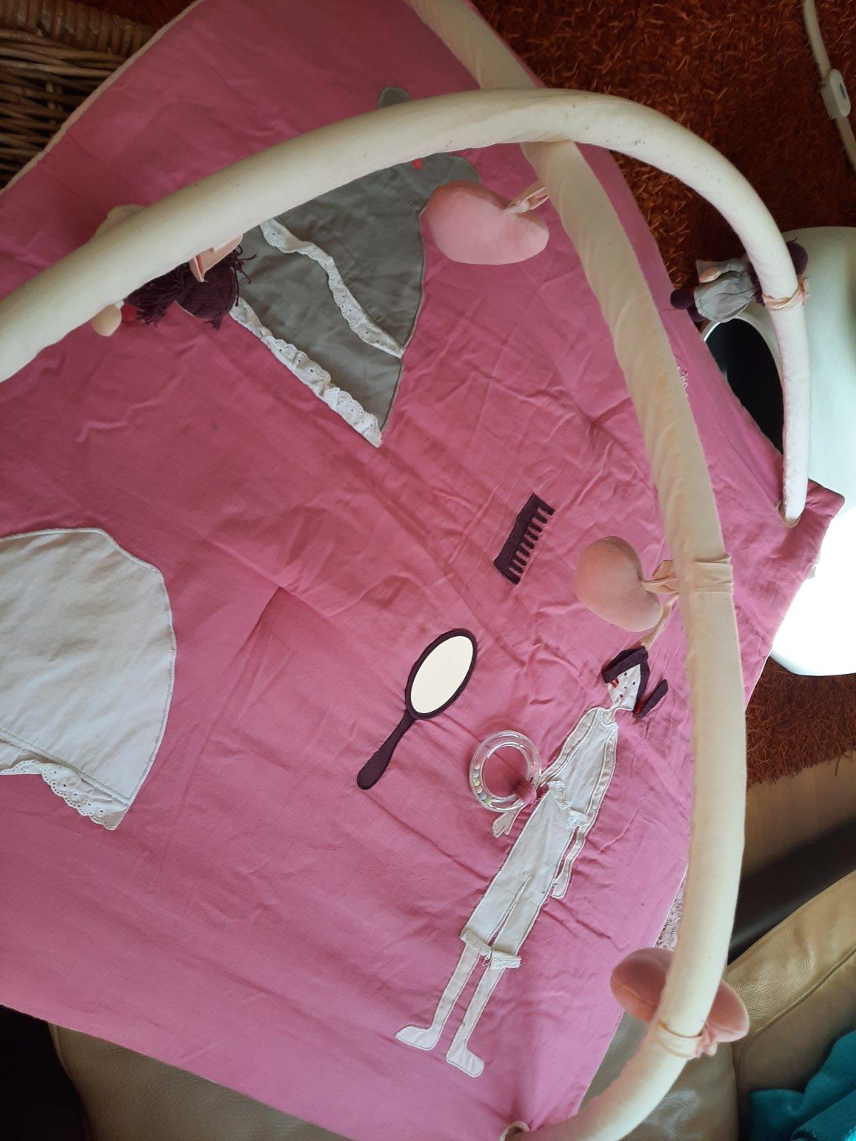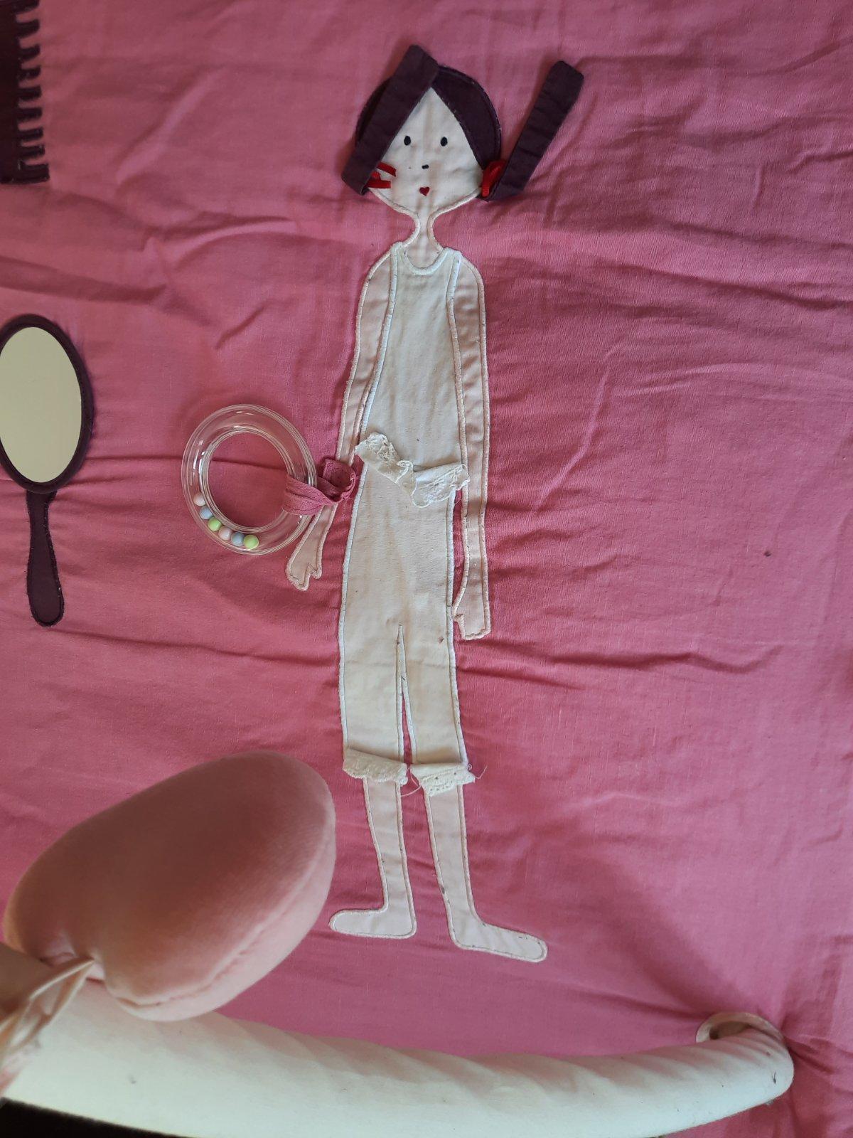 Predam značkovu decku Jacadi Paris de poupee s hrazdičkou a hrovymi prvkami‐ zrkadielko, babiky, srdiecka, hreben, hrkalka, saty s hracimi volanikmi. Obr.3 na hrazdicķe je flak- zatecene.