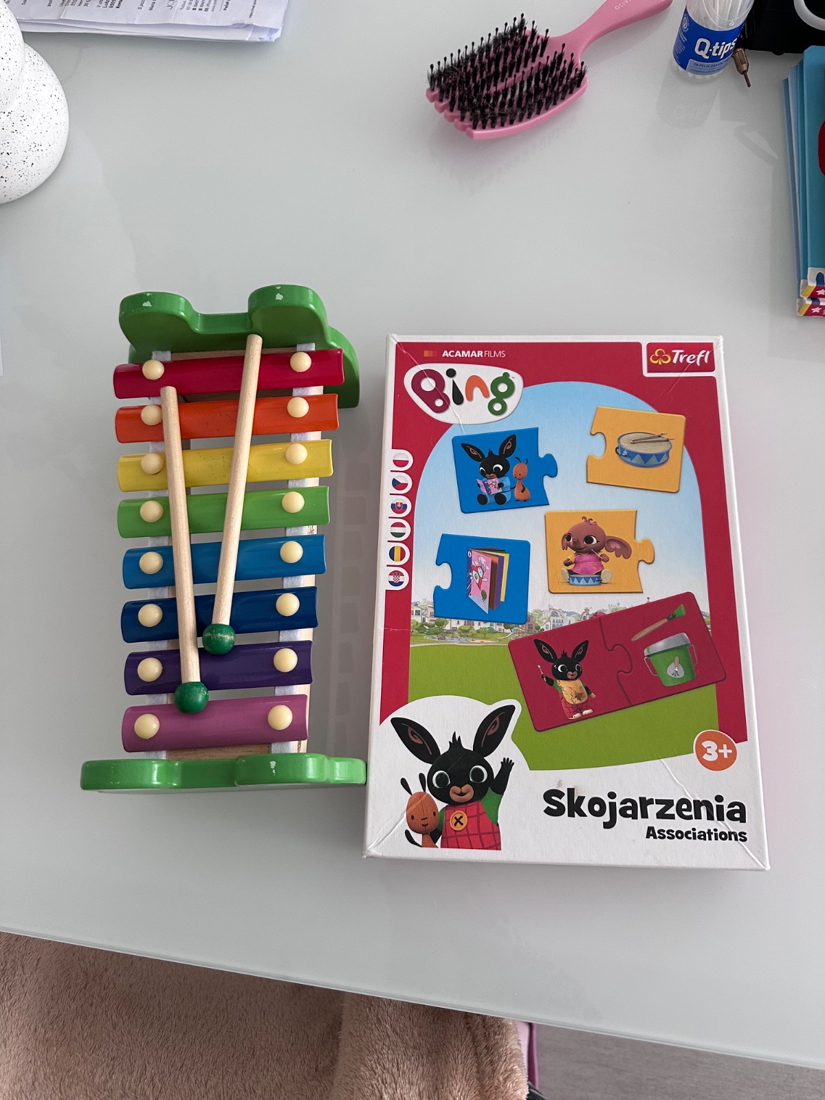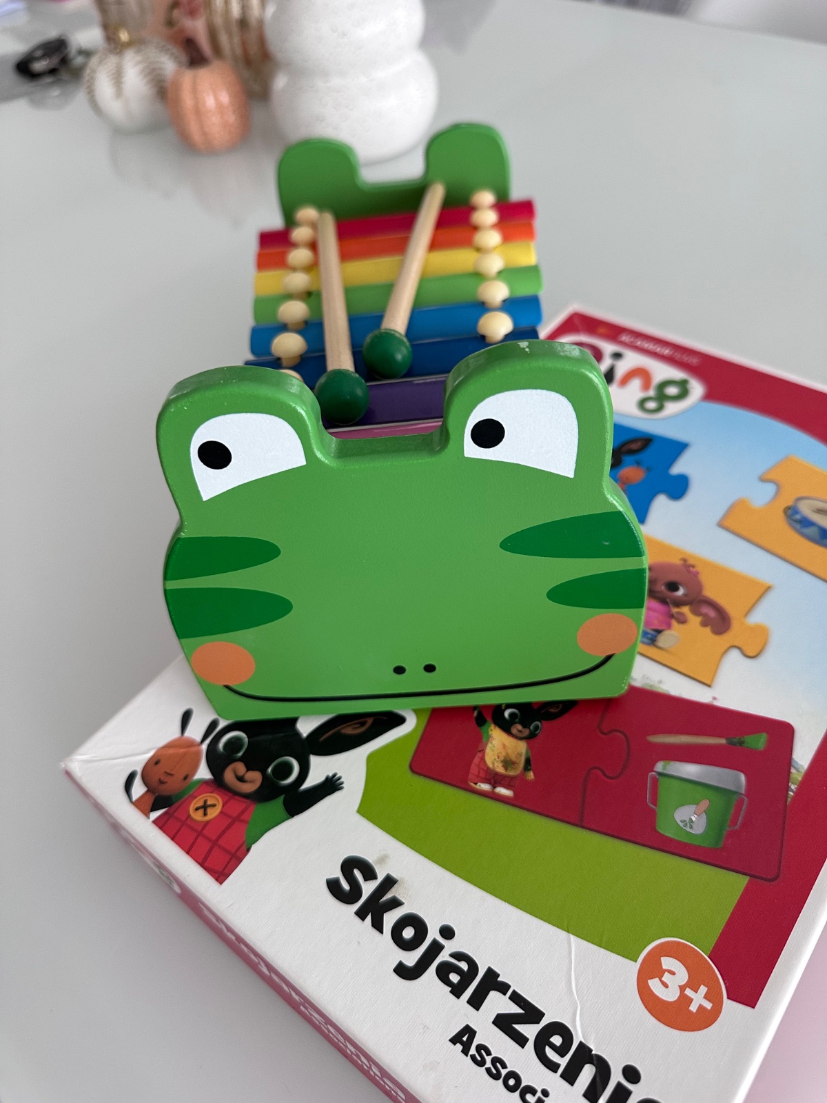 Veľmi pekný stav, xylofon funkčný, puzzle je kompletne balenie, kartičky nepoškodené.