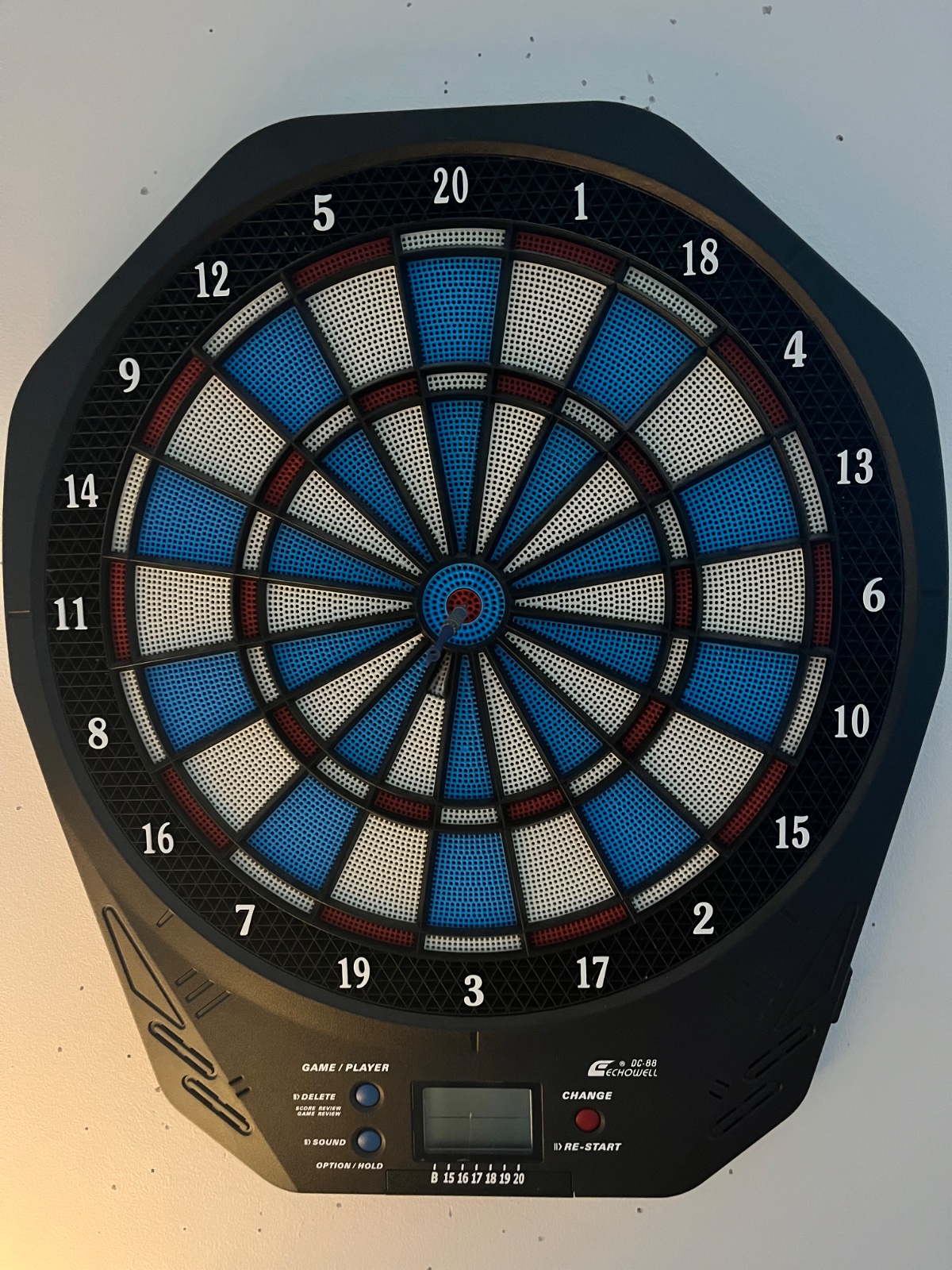 Predam elektrnicjy terc na sipky. Pouzivany, ale plne funkcny. Jedna sipka zlomena, vid foto.