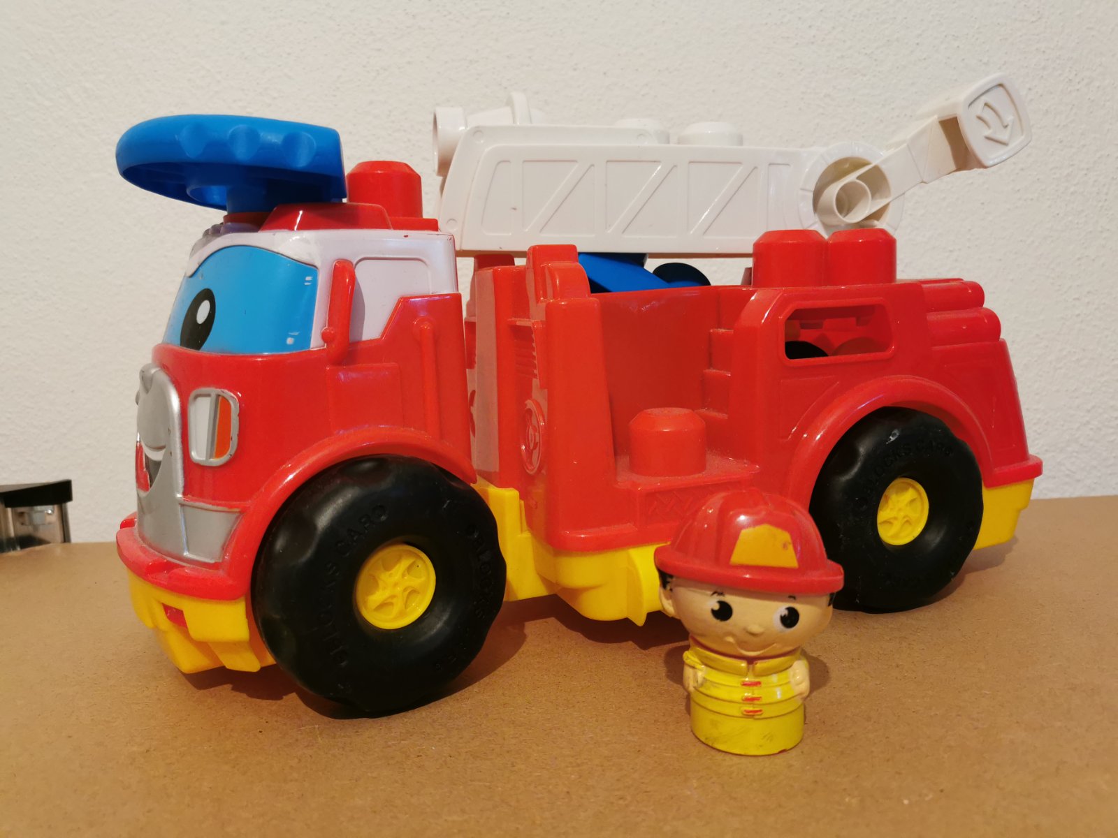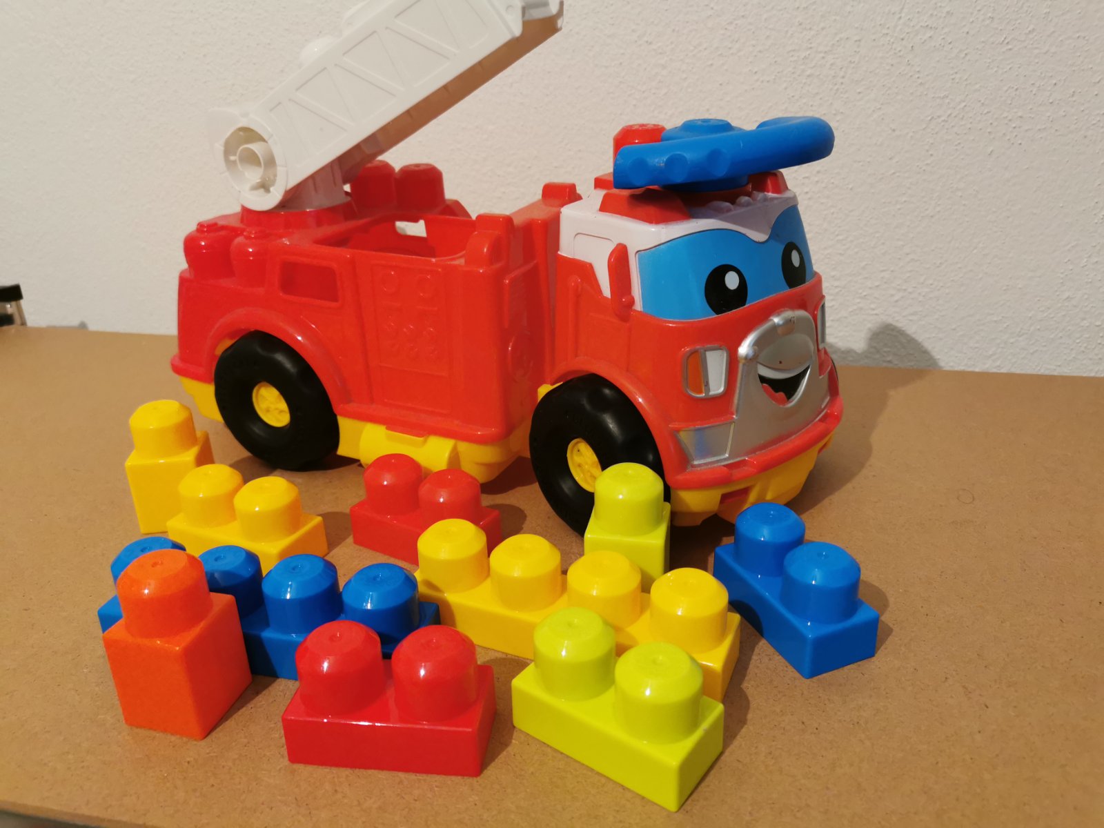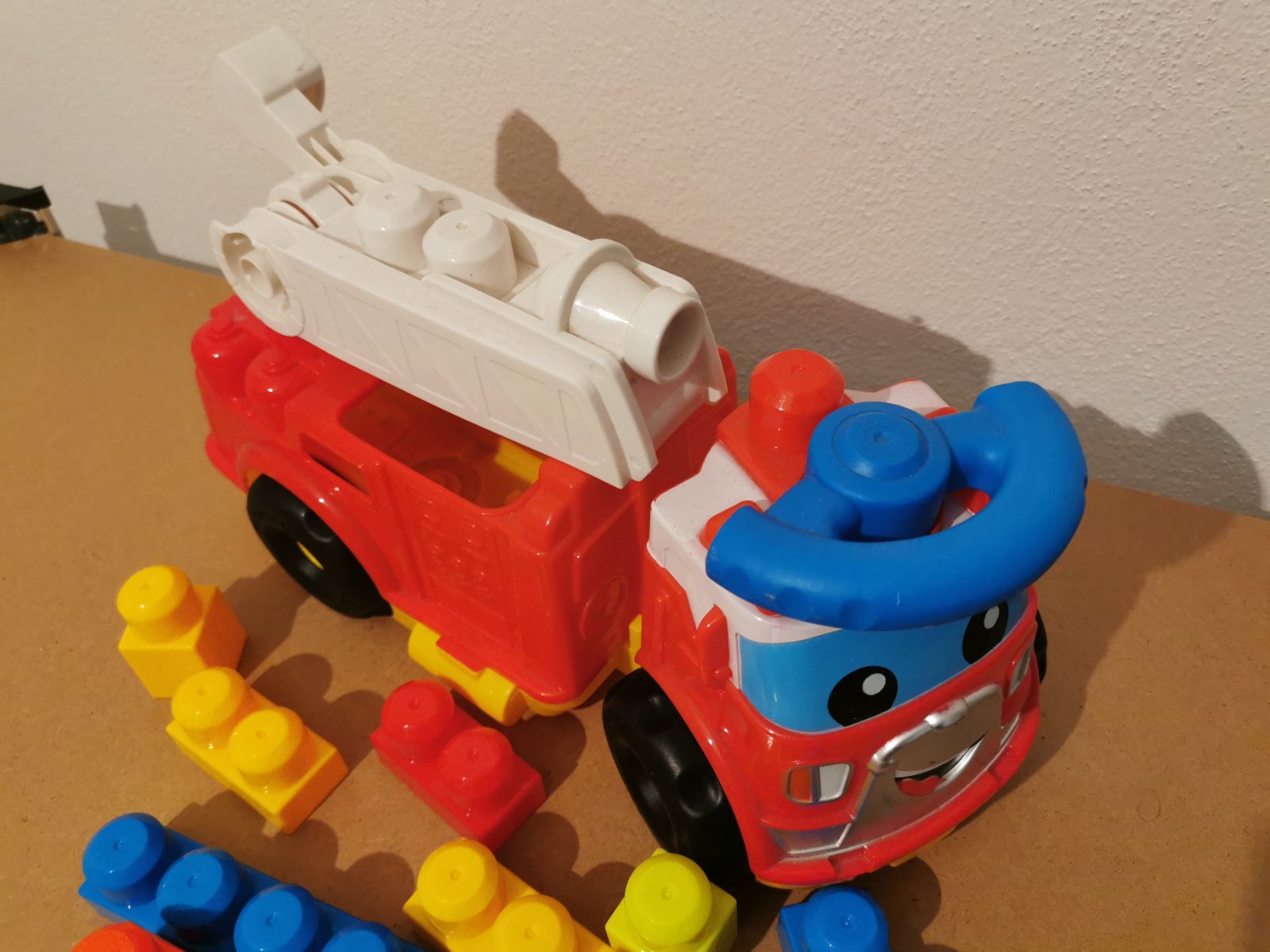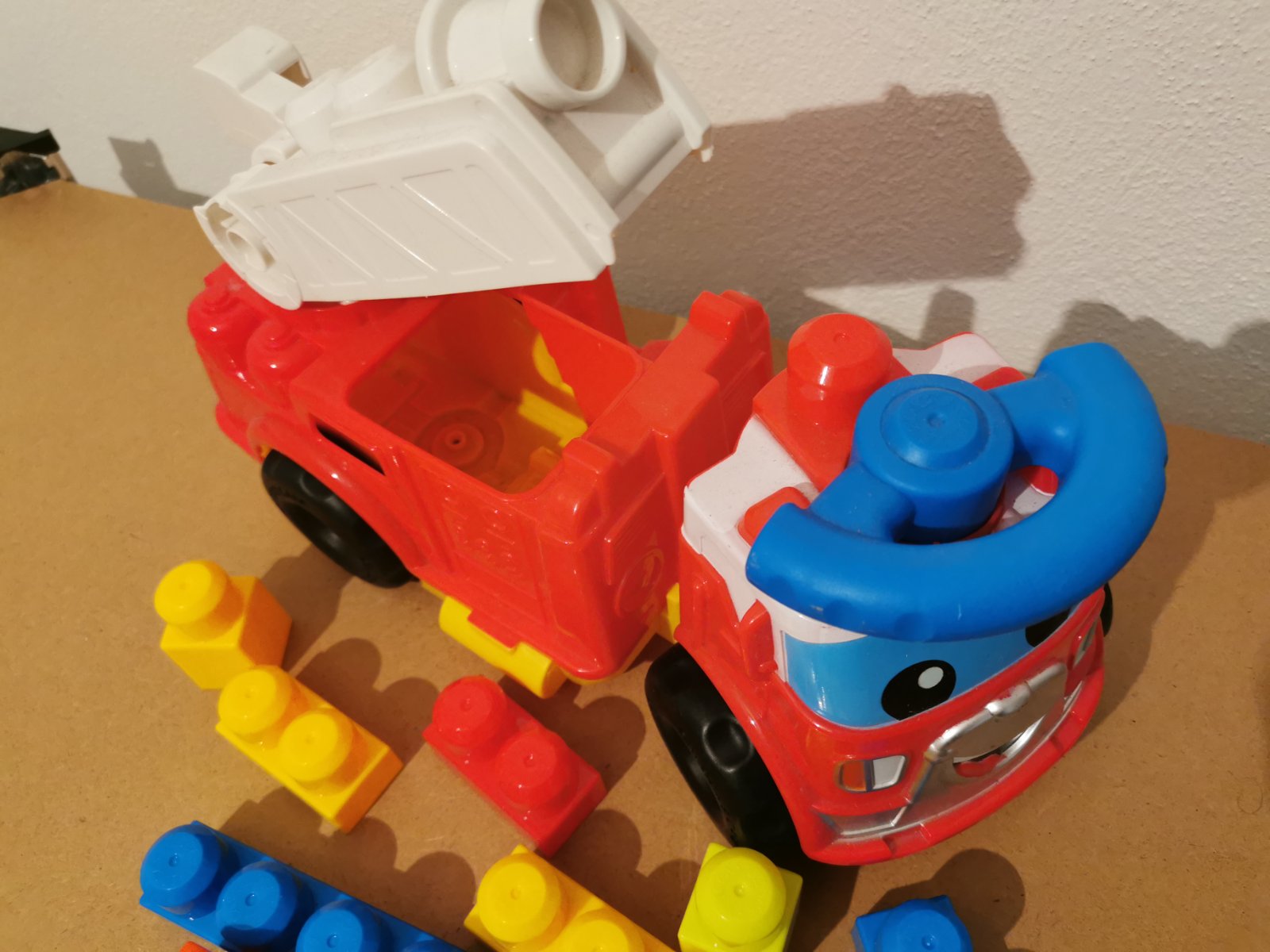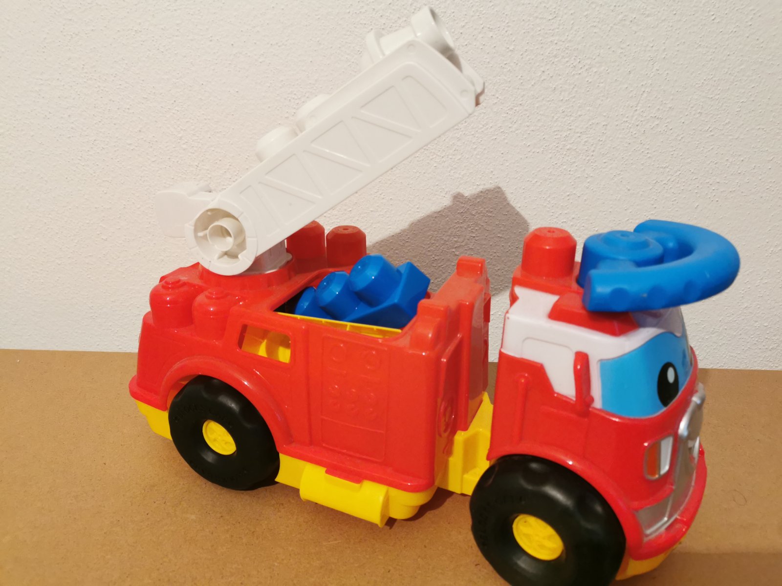 Hasičské auto s kockami vo výbornom stave, veľmi málo hrané, veľkosť 35x23x15cm. Rampa sa dá dvíhať, pod rampou je odkladací priestor na kocky, panáčika- hasiča viete dať na rampu, za volant, alebo z boku.