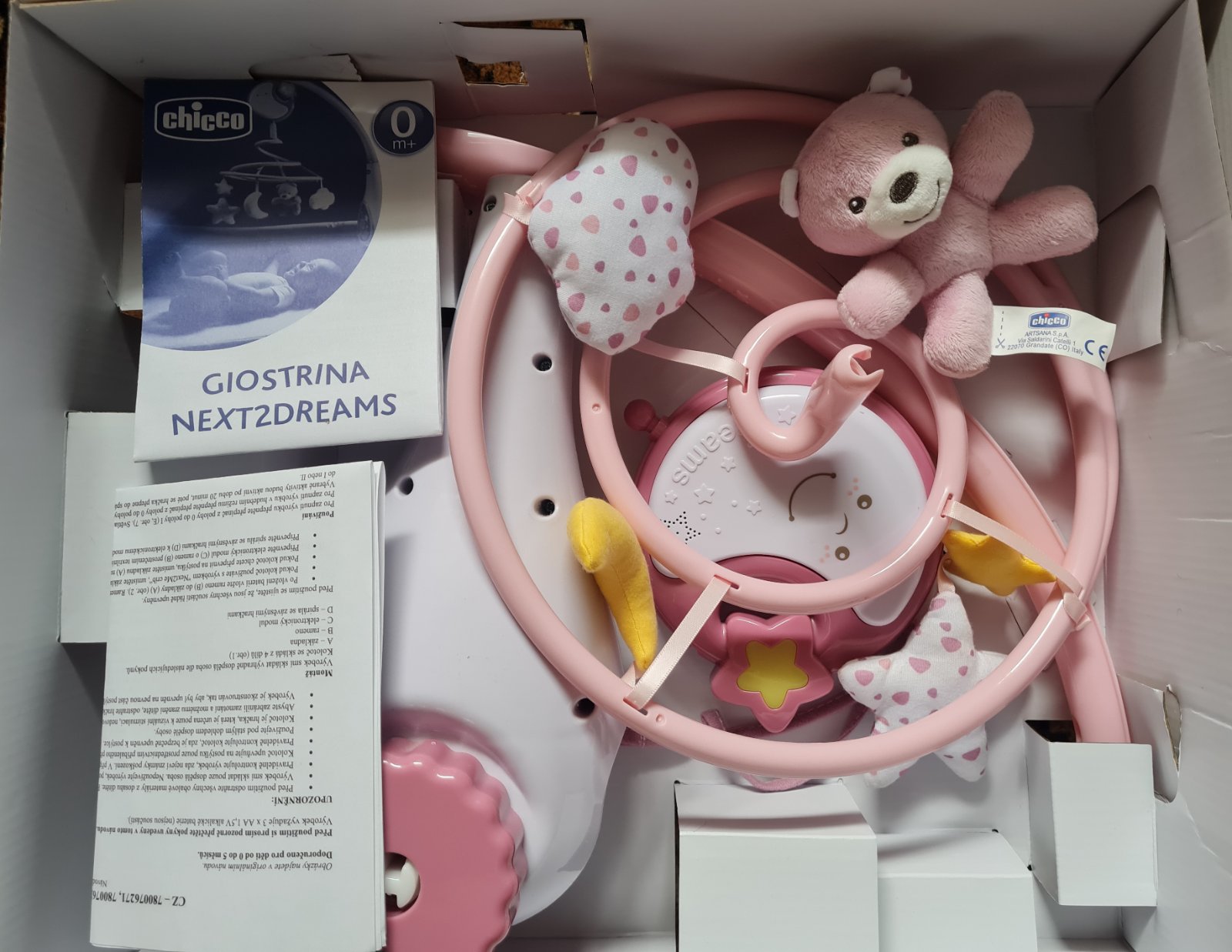 Hradci kolotoč na postieľku .kolotoč nebol nikdy použitý bola použitá iba skrinka ktorá vydáva hudbu. Závesné hračky suz látky.