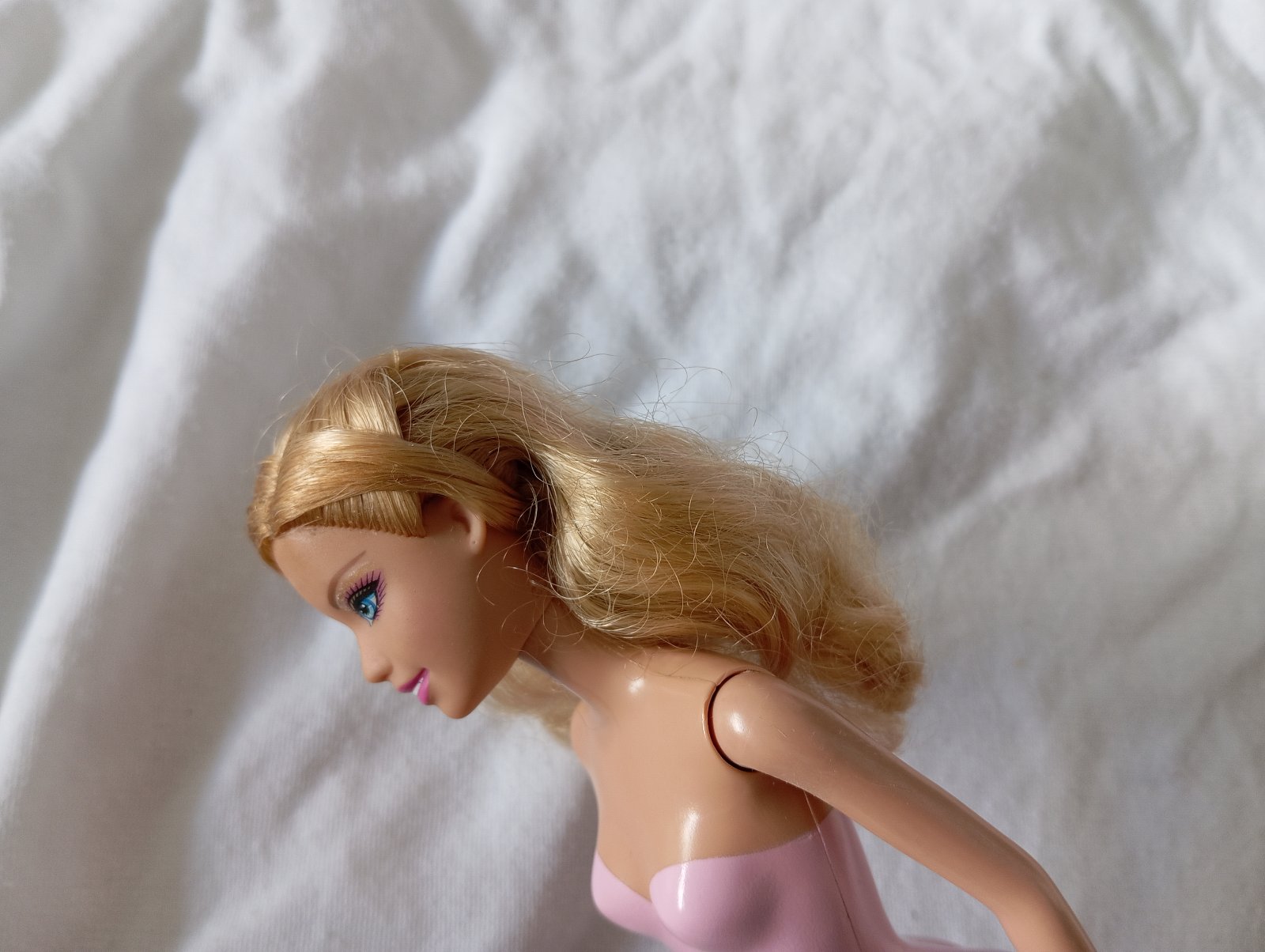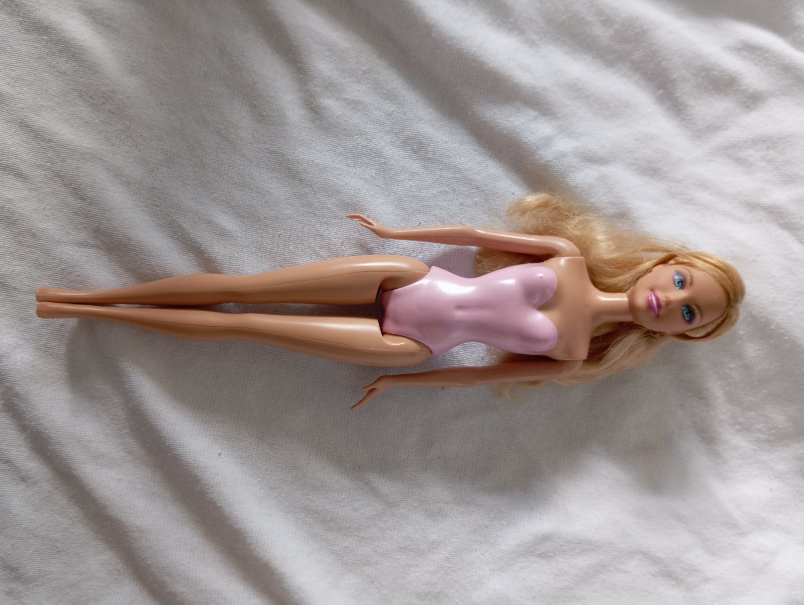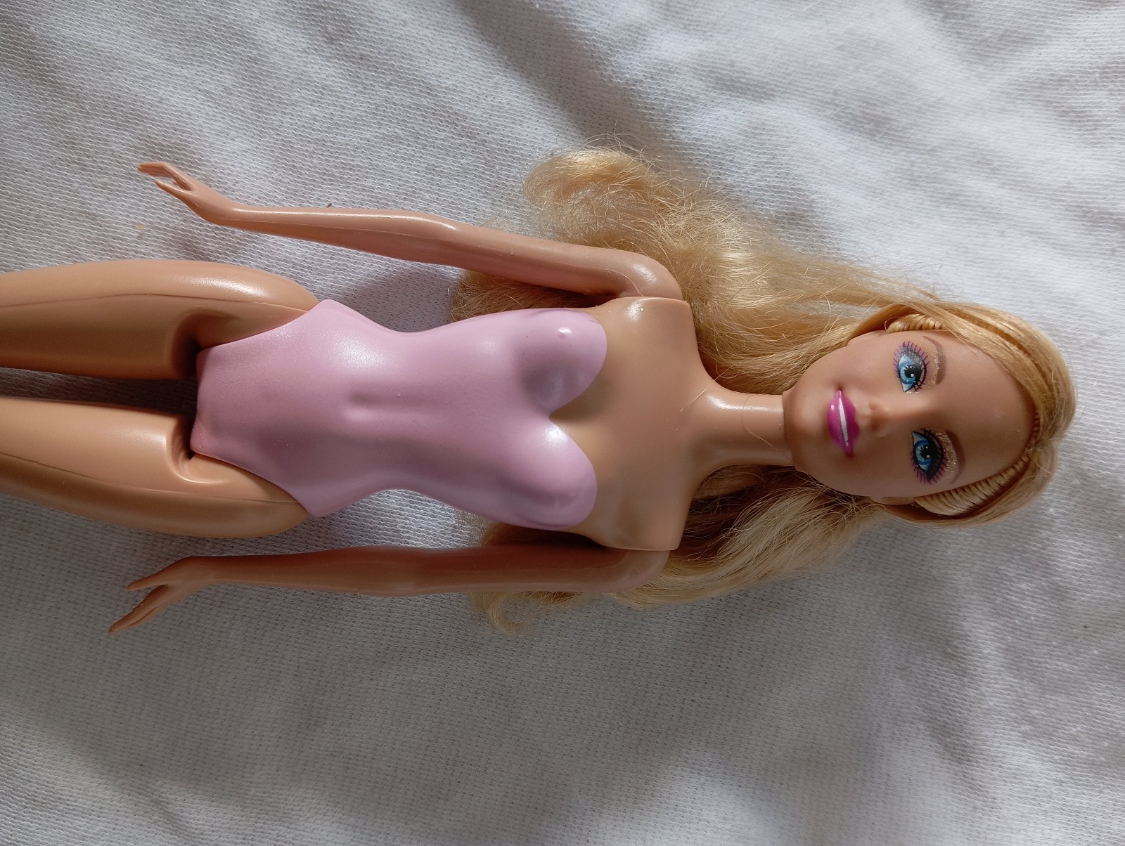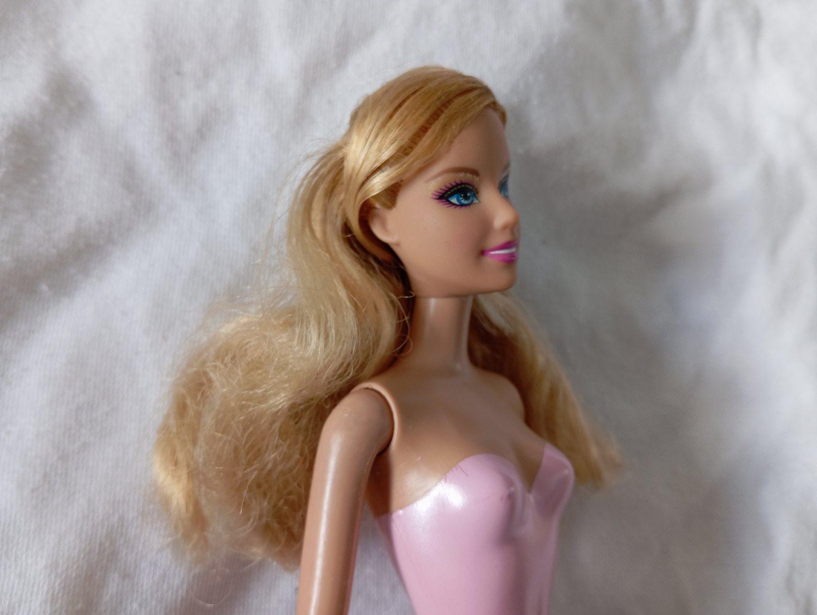 Barbie bábika s plastovým telom. Nie je ohybná v kolenách. Ružový trikot má na tele vytlačený, nedá sa jej vyzliecť.