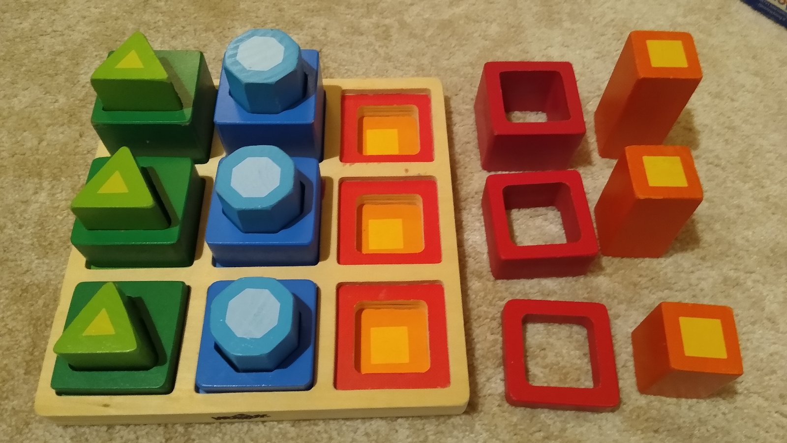 Predám krásnu drevenú montessori vkladačku, na učenie hĺbky, výšky, farieb, tvarov.